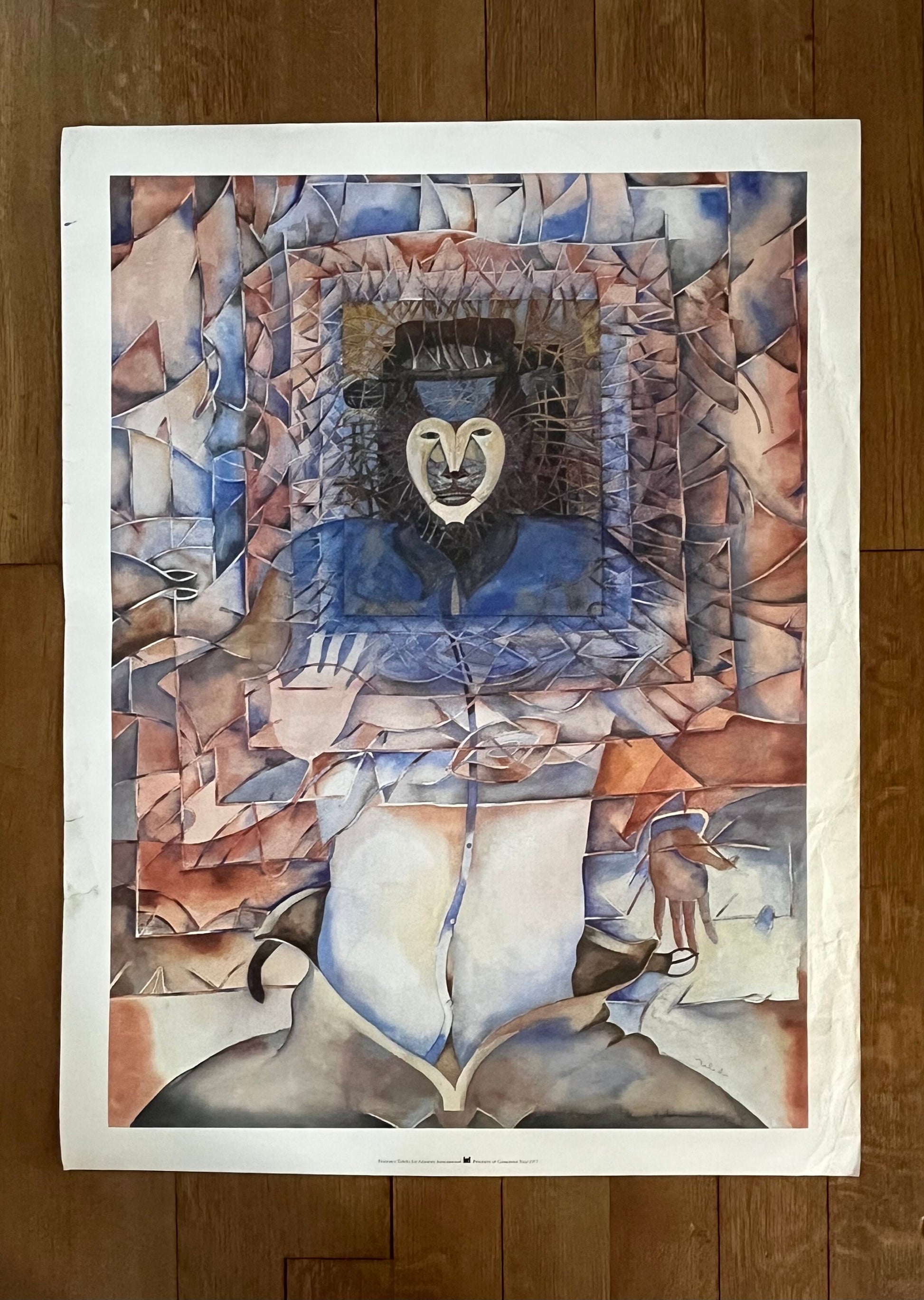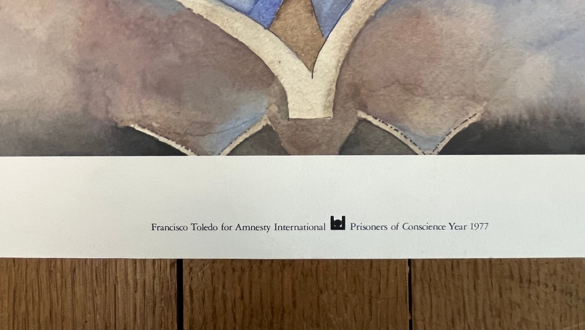 This is one of the original posters comissioned by Amnesty International for the Year of the prisoner of conscience in the year 1977 featuring a work by Francisco Toledo.
