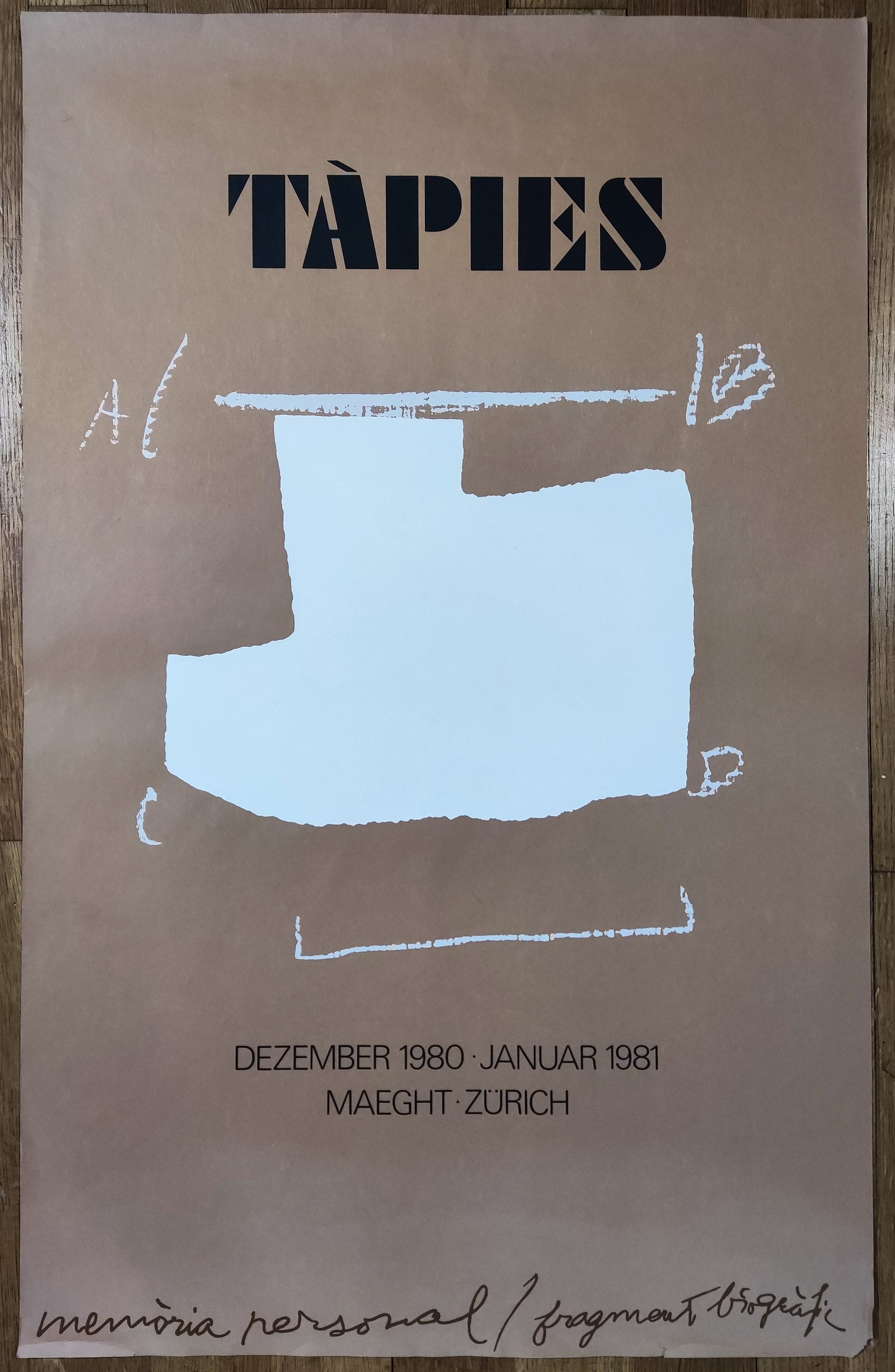 This is an original silkscreen-lithography art poster by Antoni Tàpies featuring a brown and white artwork and advertising an exhibition at the Gallerie Maeght in Zurich in 1980-81.