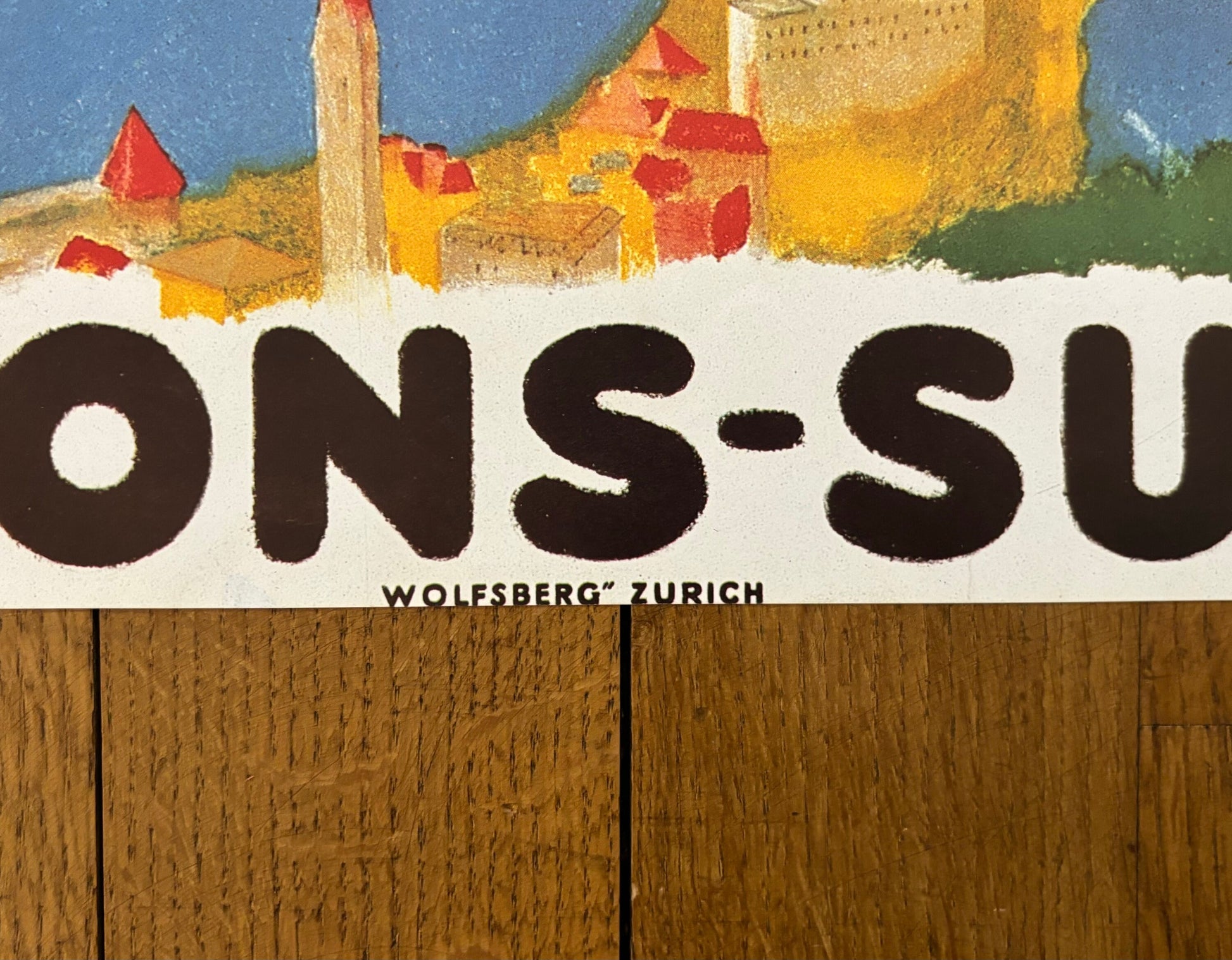 This is an original art poster by the Swiss Augusto Giacometti featuring an artwork of a red parasol infront of a mountain scenery. The poster was part of a marketing campaign by the Rhaetian Railway, advertising the Swiss Canton of Graubünden.