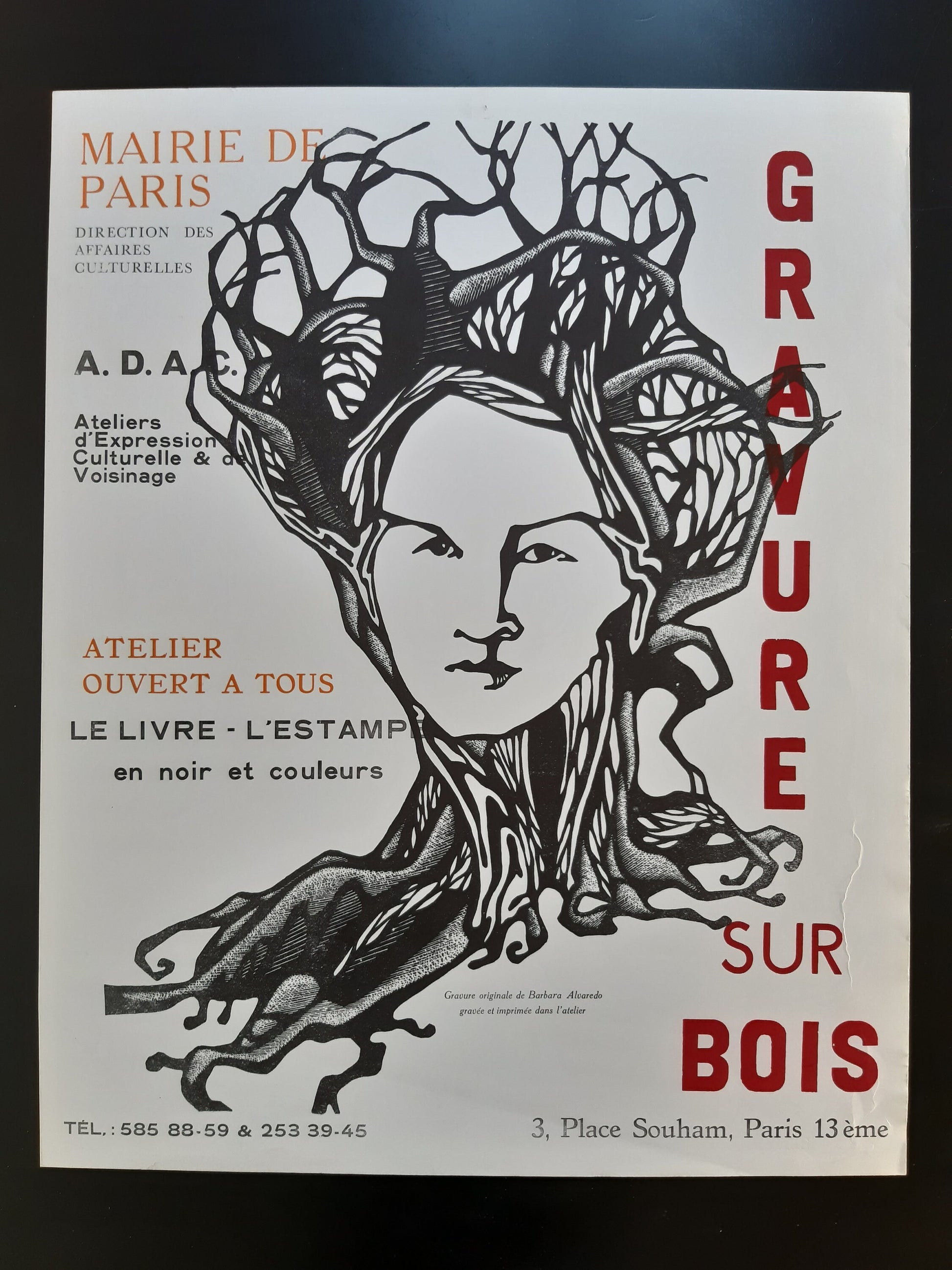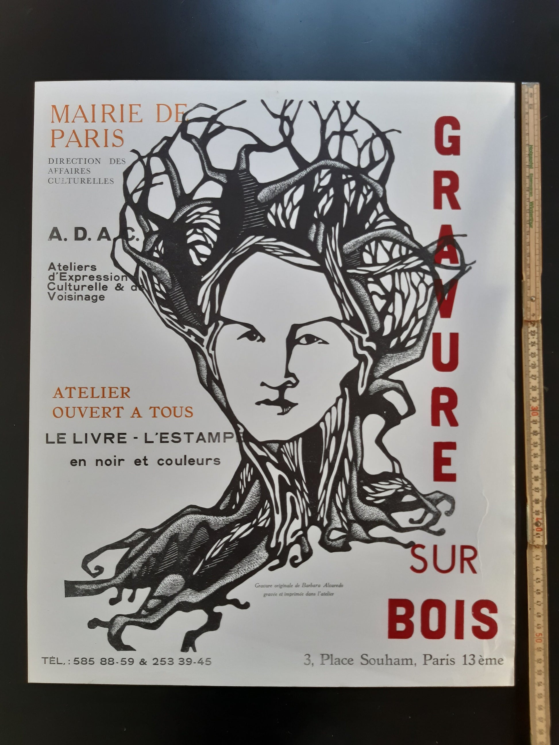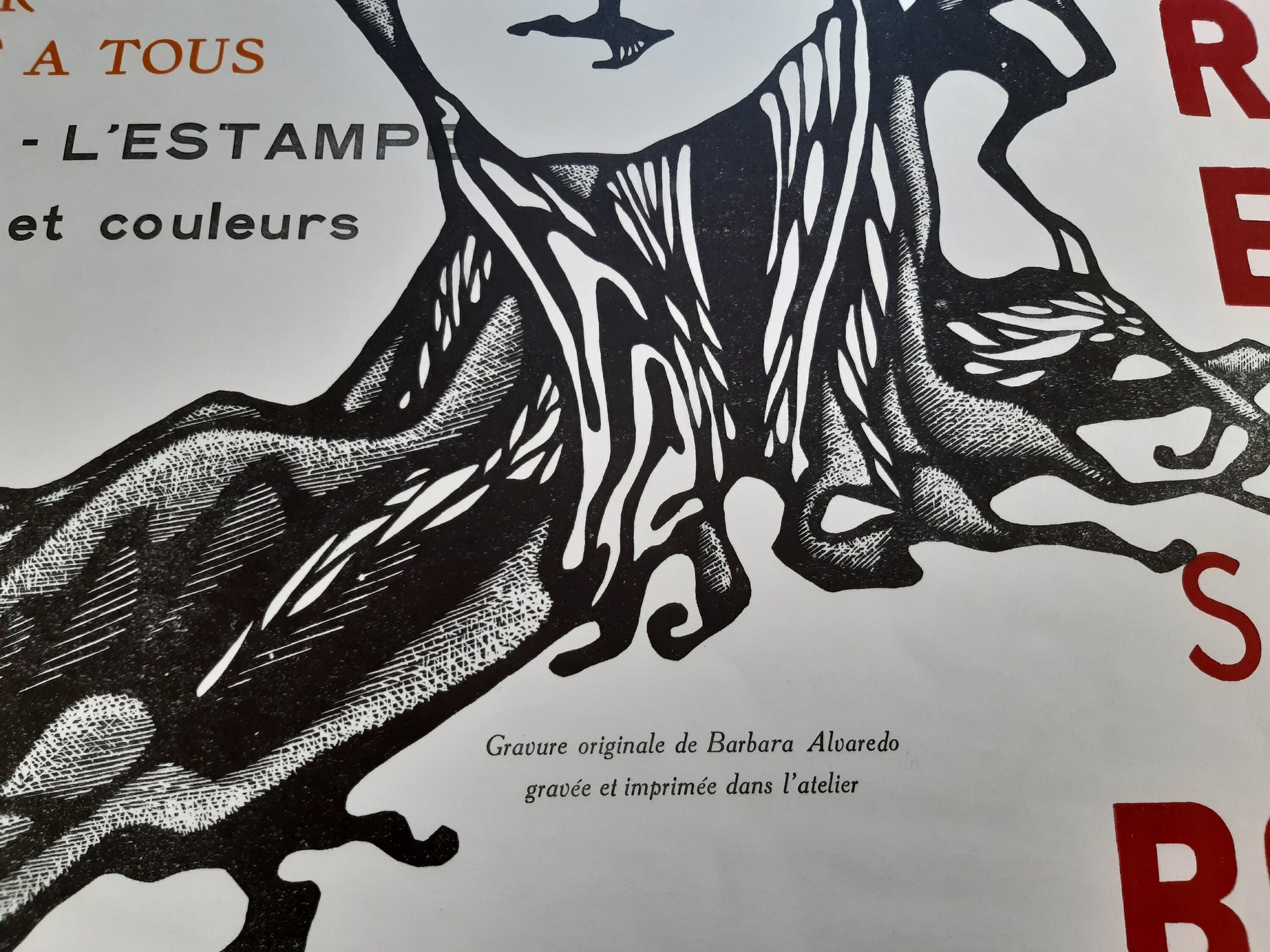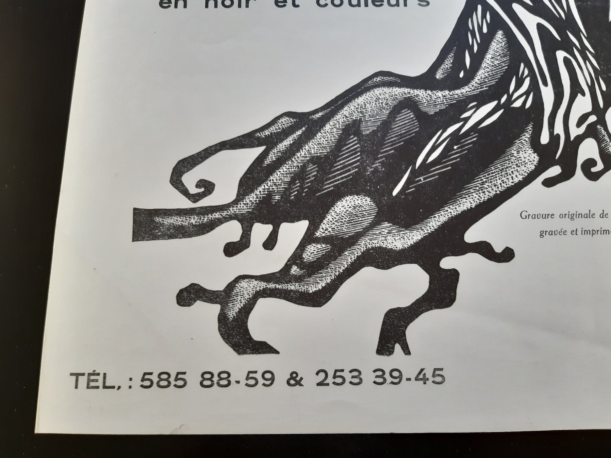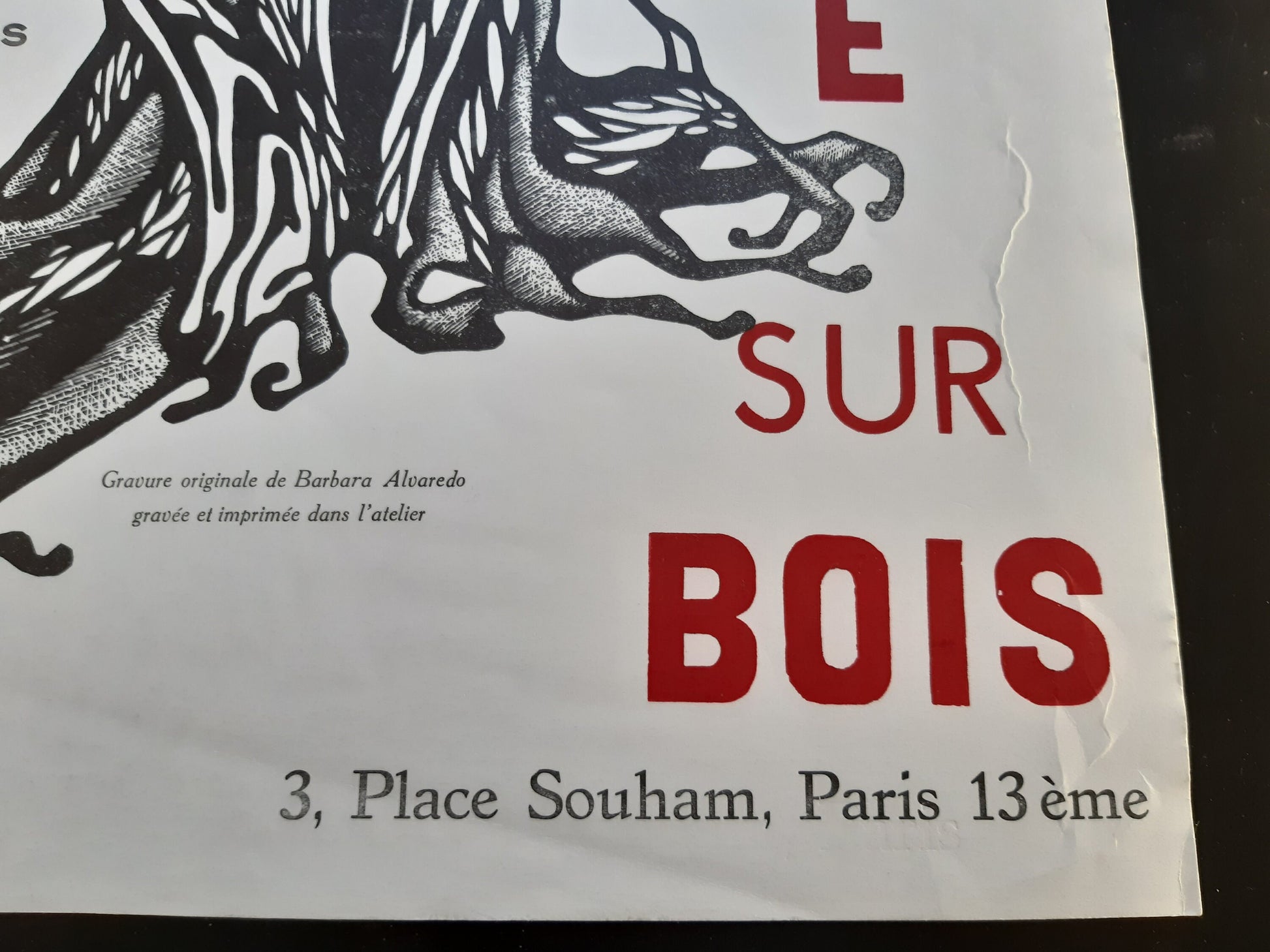 This is an original vintage art poster with a wood print made in an atelier in Paris maybe in the 1980ties. It is in good condition with some pinholes and knitters.