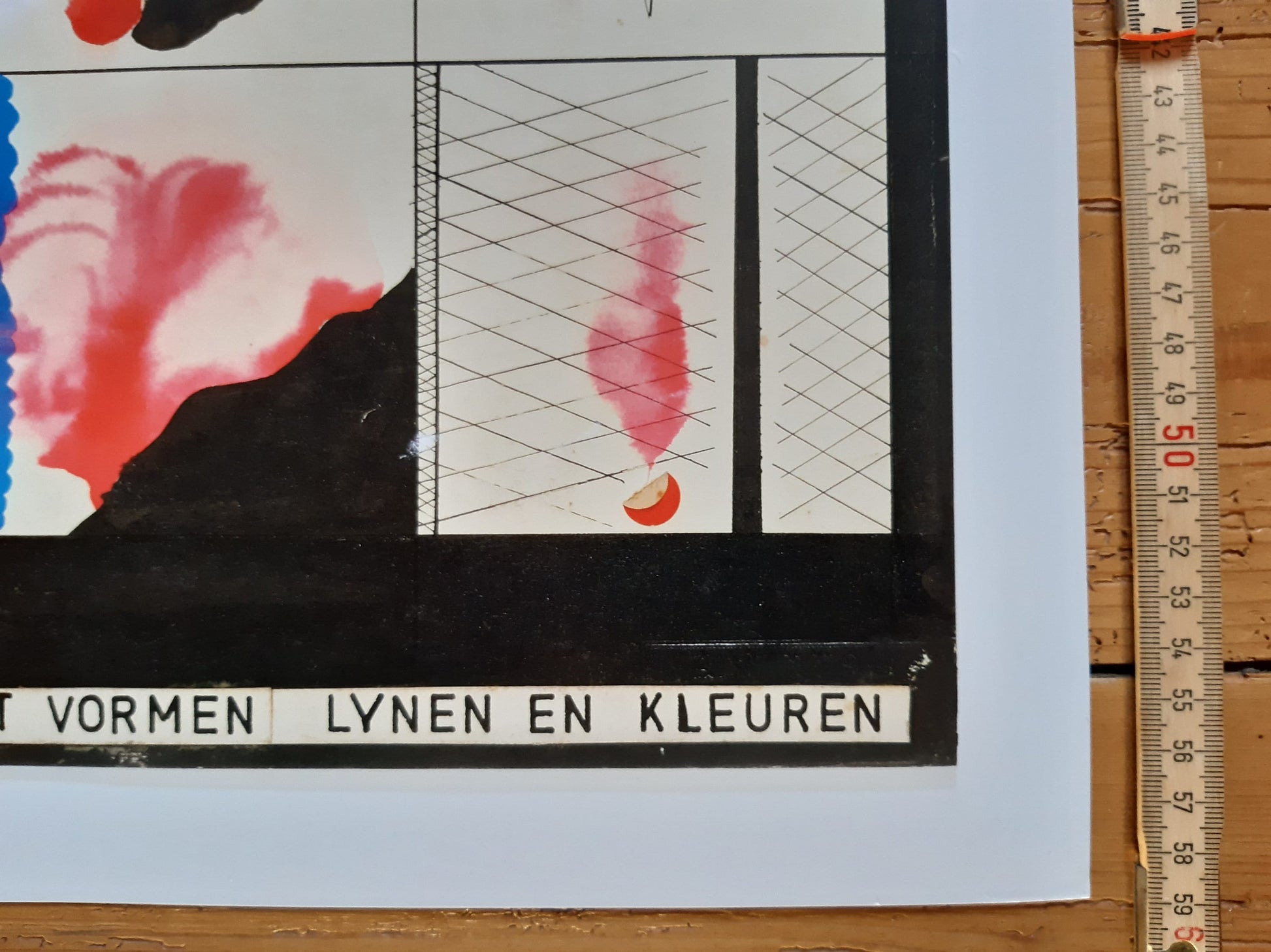 Original art print advertising the Bauhaus collection at the Museum Boijmans Van Beuningen in Rotterdam, Netherlands. It features pannels painted by pupils of the Bauhaus School in the 1930ties.