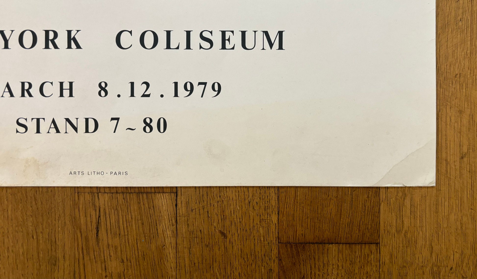 This is a beautiful art poster featuring a side-portrait of a woman wearing a fancy hat and holding a pear chain in her hand. The poster was part of an exhibition at the Coliseum in New York in 1979.