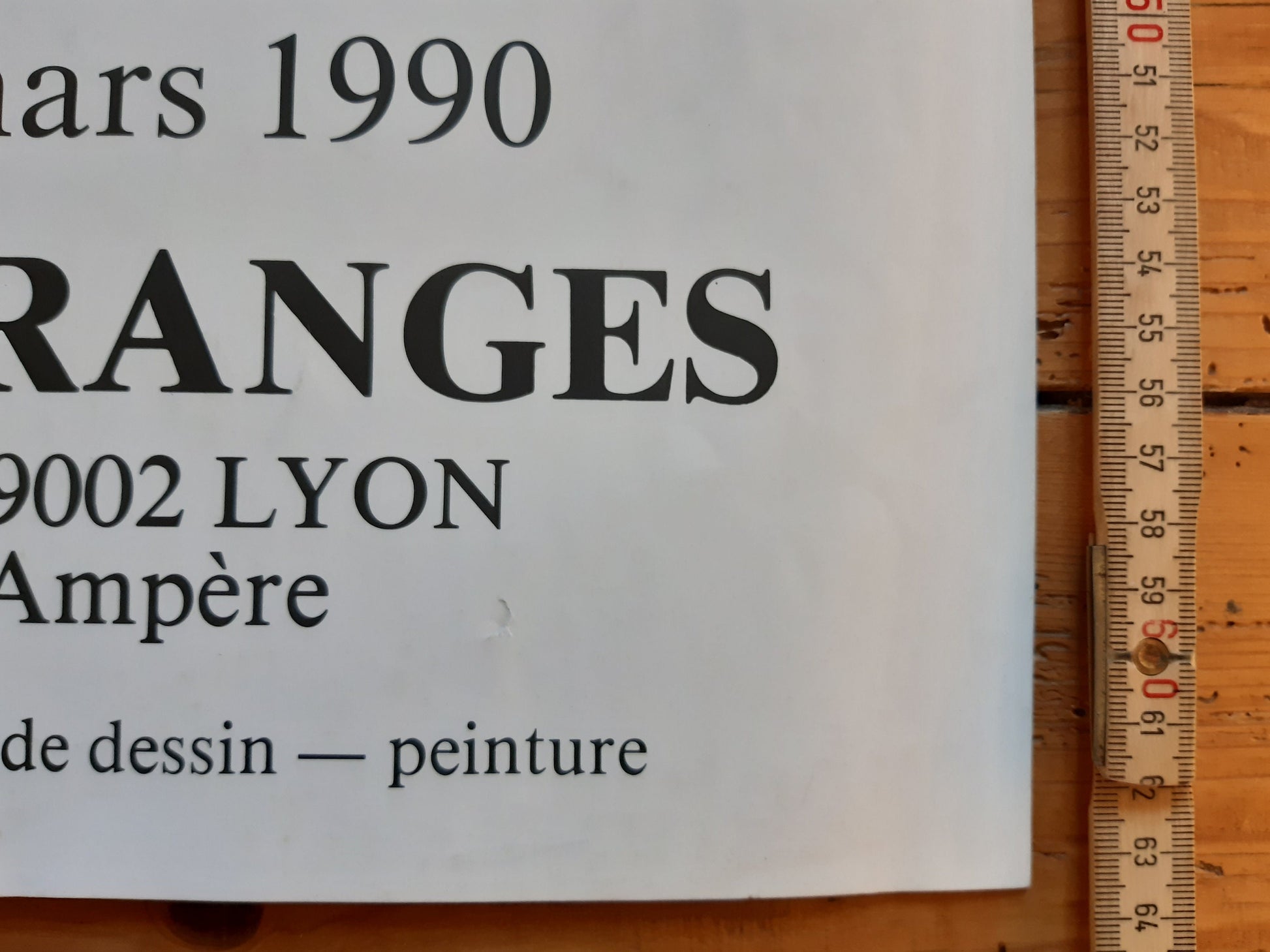 Original art poster with an artwork by Cécile Tarel, a French sculptor artist, born 1946. The poster has been designed for an exhibition in Lyon, France, in 1990. The poster is in used condition, notable some pinholes and general handling marks.