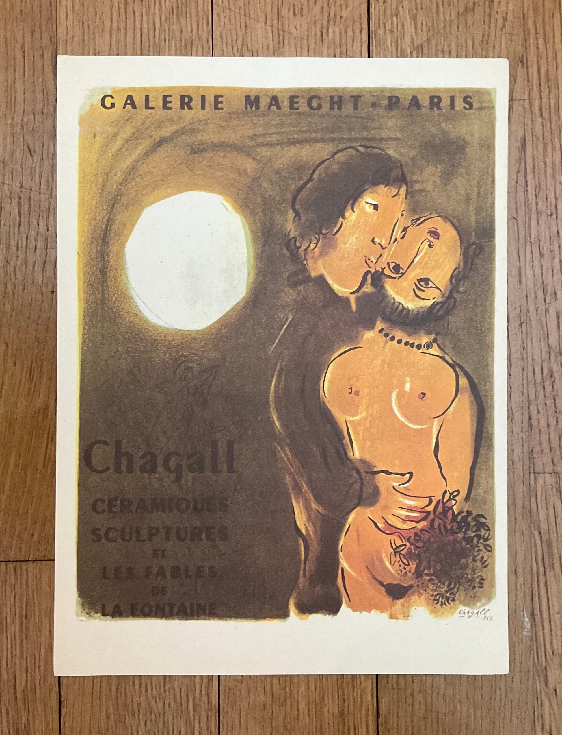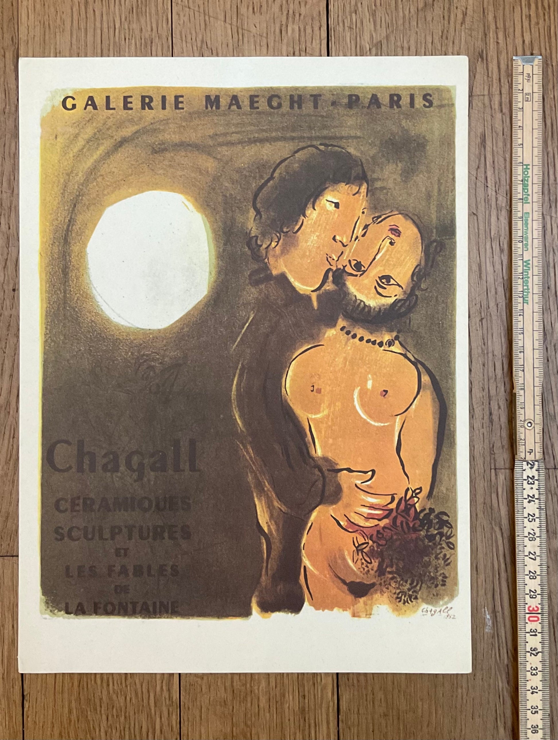 The Galerie Maeght released this original art poster by Chagall in Paris. Marc Chagall (1887-1985) was a Russian-French artist. He was associated with several major artistic styles and created works in a wide range of artistic formats, including painting, drawings, book illustrations, stained glass, stage sets, ceramics, tapestries, and fine art prints.