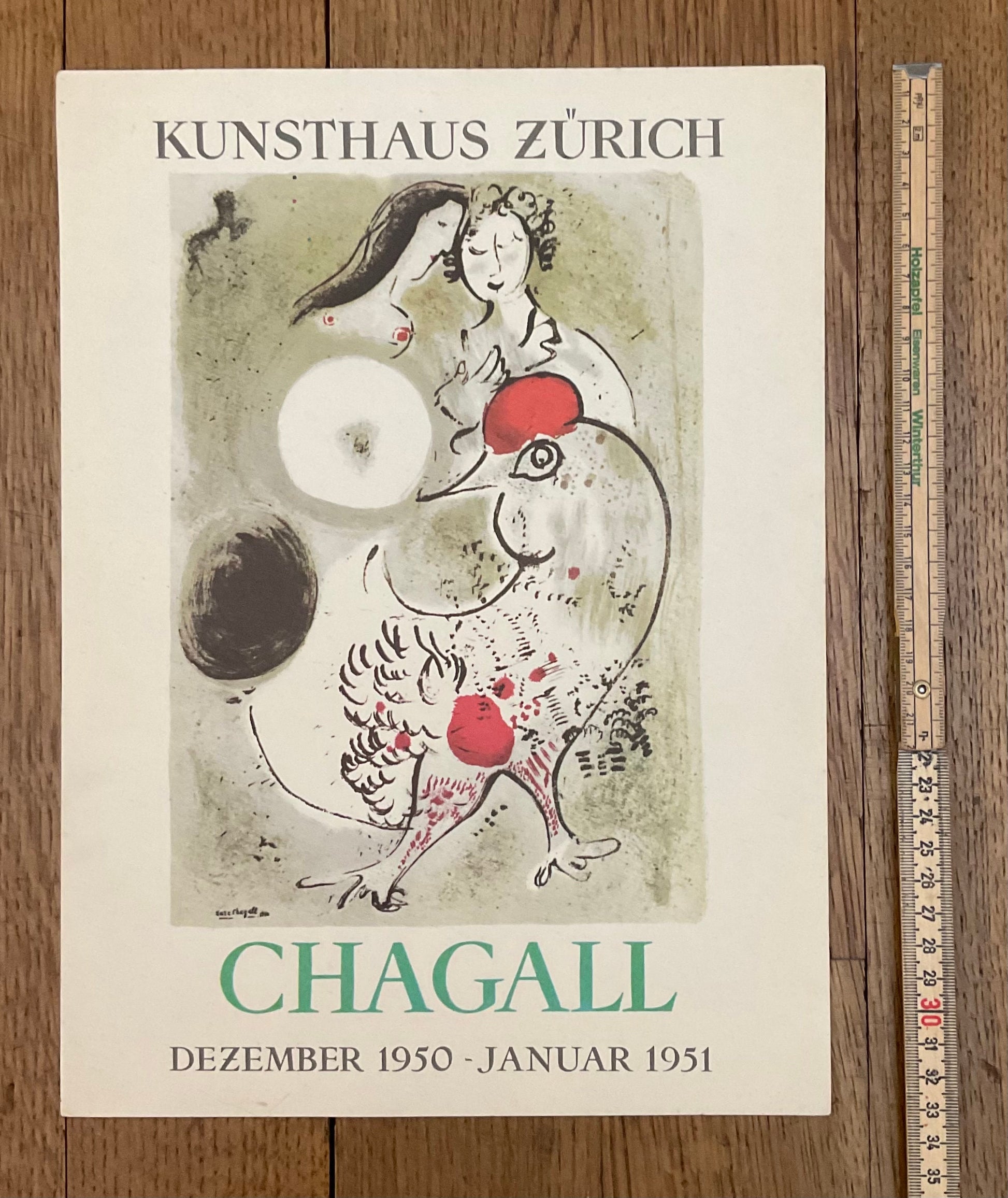 This original art poster by Chagall was released by the Kunsthaus Zürich in 1951. Marc Chagall (1887 -1985) was a Russian-French artist, an early modernist, he was associated with several major artistic styles and created works in a wide range of artistic formats, including painting, drawings, book illustrations, stained glass, stage sets, ceramics, tapestries, and fine art prints.