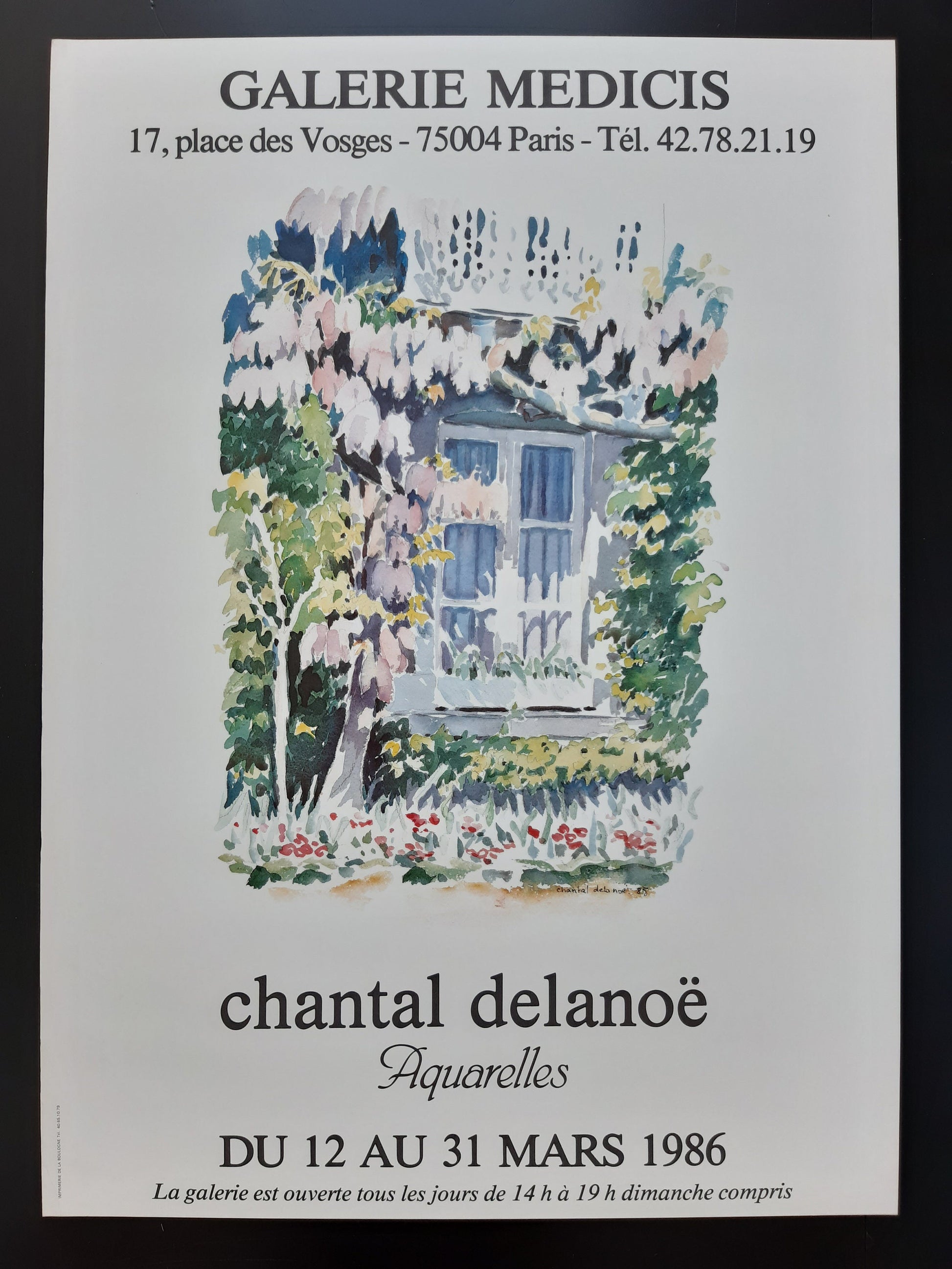 This is an art poster released for an exhibition at the Galerie Medicis in Paris, France in 1986, featuring an aquarelle painted by Chantal Delanoe (born 1943), a french female painter.