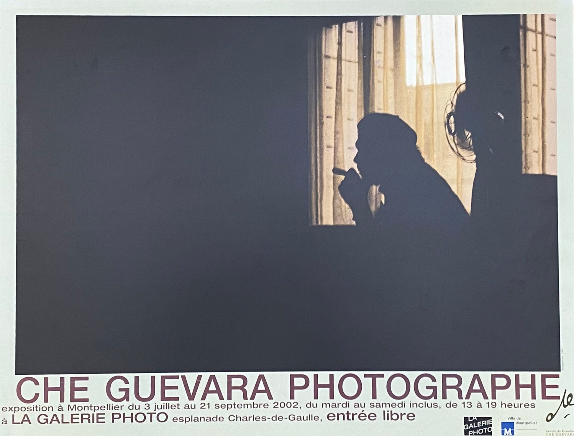This is an original art poster featuring an artwork of the outline of a man smoking a cigary, who is presumably Che Guevara. Ernesto "Che" Guevara (* officially June 14, 1928, according to other sources May 14, 1928 in Rosario, Argentina; † October 9, 1967 in La Higuera, Bolivia) was a Marxist revolutionary, guerrilla leader and author. The poster has been published by "la Galerie photos" in Montpellier, France.