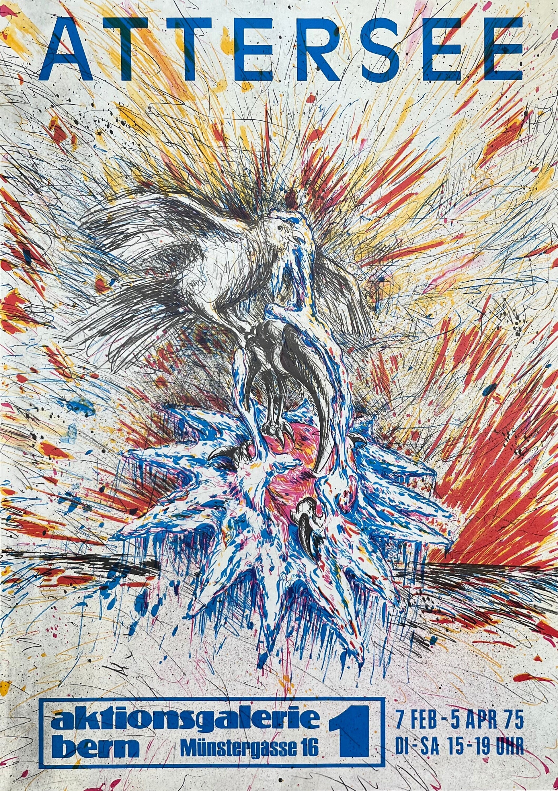 This is a beautiful art poster by austrian Christian Ludwig Attersee advertising an exhibition in Bern, Switzerland in 1975. It is in good condition with 1 horizontal and 1 vertical fold across the poster.