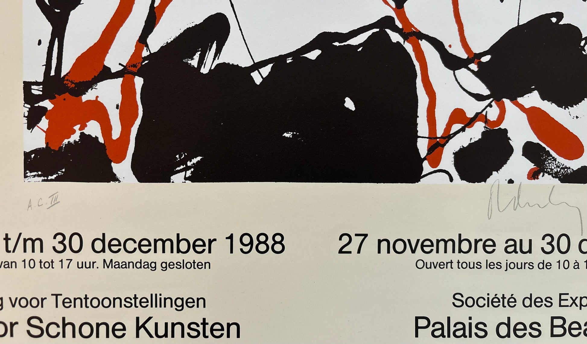 This is a beautiful silkscreen-lithography art poster by famous Claes Oldenburg featuring an abstract artwork with black and red color splashes and advertising an exhibition in Brussels in 1988.