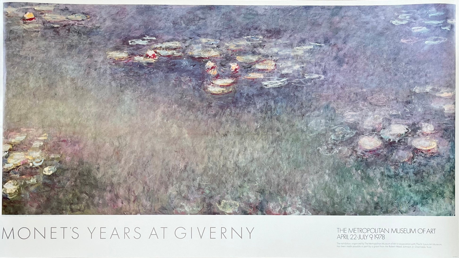 This is an original art poster by Claude Monet advertising an exhibition at the Metropolitan Museum of Art in 1978. It is in good condition with minimal signs of handling along the borders. It is printed on semi-glossy paper.