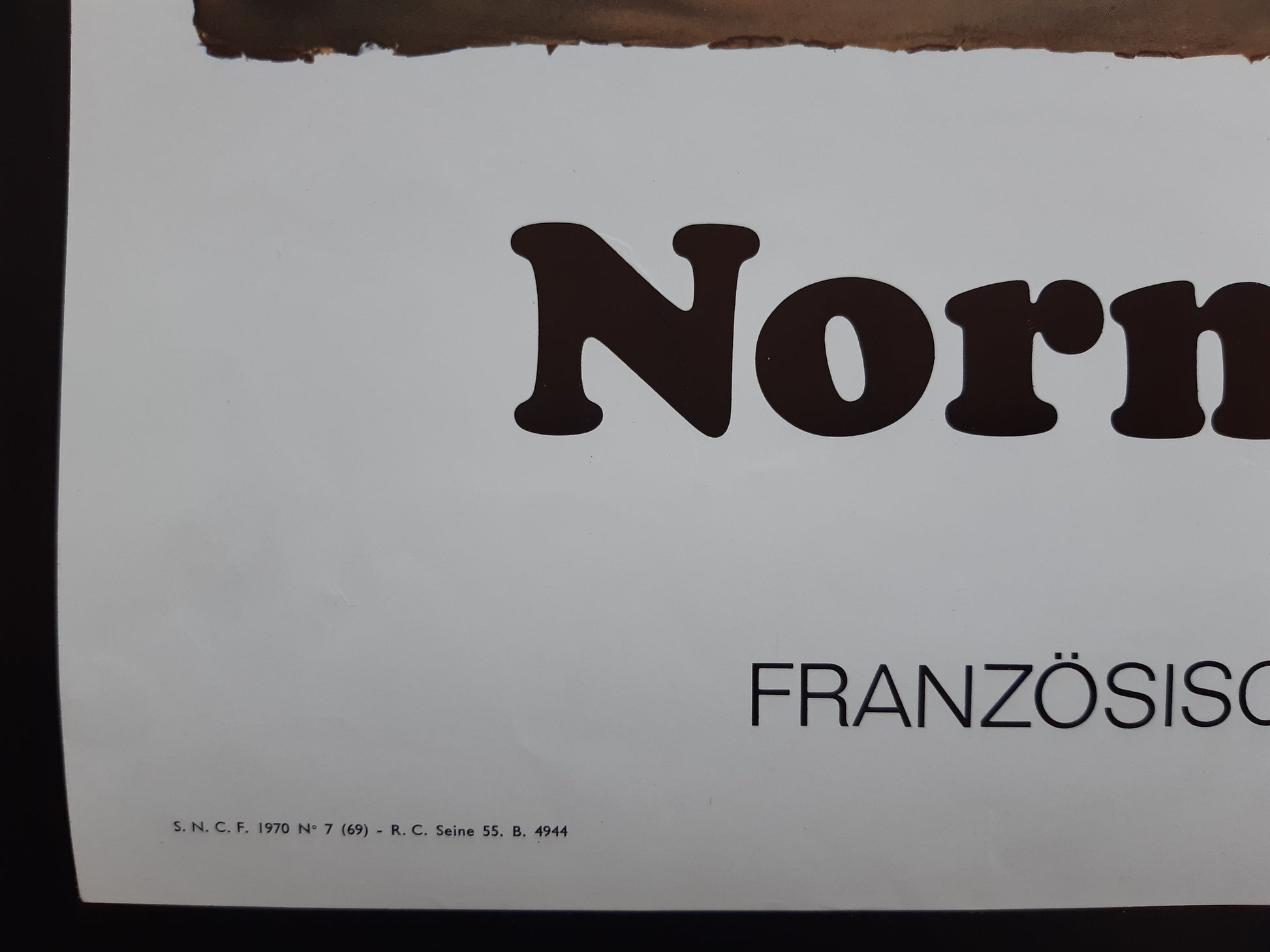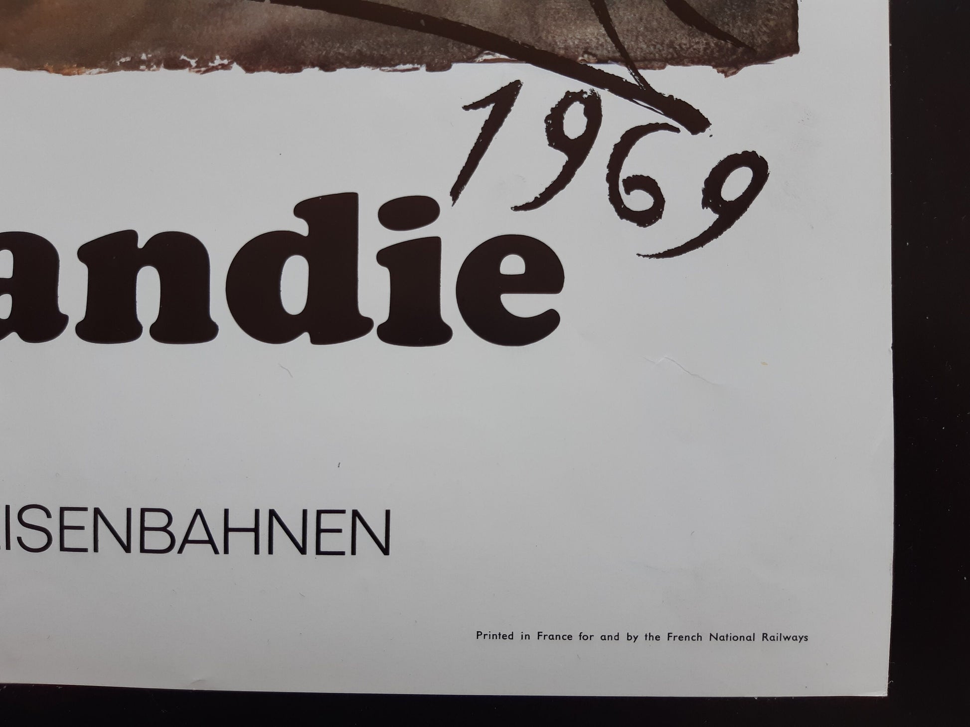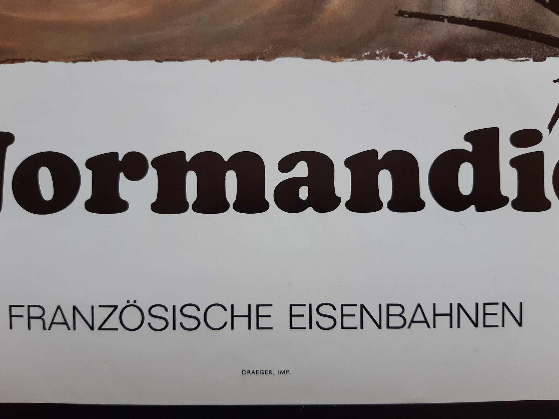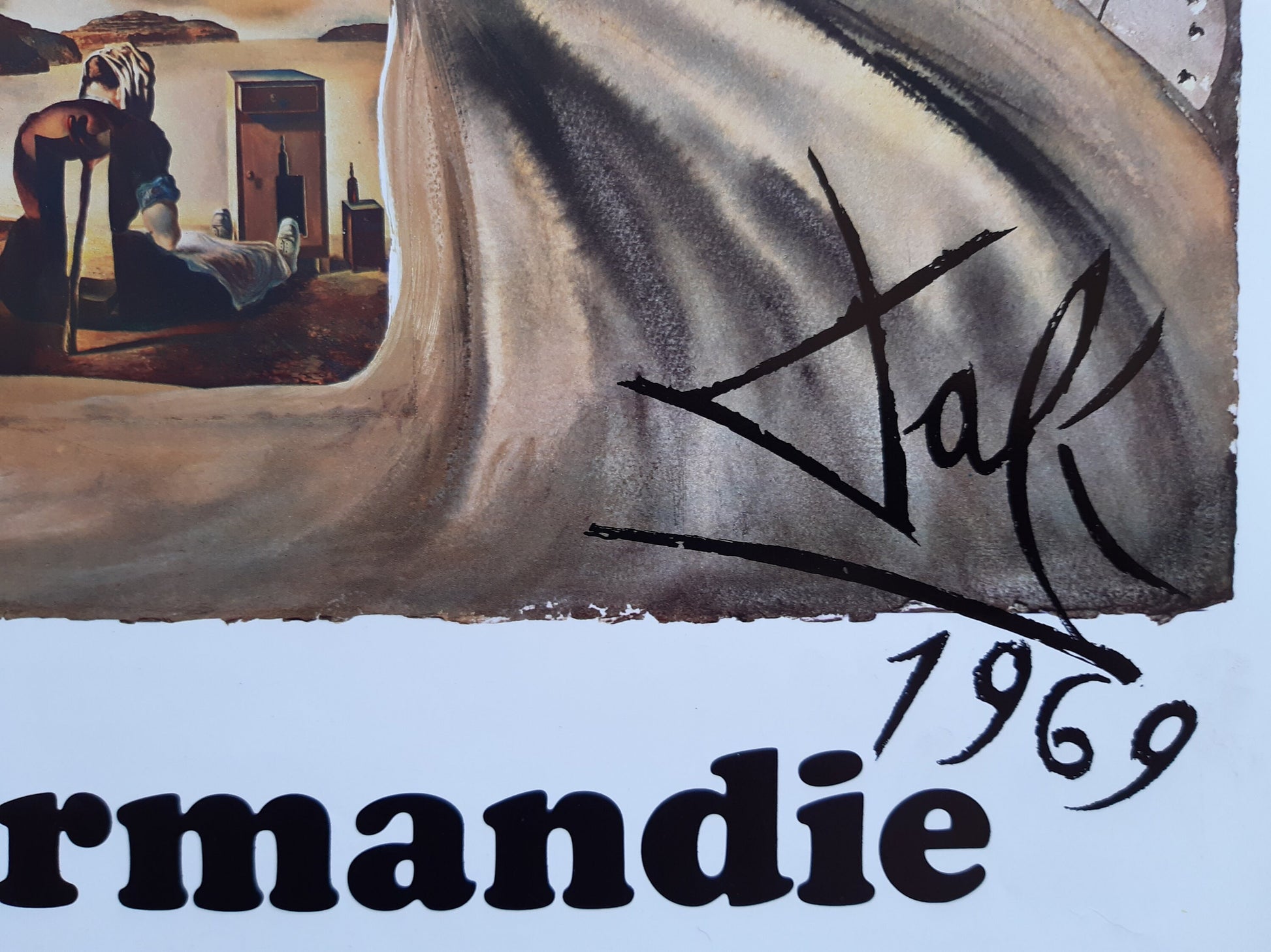 This is an original travel poster produced by the French national Railway company in the early 1970ties to advertise travelling by train to the area of Normandie. The art is by Salvador Dali. These posters have been produced in different sizes and with the text in different languages. For your consideration is a small edition with German text. Is is in used condition with very few signs of handling but minimal yelloing along the borders.