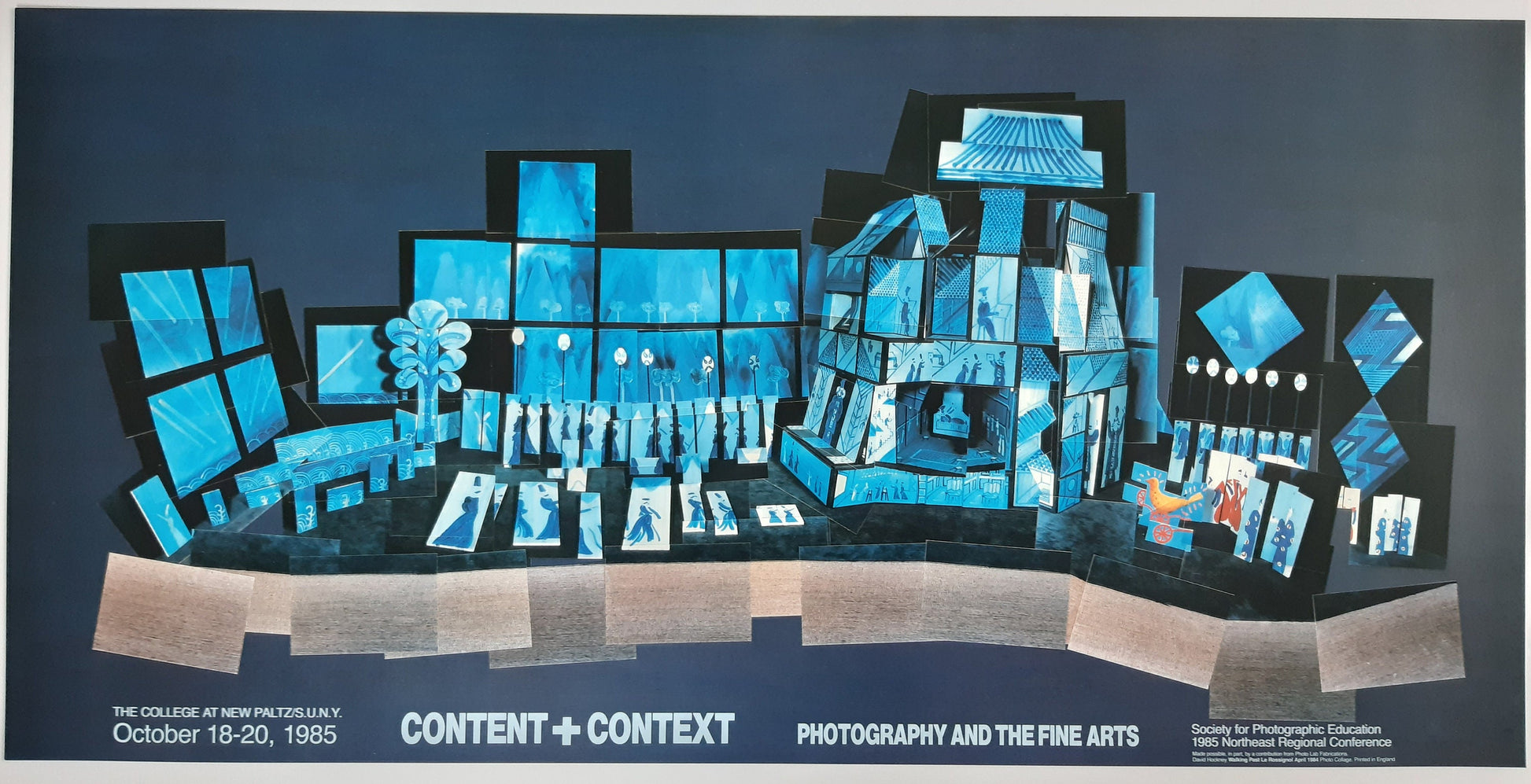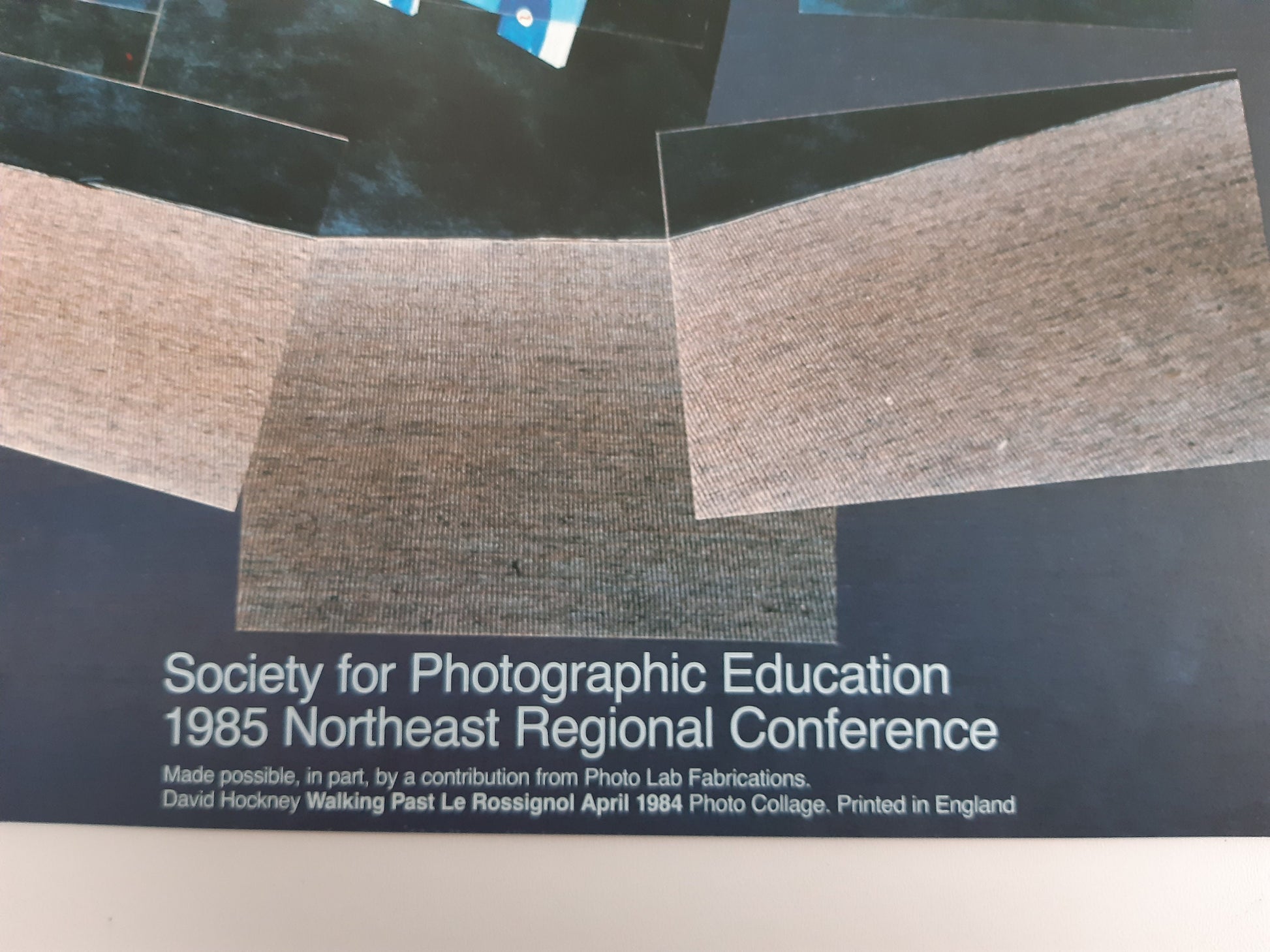 This is an original art poster by David Hockney. The image is a photographic 'joiner' entitled ' Walking Past Le Rossignol'. The poster was printed in 1985 to promote an event at The College at New Paltz, State University of New York.