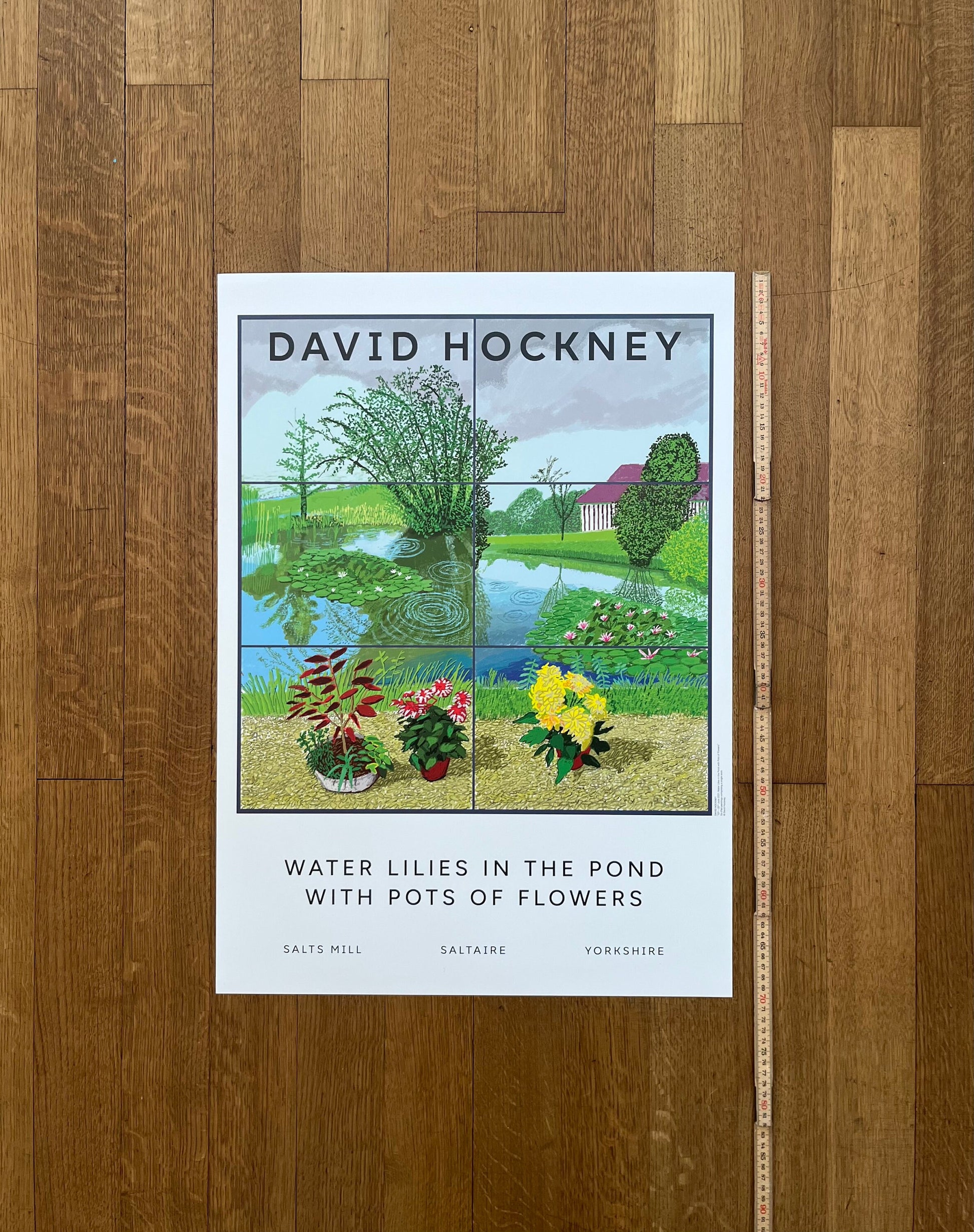 This is a beautiful art poster by David Hockney featuring an artwork with a pond and flowers. The poster is in good, near mint condition.