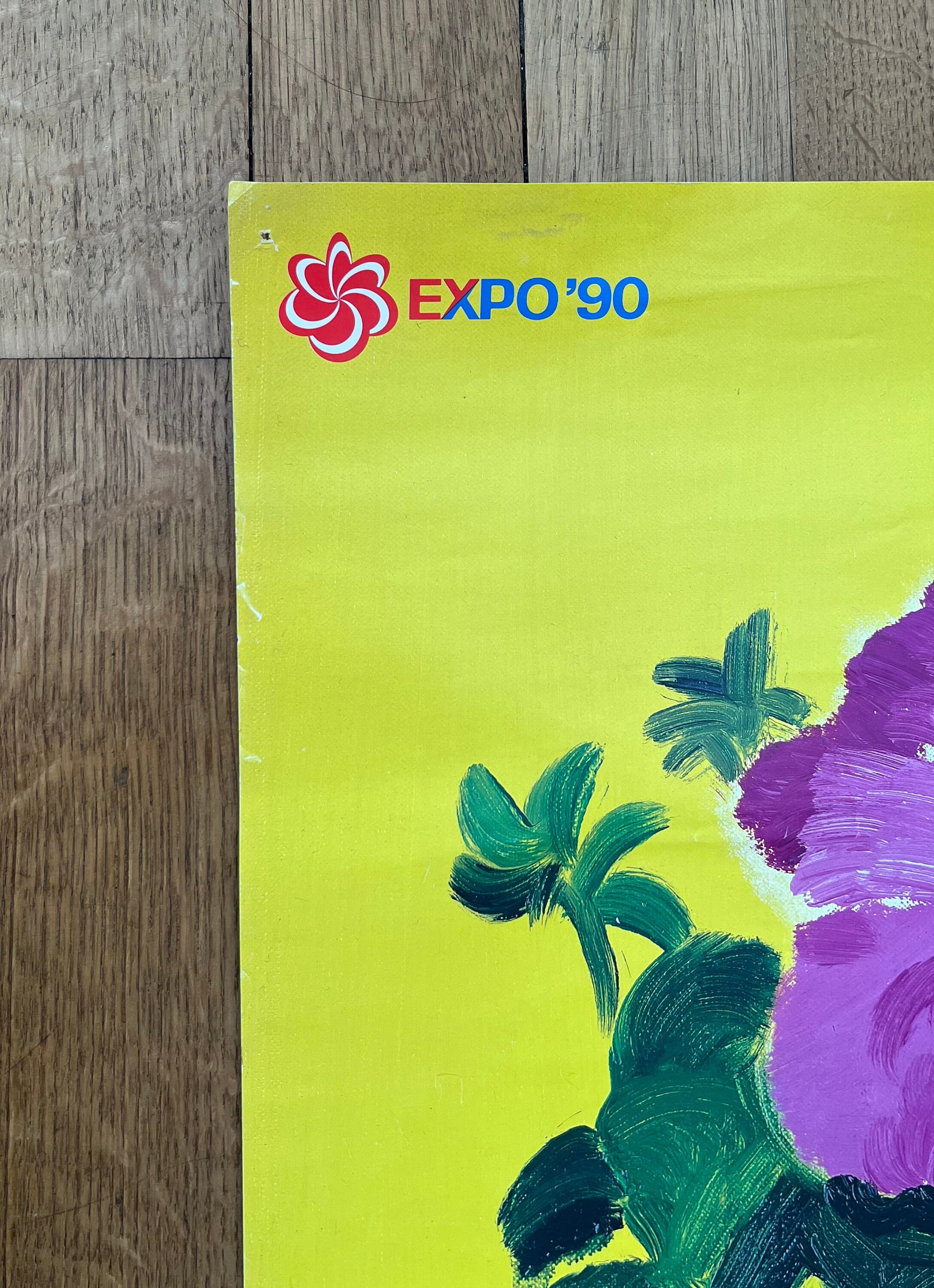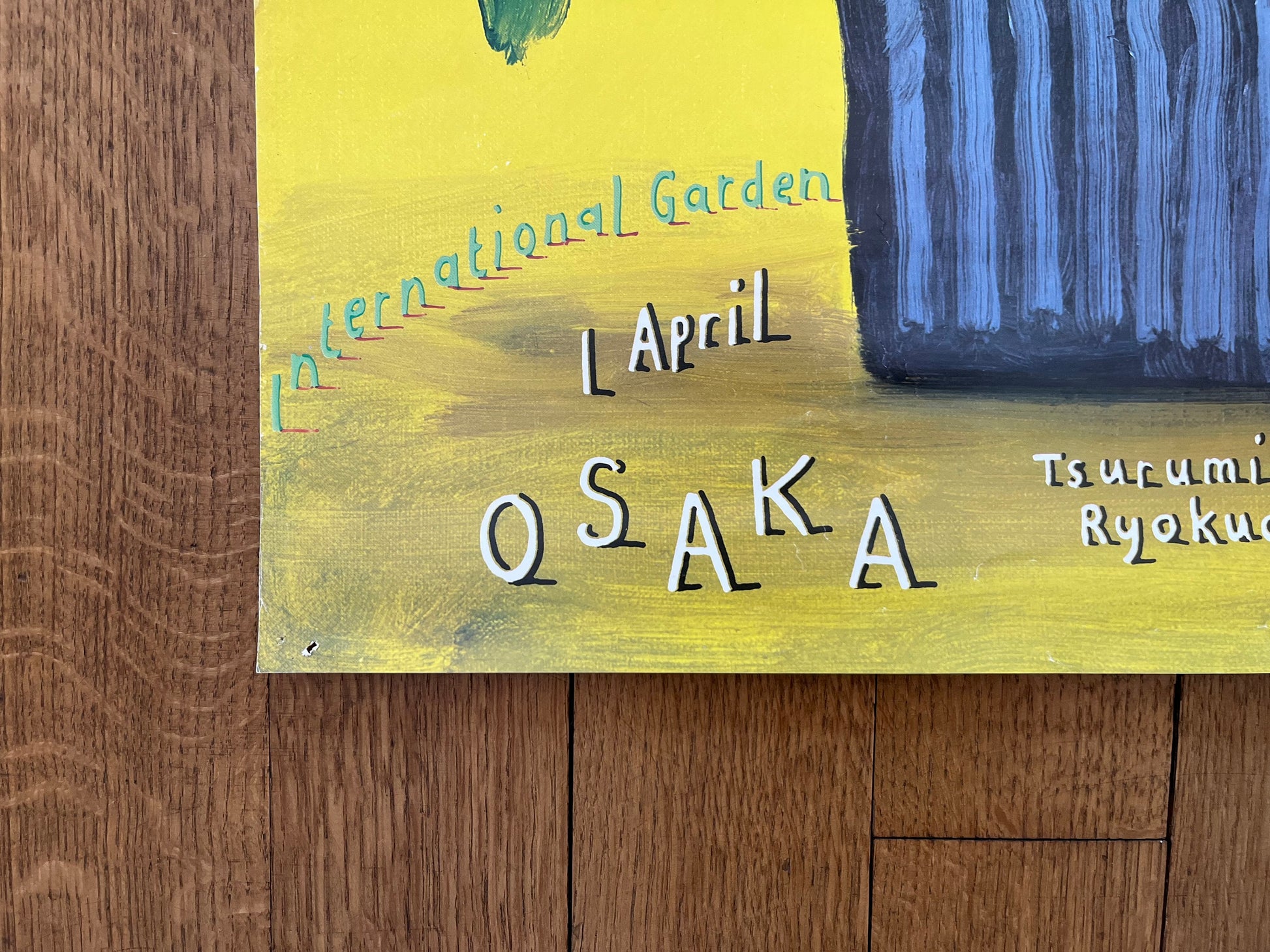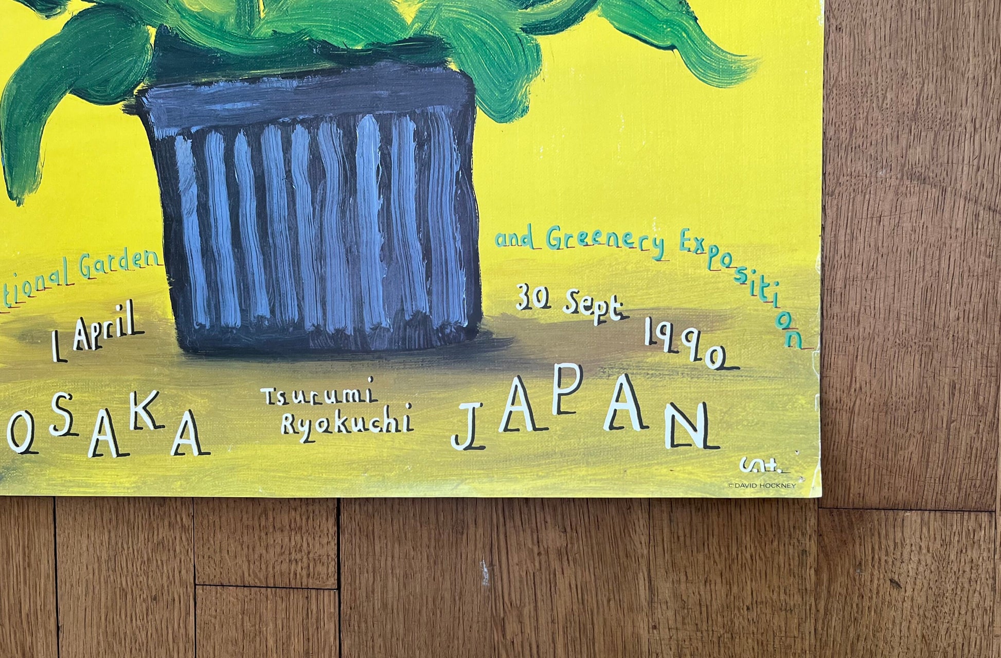 This is an original art poster by David Hockney which was released 1990 for an exhibition called International Garden and Greenery Exposition. The painting on the poster is called Tsurumi Ryokuchi, which is the name of a famous park near Osaka. The poster is listed as Nr. 191 in the poster book of Brian Baggott.
