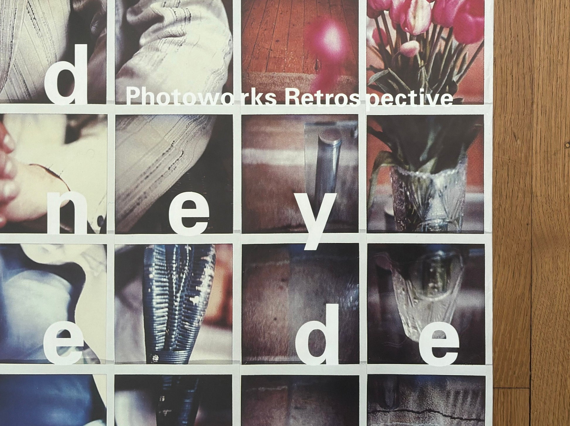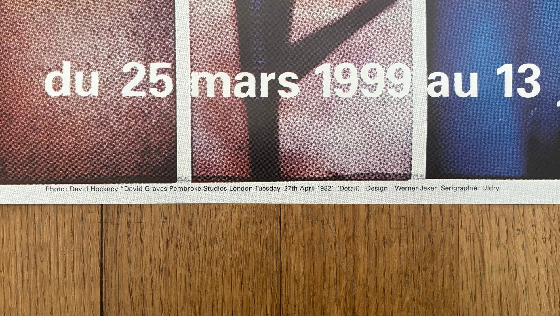This is a beautiful art poster by famous David Hockney featuring the "Photoworks Retrospective" by him and advertising an exhibition at the Musée de l'Elysée in Lausanne, Switzerland in 1999.
