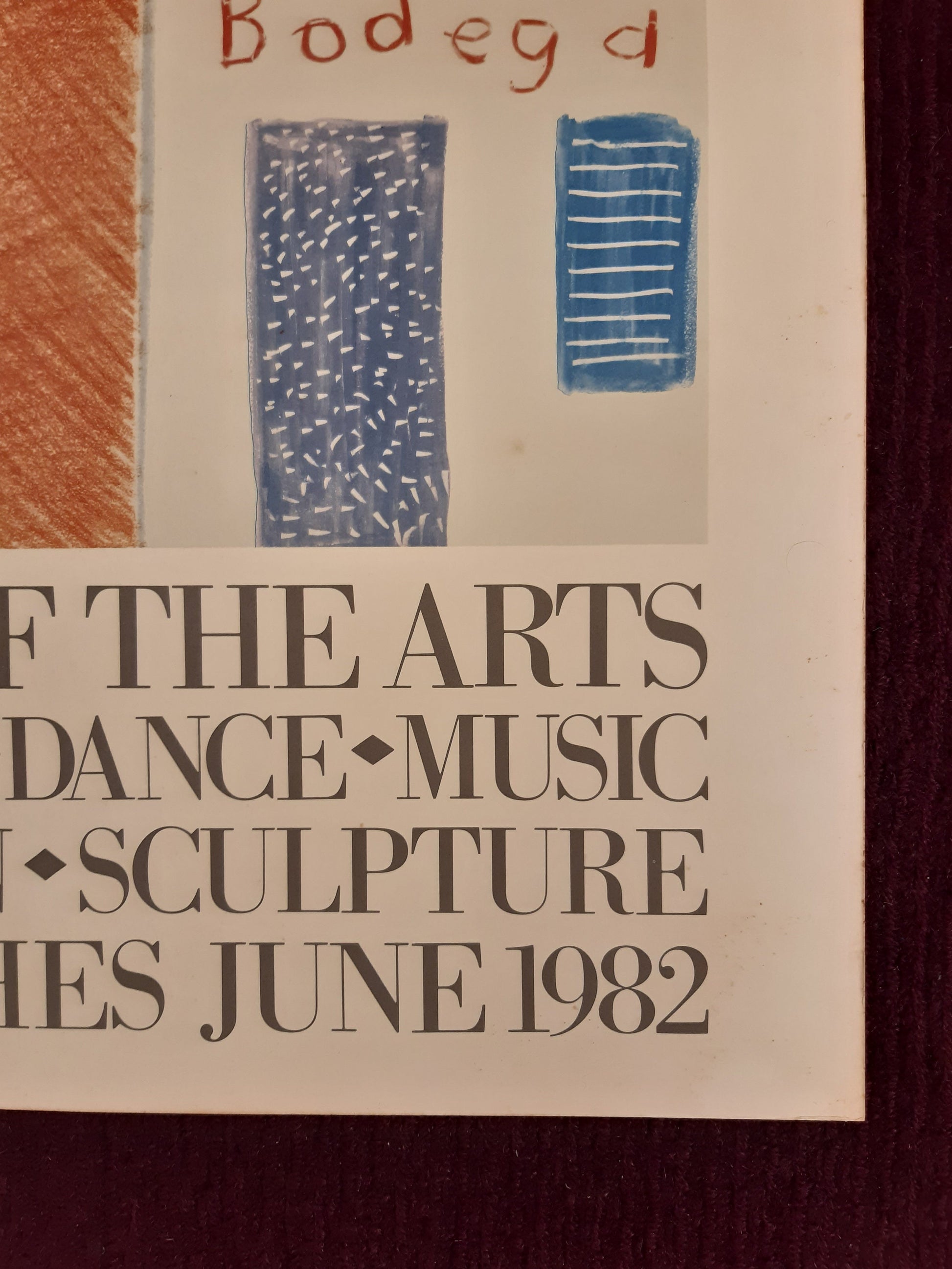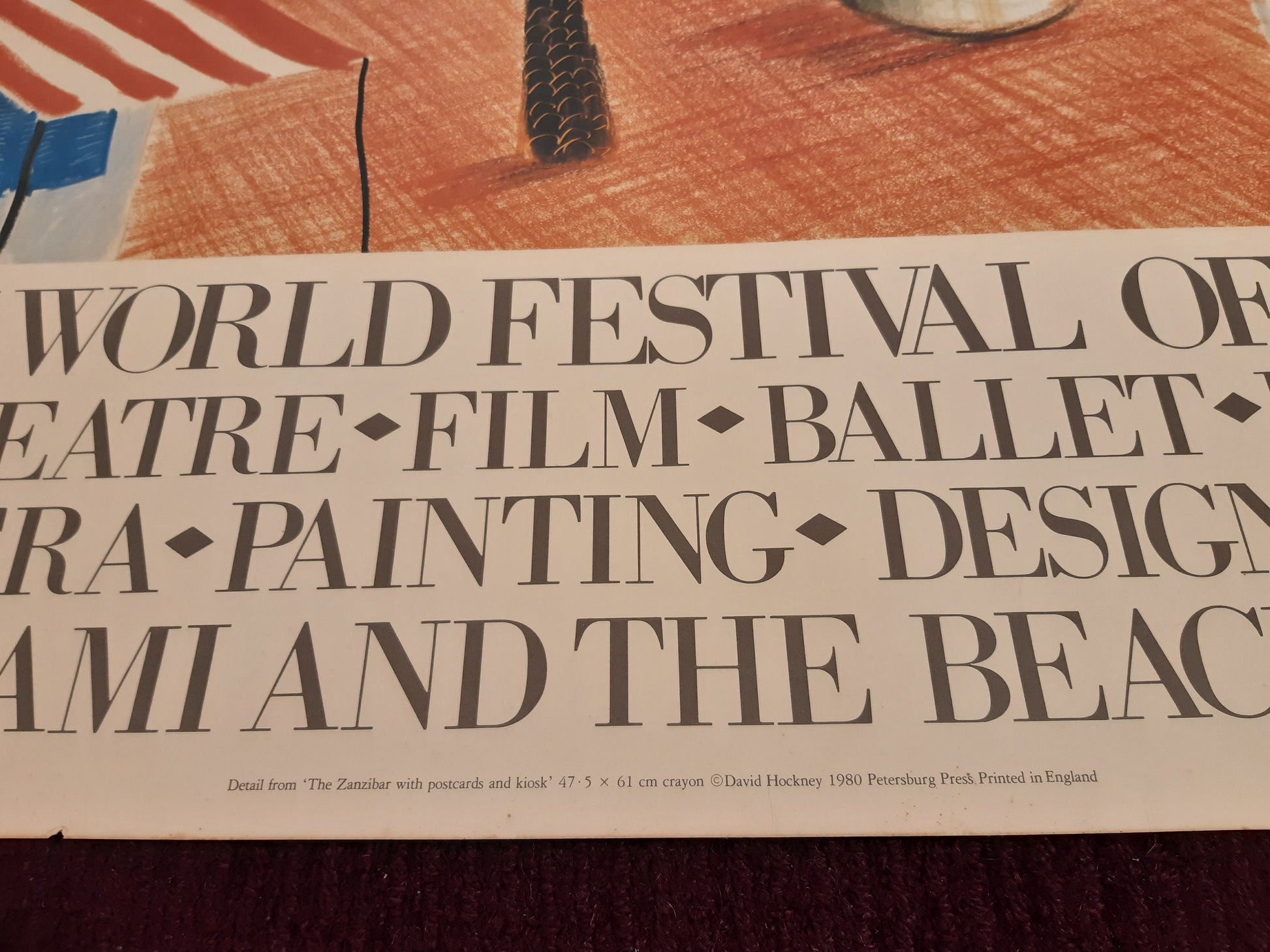 This is an iconic art poster by David Hockney, comissioned for the "New World Festival of the Arts" 1982 in Miami, USA. The poster is listed as Nr. 106 in the poster catalogue by Brian Baggott. The poster features a part of the "Zanzibar with postcards and Kiosk" painting, made by David Hockney 1980.