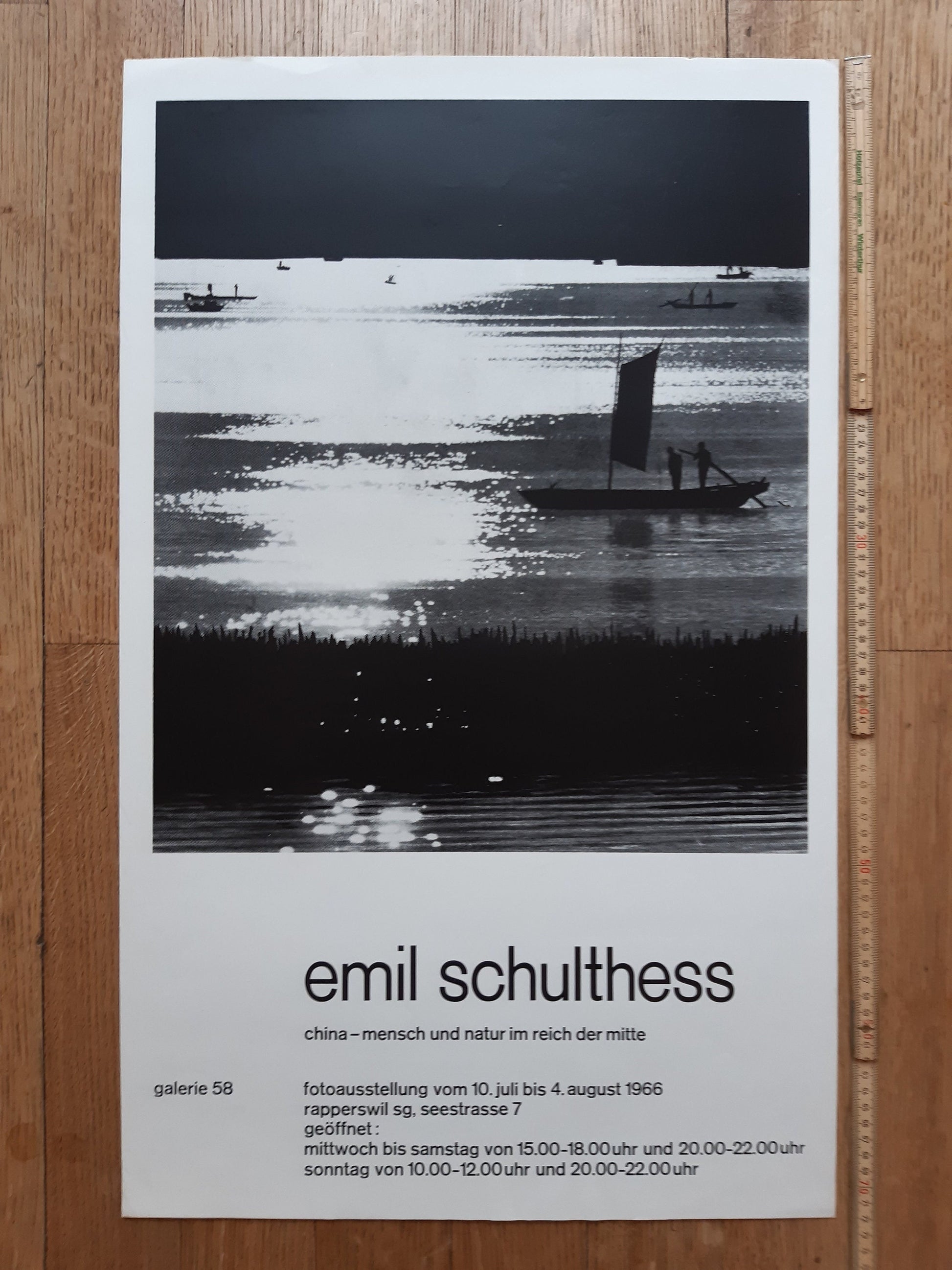 This poster by Emil Schulthess was released by the Galerie 58 in St.Gallen in Switzerland in 1966. Emil Schulthess (1913- 1996) was a swiss photographer who even has the Schulthess Buttress cliff named after him, thanks to his documentary work. The exhibition was about photographs fron rural China.