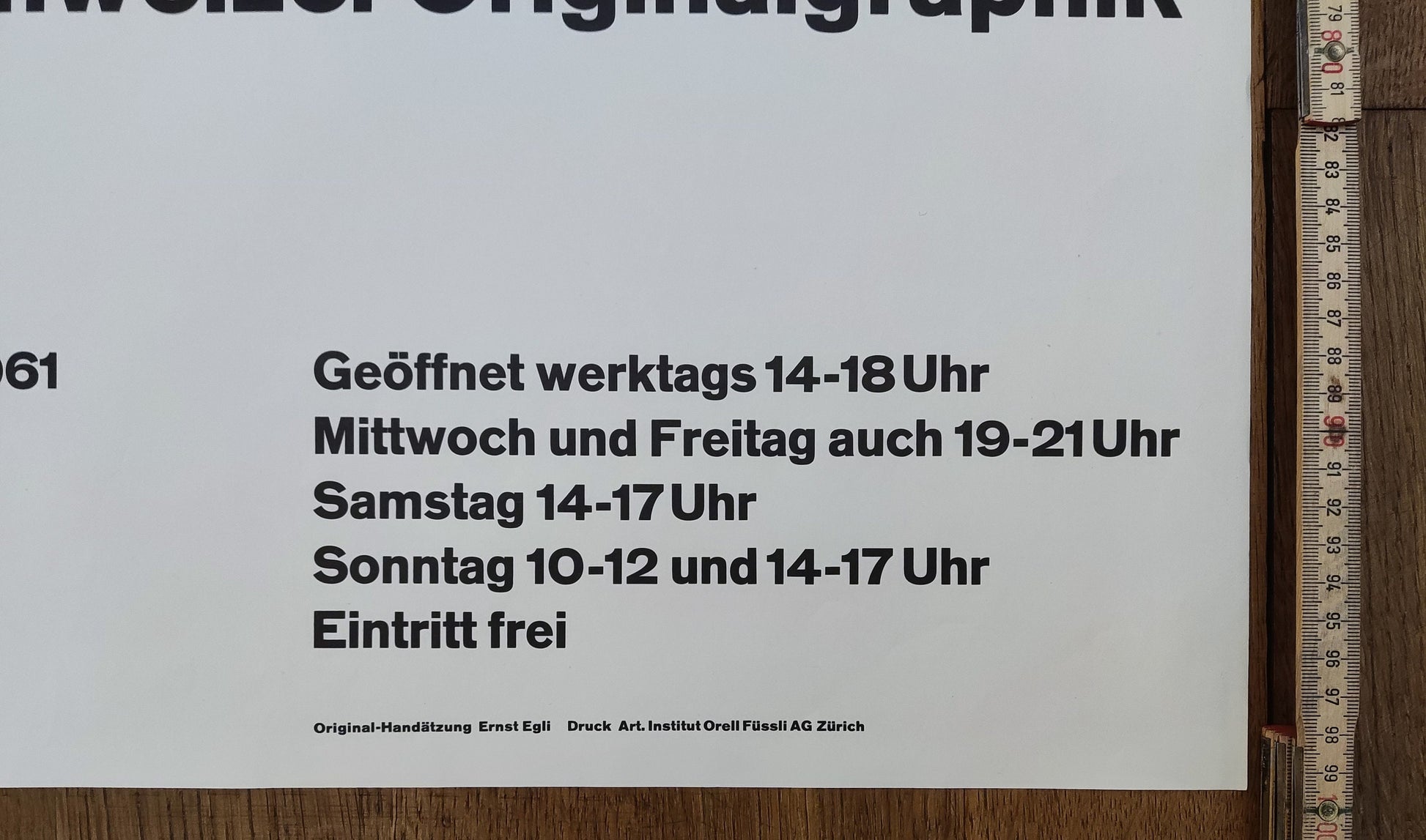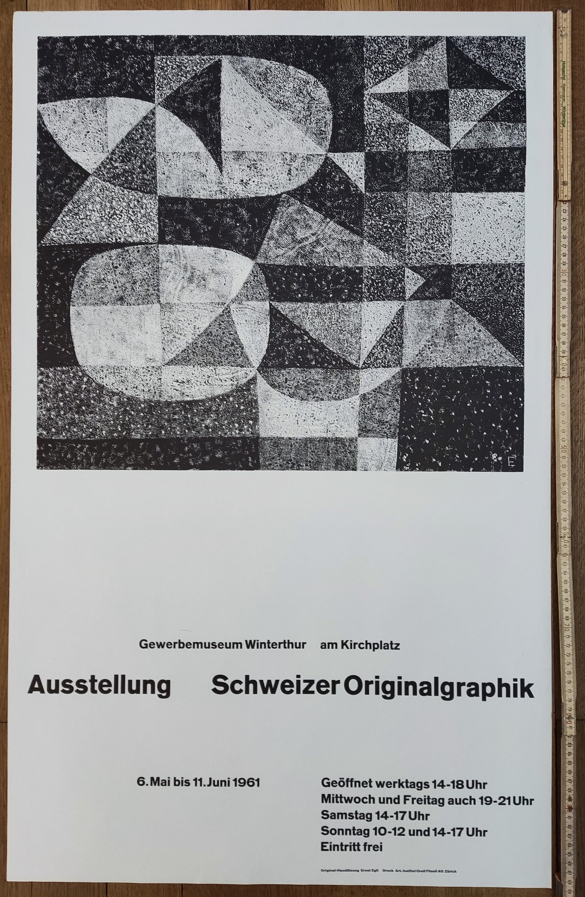 This in an original art print by Ernst Egli advertising an exhibition at the Gewerbemuseum Winterthur, Switzerland in 1961.