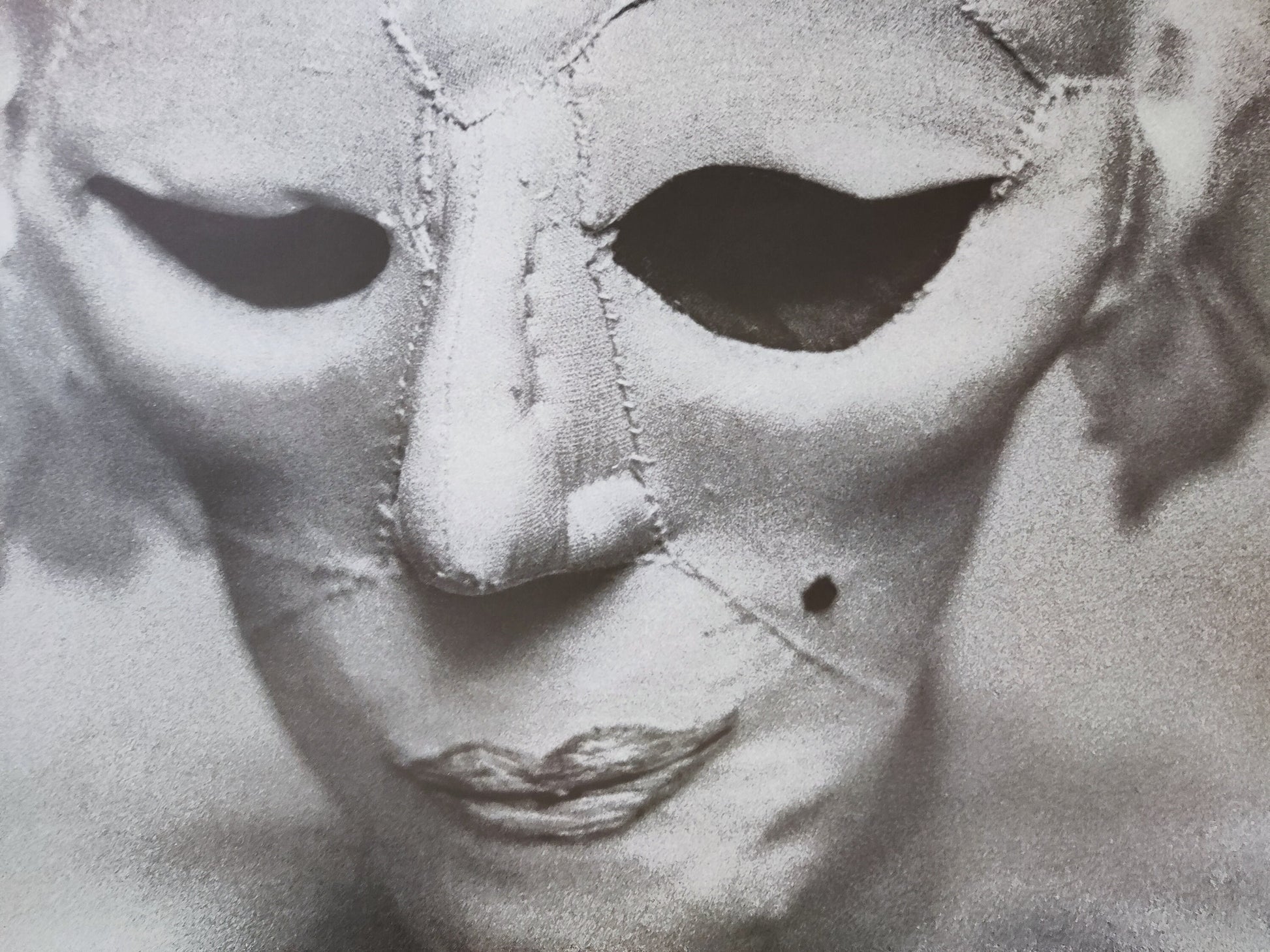 This is a beautiful art poster by Swiss Eva Aeppli featuring an artwork of a woman with a mask and advertising an exhibition at the Helmhaus Zürich in 1974.