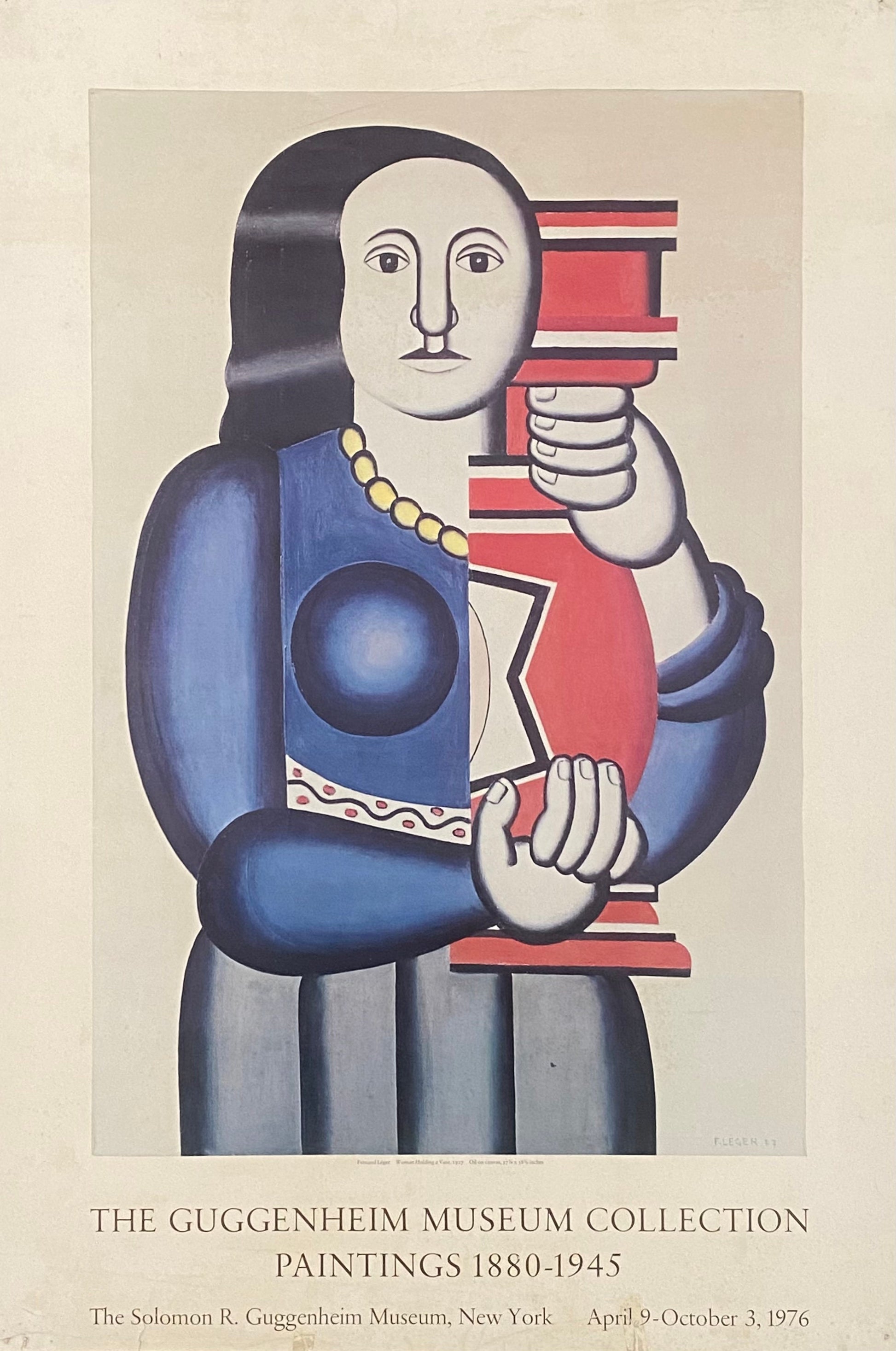 This is a beautiful art poster by Fernand Léger featuring an artwork of an abstract woman holding a red object and advertising an exhibition at the Guggenheim Museum, New York in 1976.