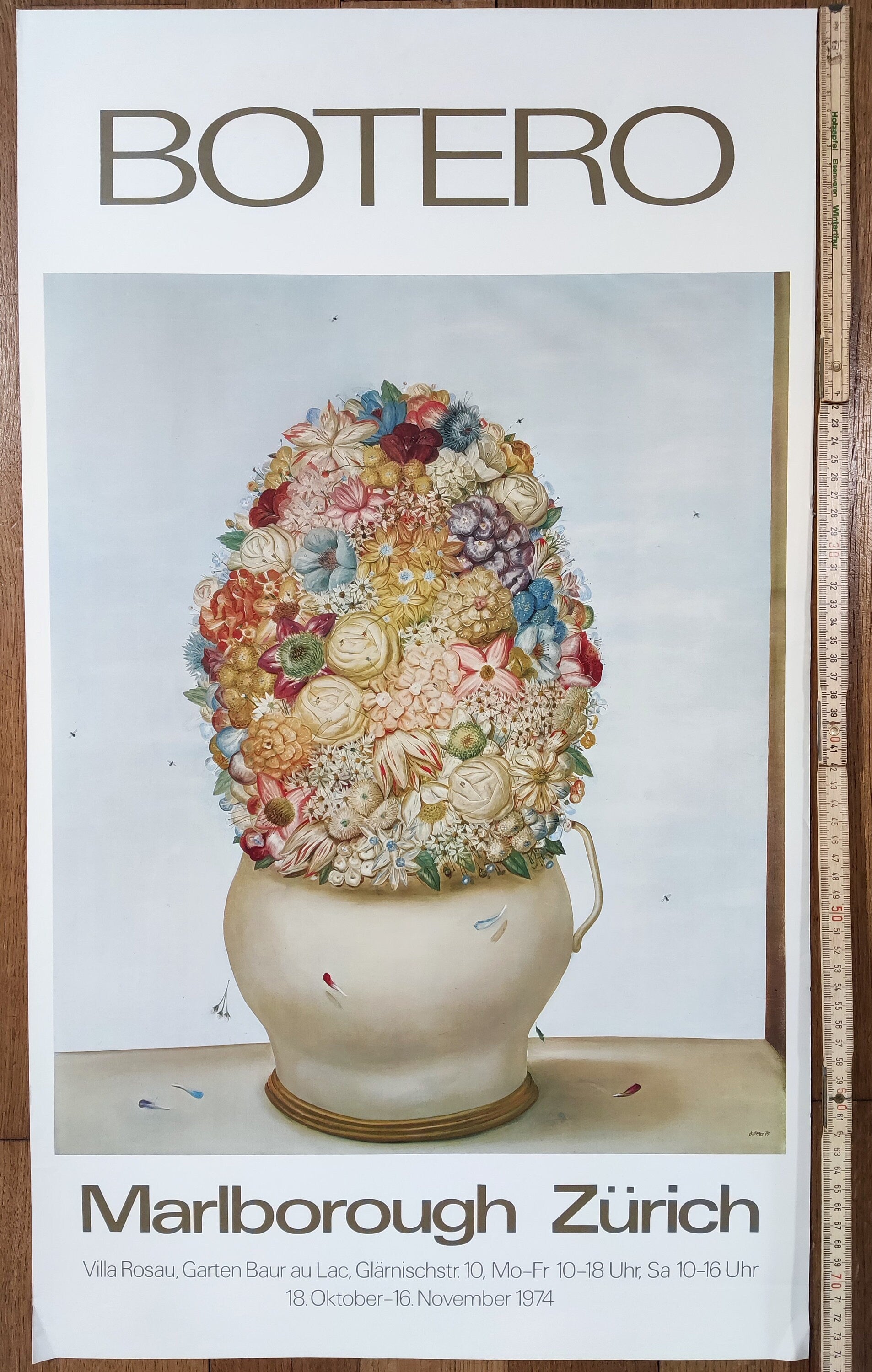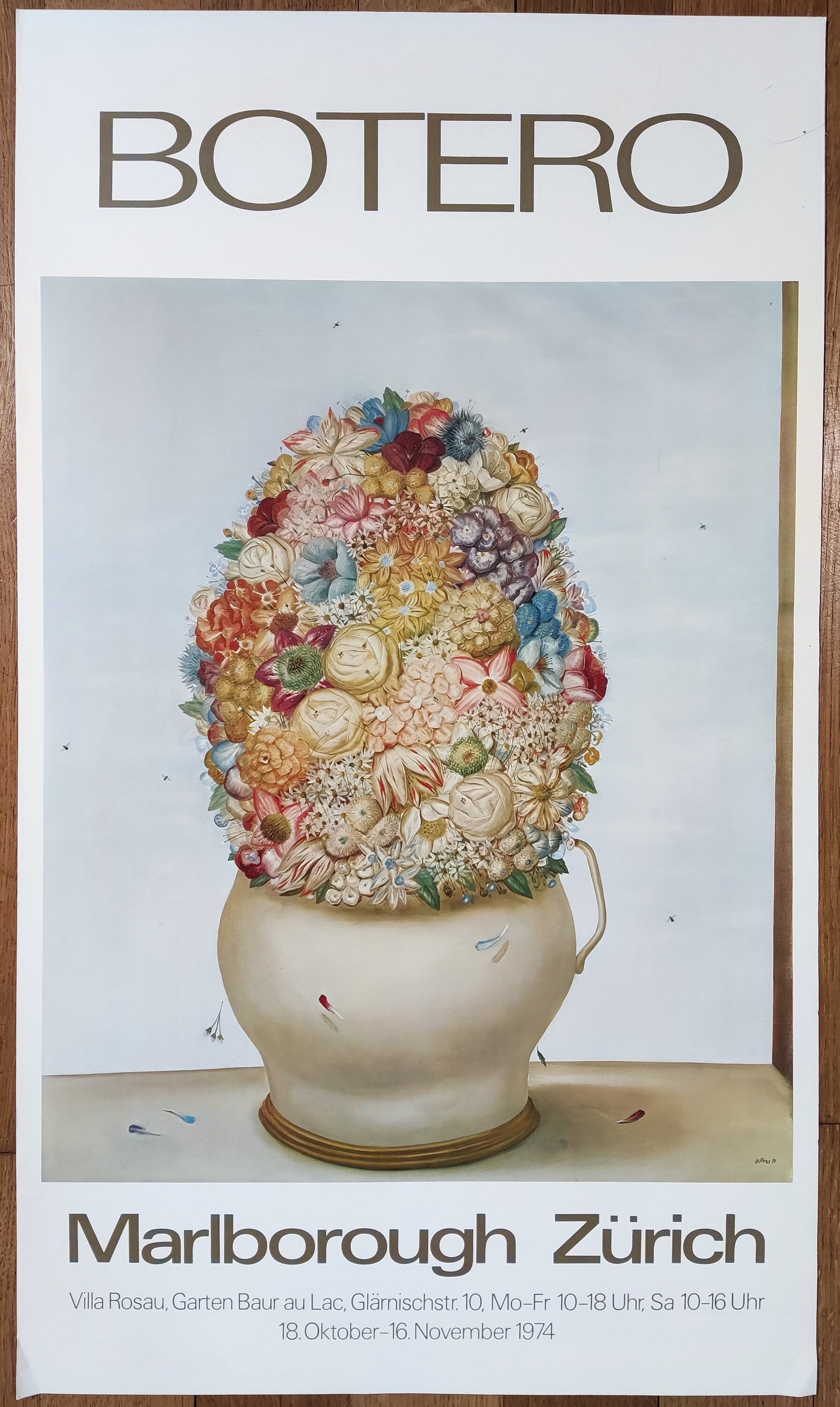 This is an original art poster featuring a work by columbian Fernando Botero and advertising an exhibition at the Gallery Marlborough in Zurich, Switzerland in 1974.