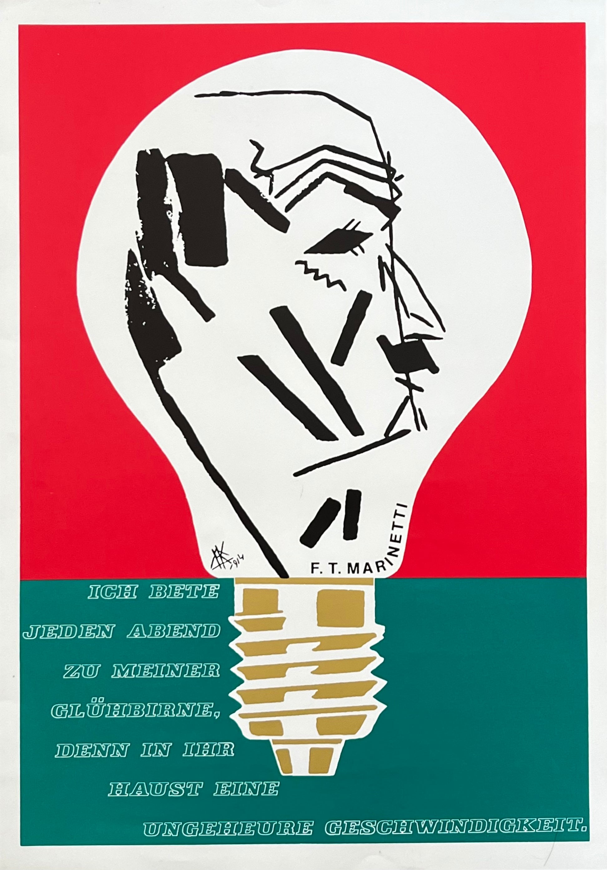 This is a beautiful silkscreen-lithography art poster by Italian Filippo Tommaso Marinetti featuring an abstract artwork of a lightbulb.