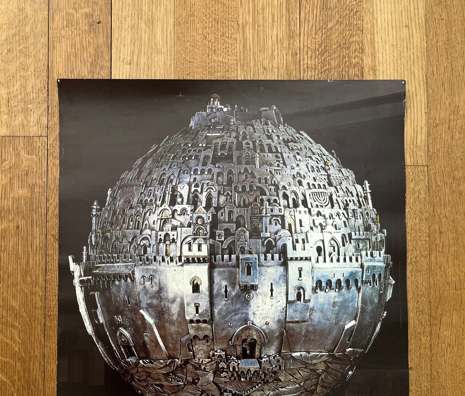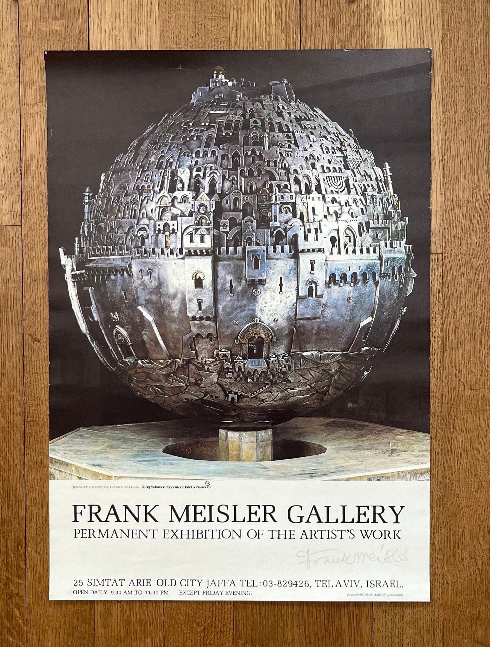 This is an original art poster featuring an artwork of an iron ball by Frank Meisler and advertising an exhibition in Tel Aviv, Israel.