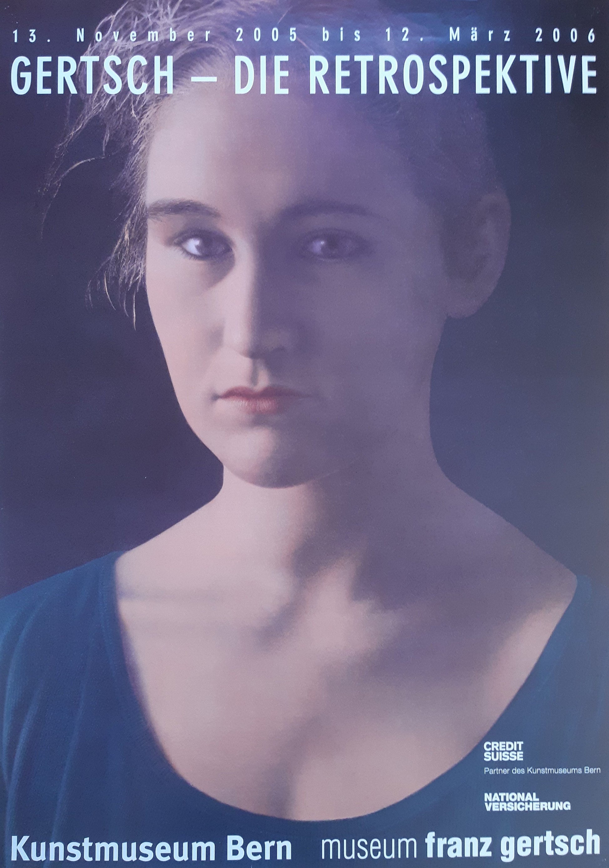 This is an original art poster featuring a portrait painting by Franz Gertsch The poster advertises an exhibition in Bern, Switzerland in 2006. It is in good condition with pinholes, some rolliong marks and some handling marks at the edges (see photos).
