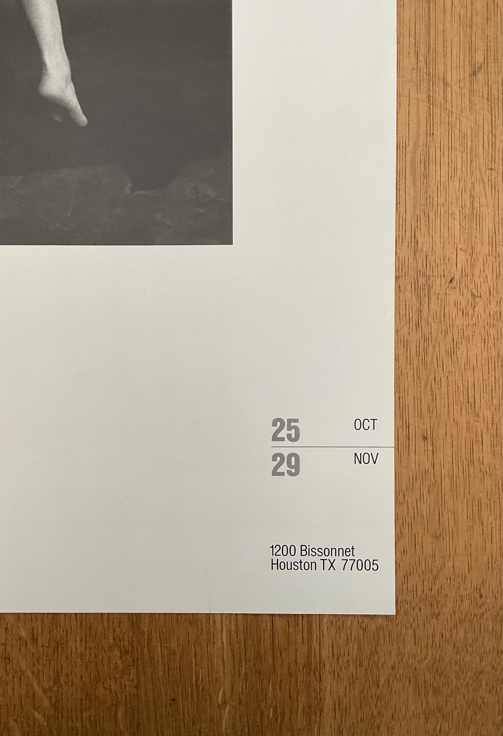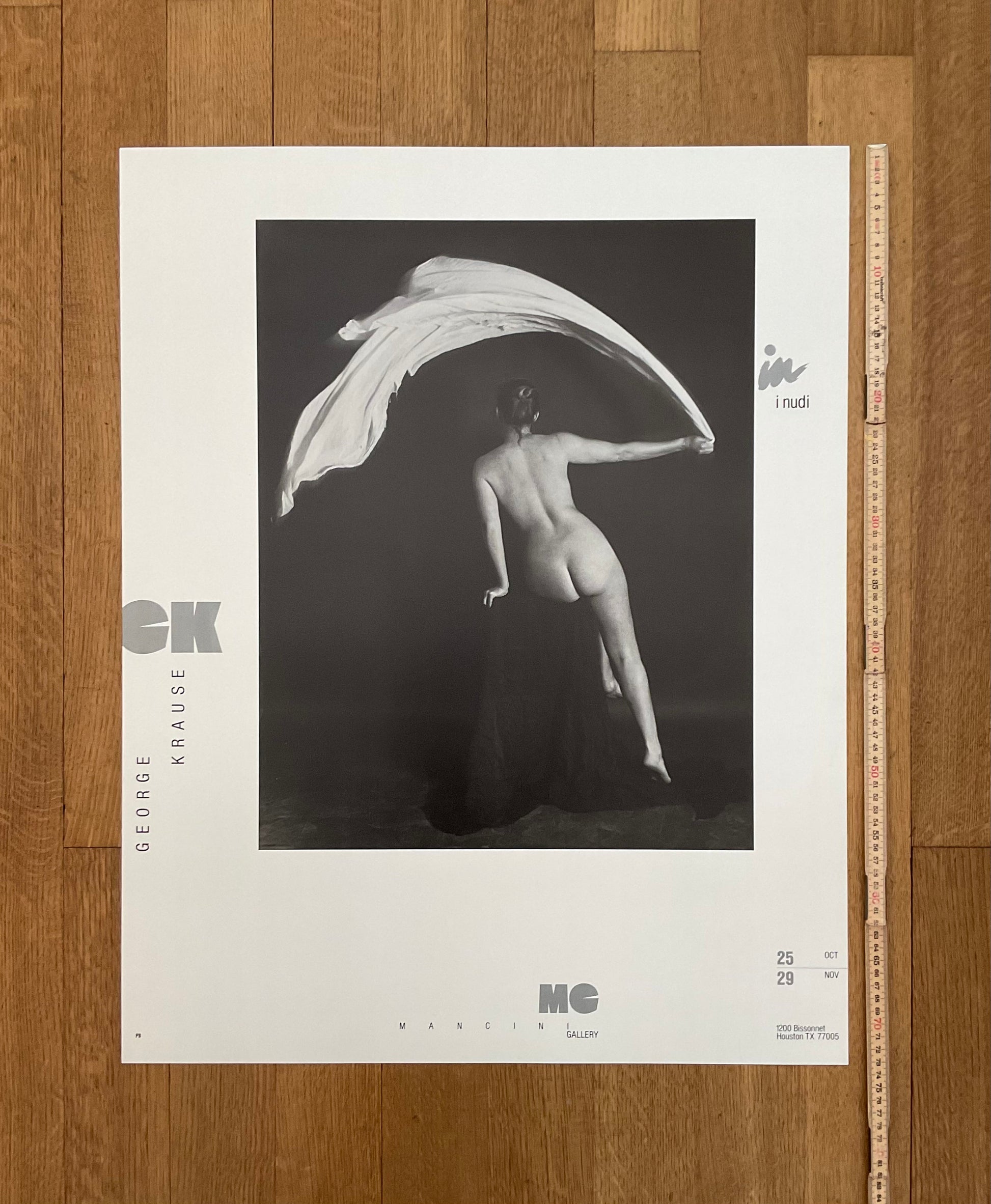 This is an original photography poster by American George Krause featuring a photograph of a naked woman from the back swinging a white cloth and advertising an exhibition at the Mancini Gallery in Houston, Texas.