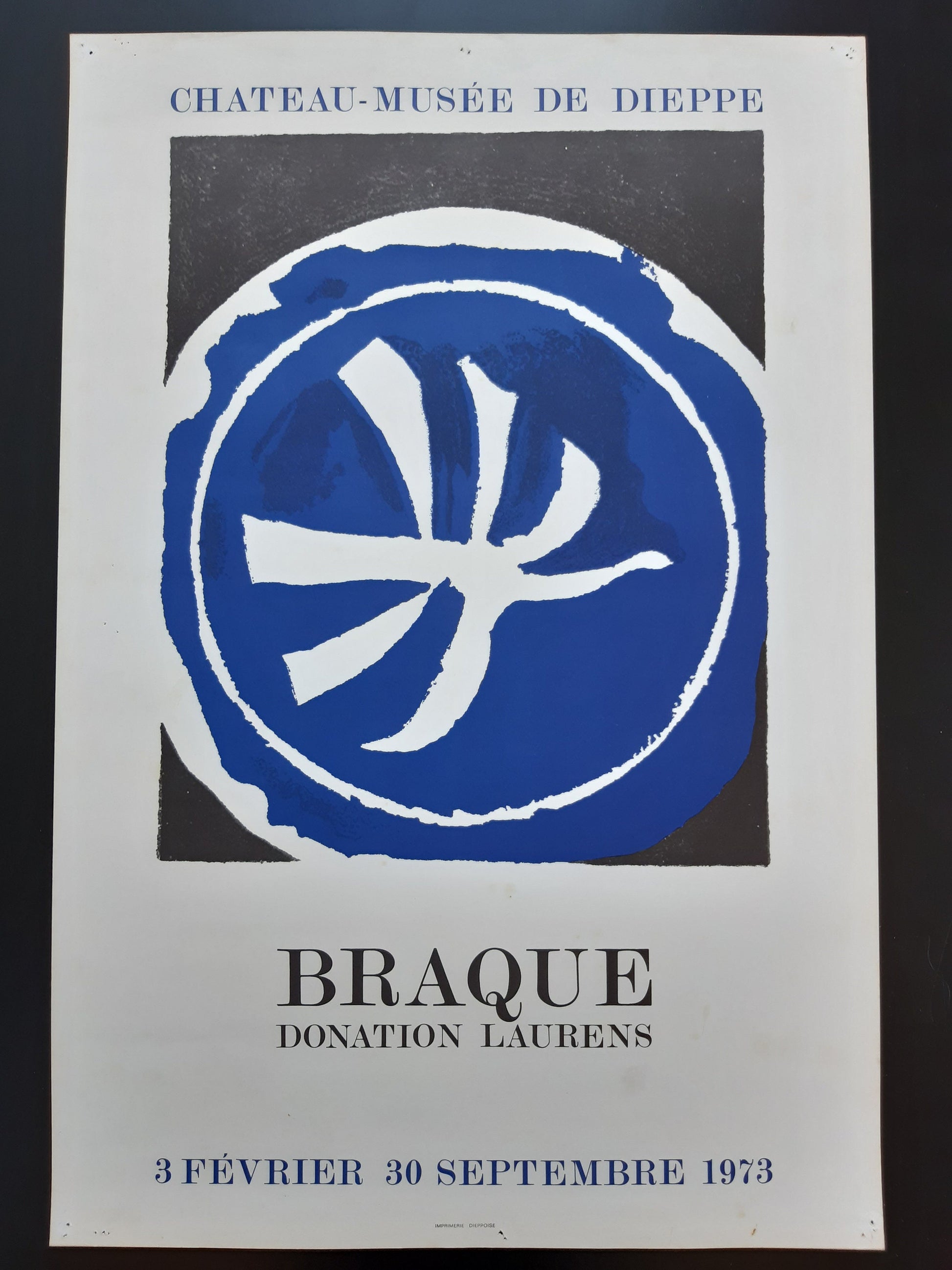 This is an original art poster for an exhibition in 1973 in Dieppe, France. The blue part is a lithograph. The poster is in good, used condition, notable some pinholes.