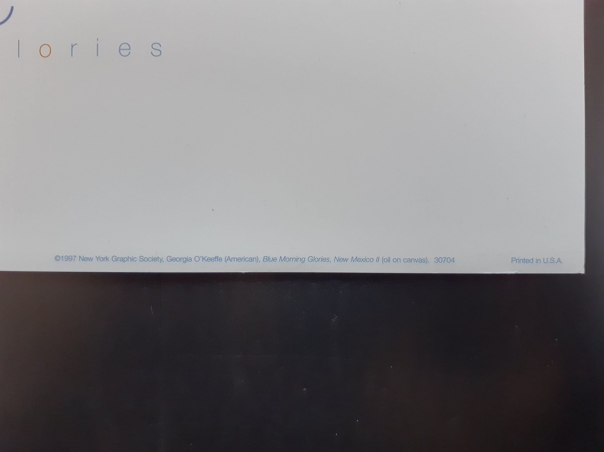 This is an original art poster featuring the artwork "Blue Morning Glories, New Mexico II" by Georgia o'Keeffe.