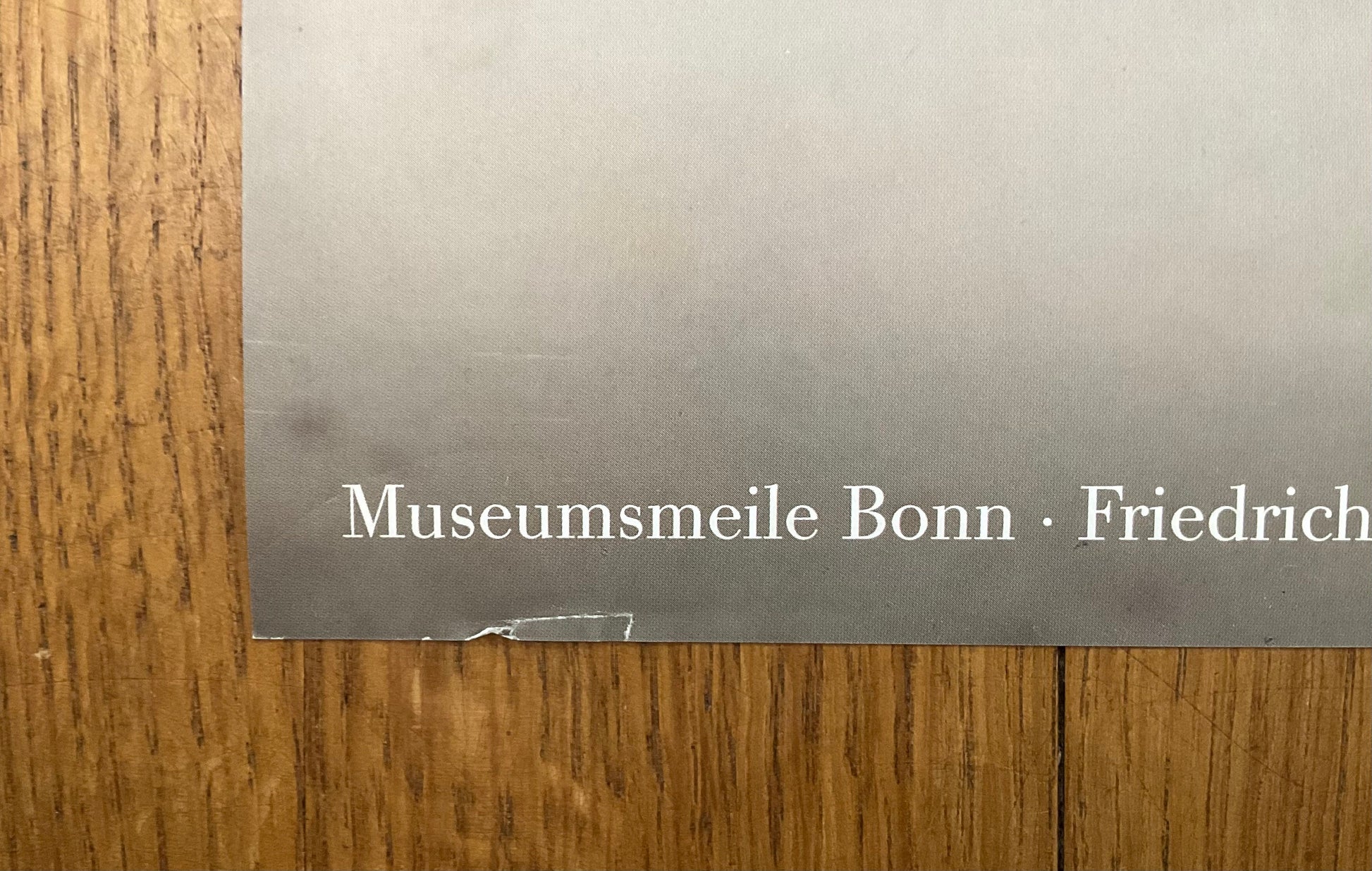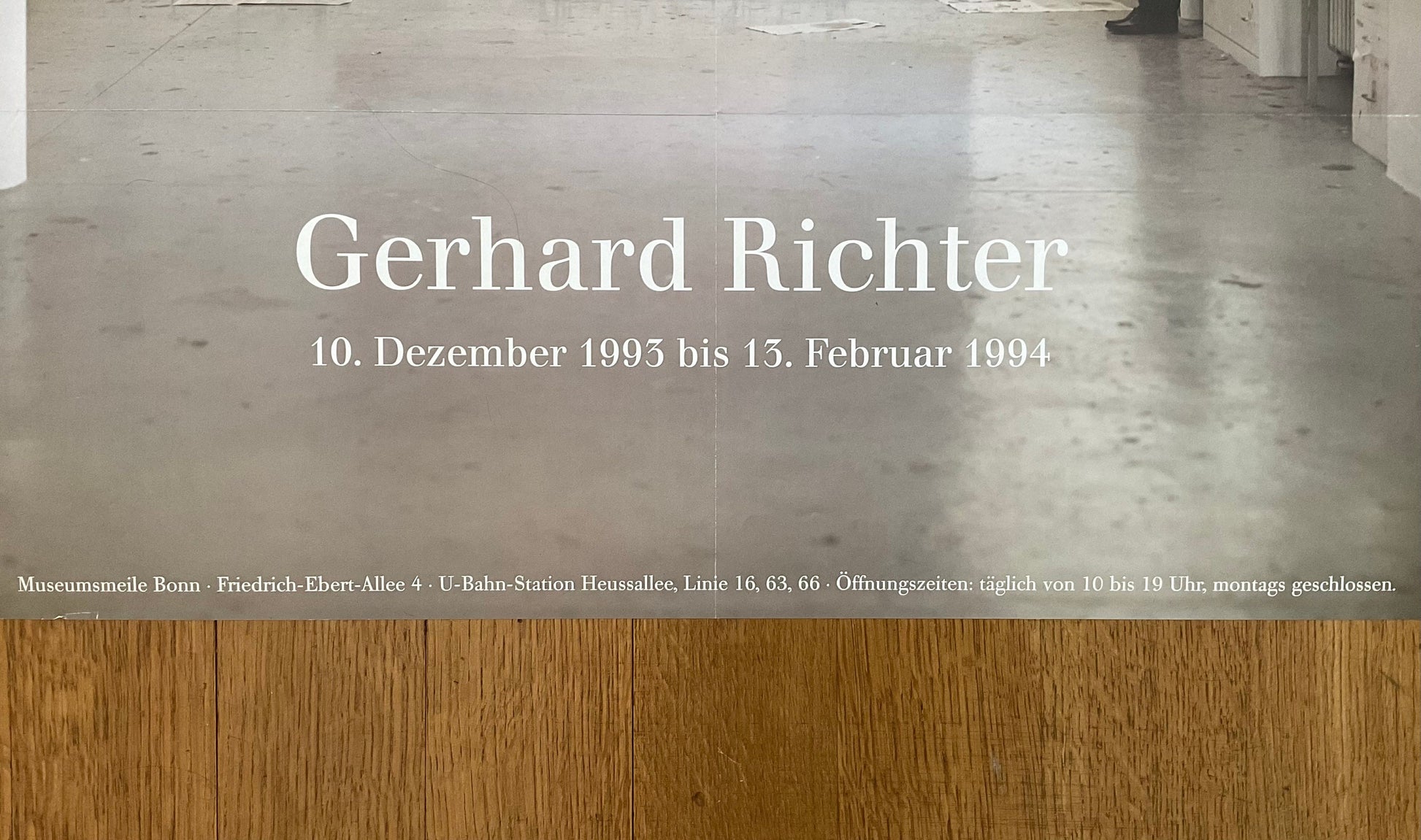 This is a beautiful art poster featuring a photo of a man (maybe the artist himself) looking at a big painting (by Gerhard Richter) and advertising an exhibition at the "Museumsmeile Bonn", Germany in 1993.