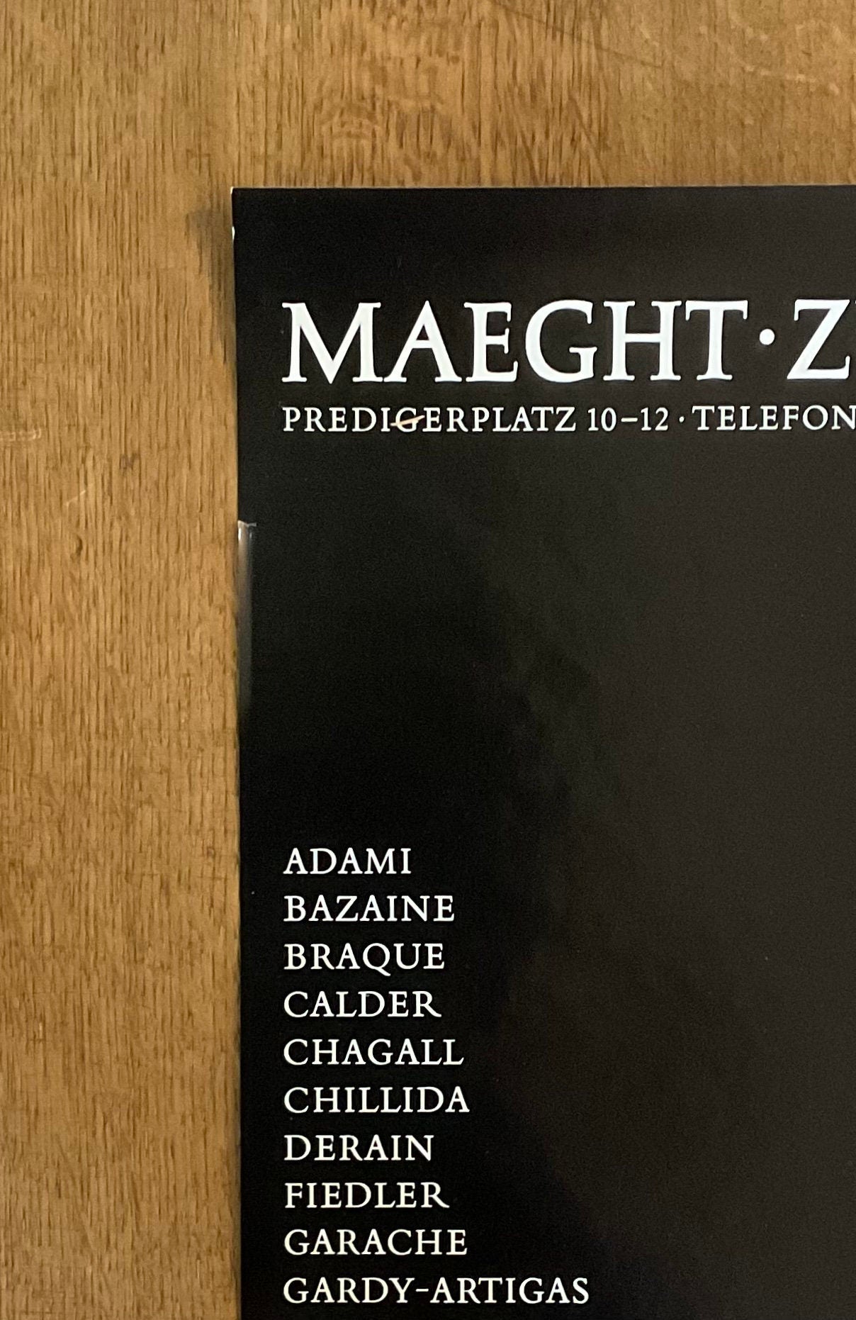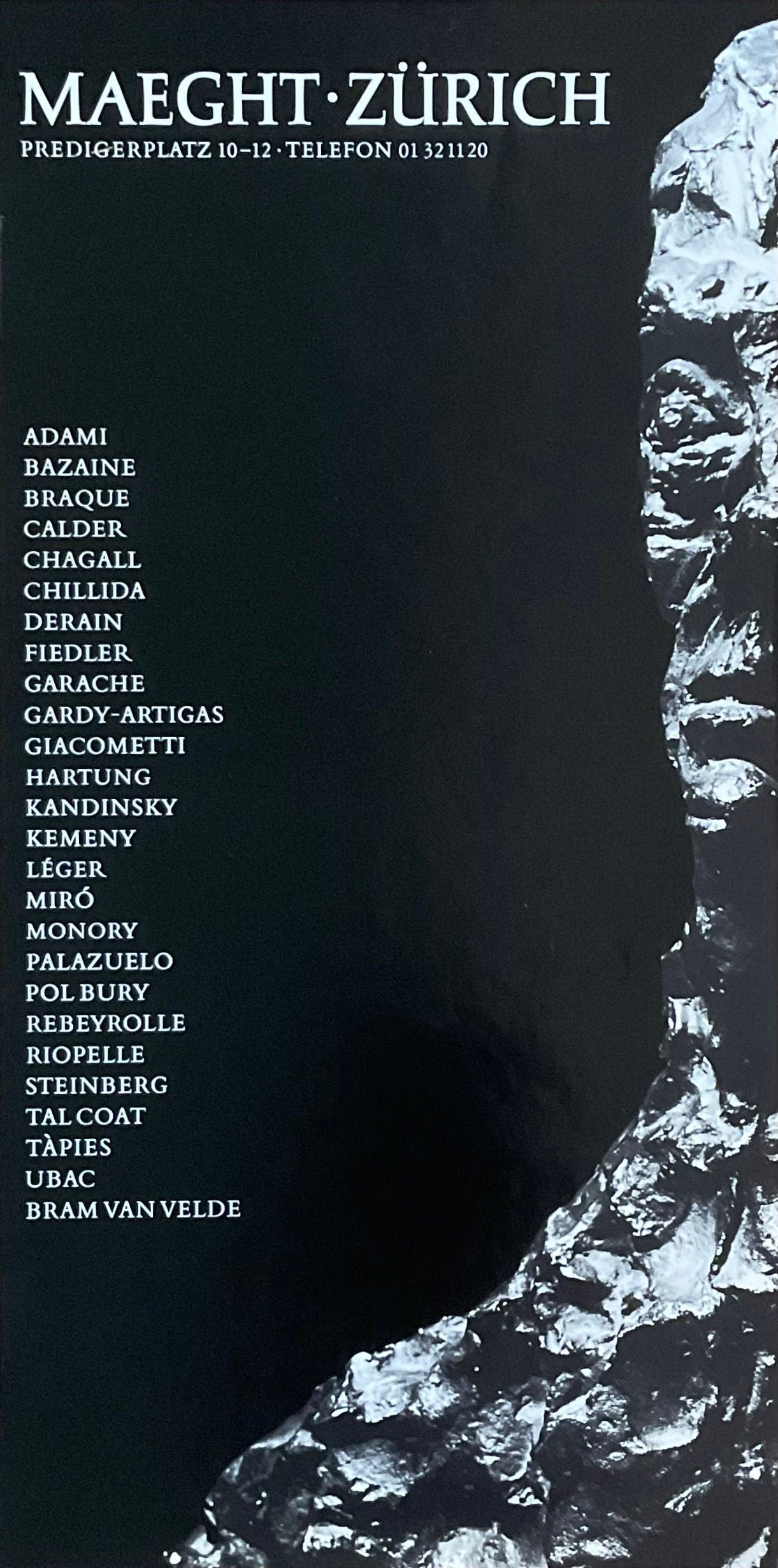 This is an original art poster featuring a sculpture by Alberto Giacometti, decorating a poster that was released by Maeght Zurich for an exhibition featuring plenty of other artists.