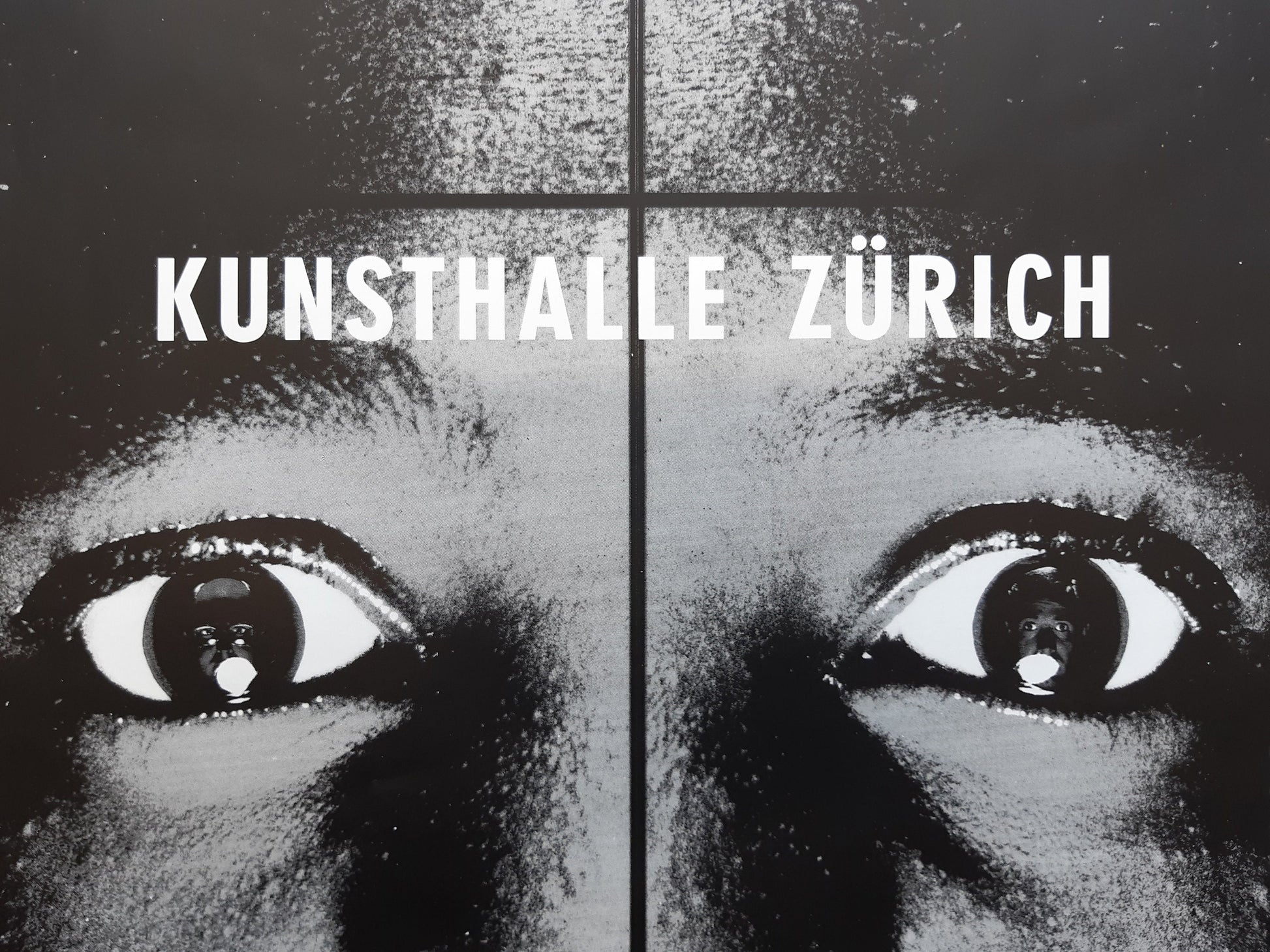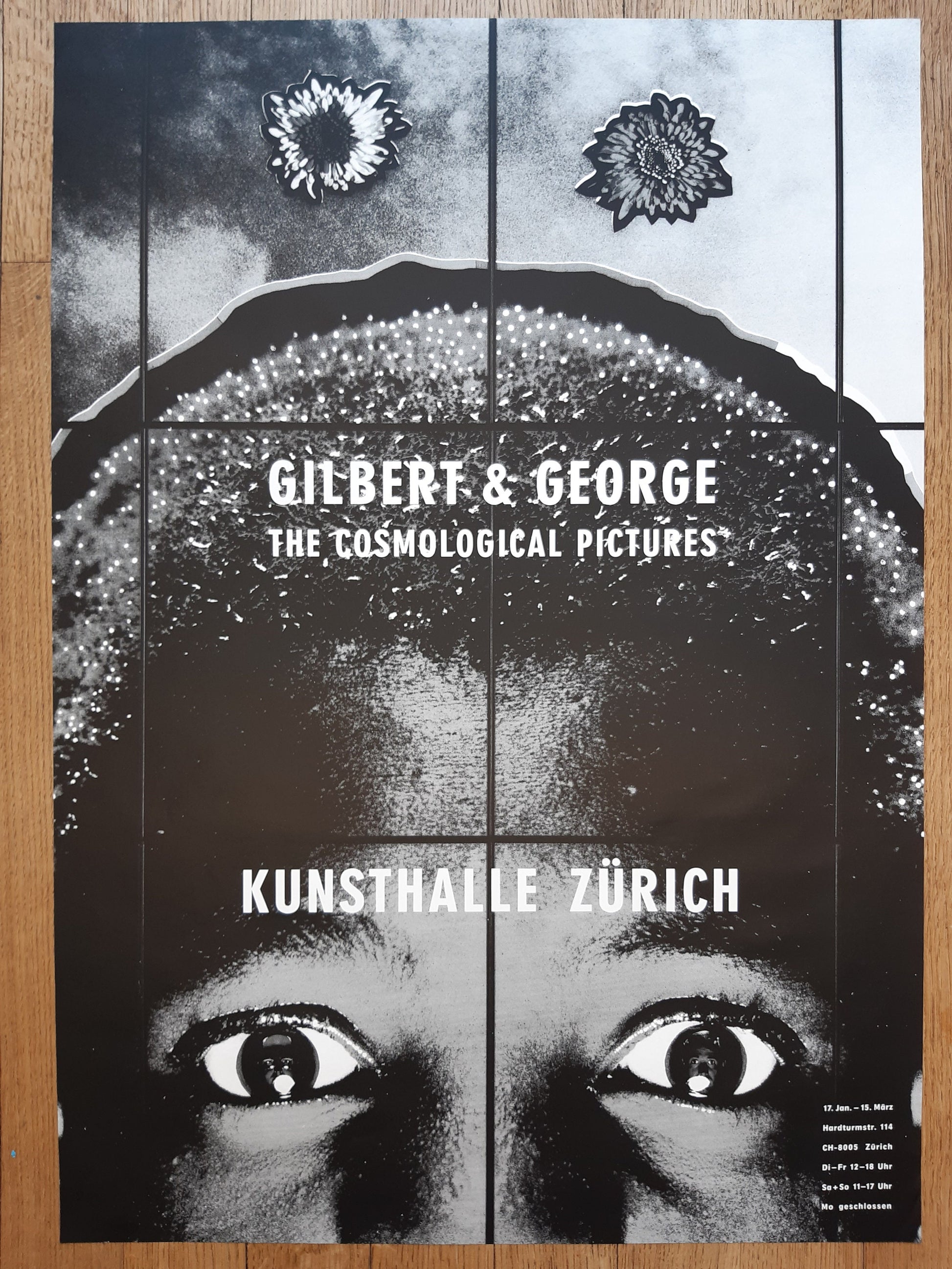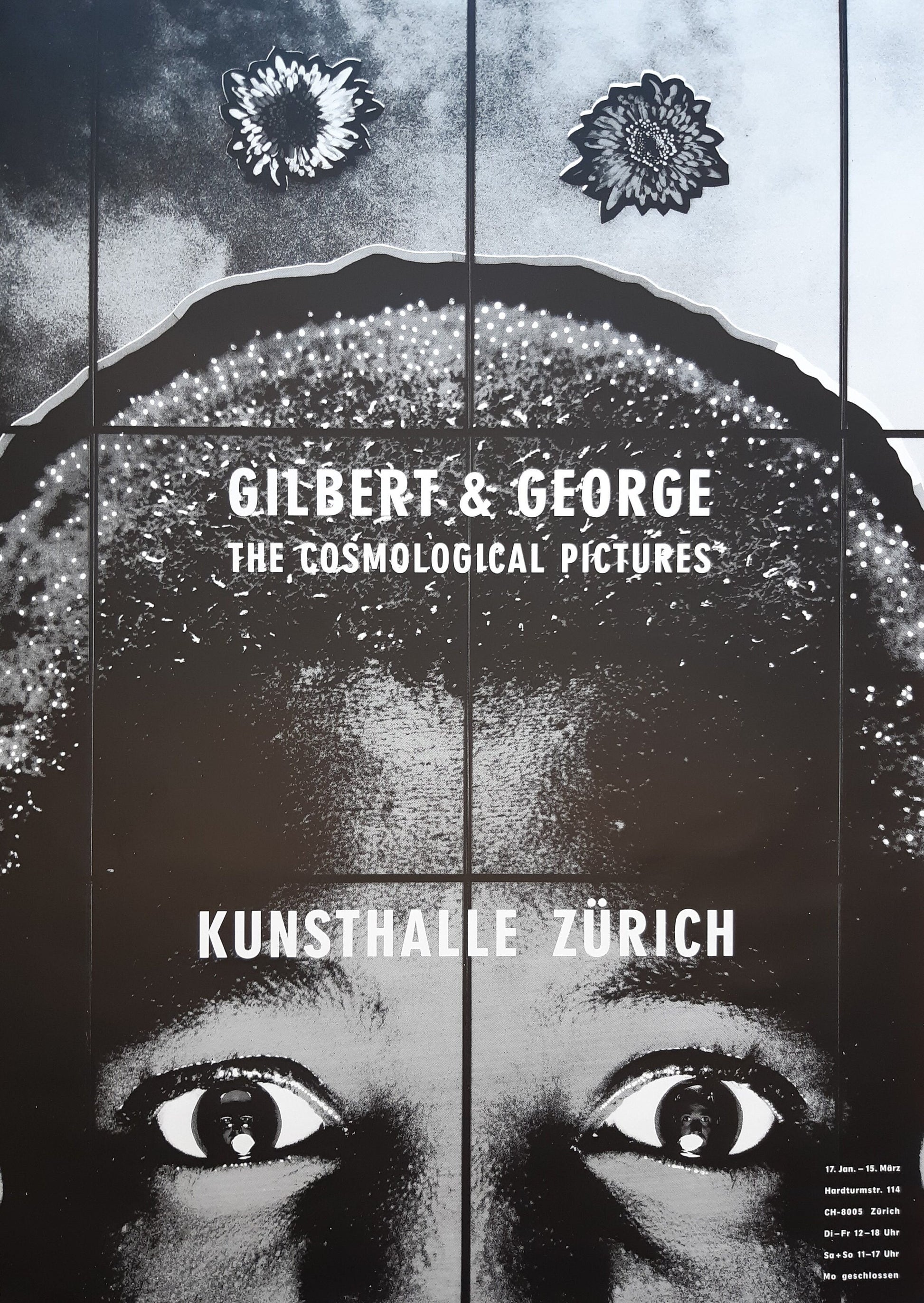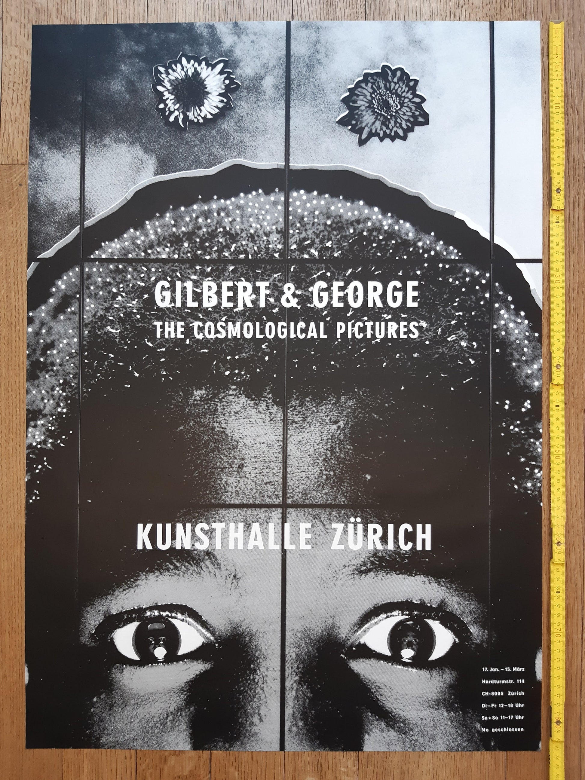 This fantastic and rare original art poster is advertising the exhibition at the Kunsthalle Zürich in 1992 where the artworks of "the cosmological pictures" have been exhibited. Gilbert Prousch, (born 1943), and George Passmore (born 1942), are two artists who work together as the collaborative art duo Gilbert & George.