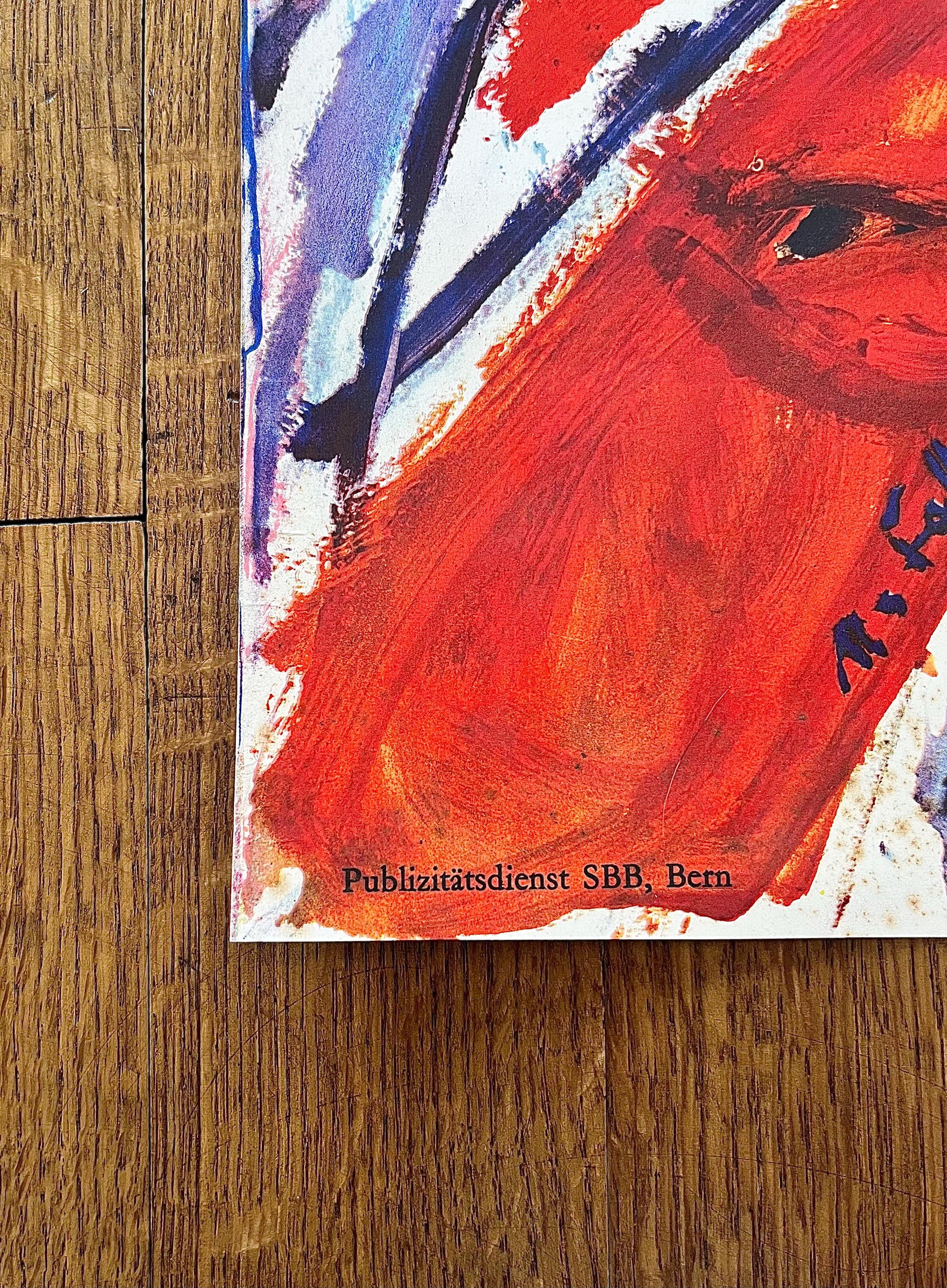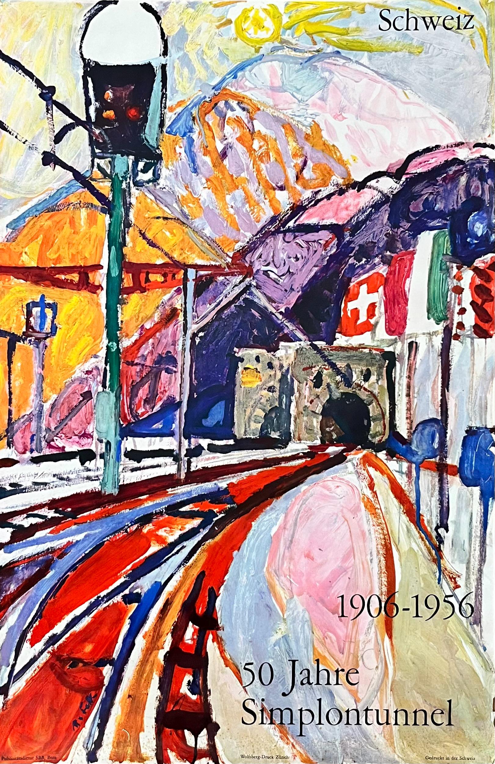 This is a beautiful poster featuring a work by Hans Falk showing the entrance of the Simplon tunnel in the swiss mountains. It was made in 1956, Switzerland.