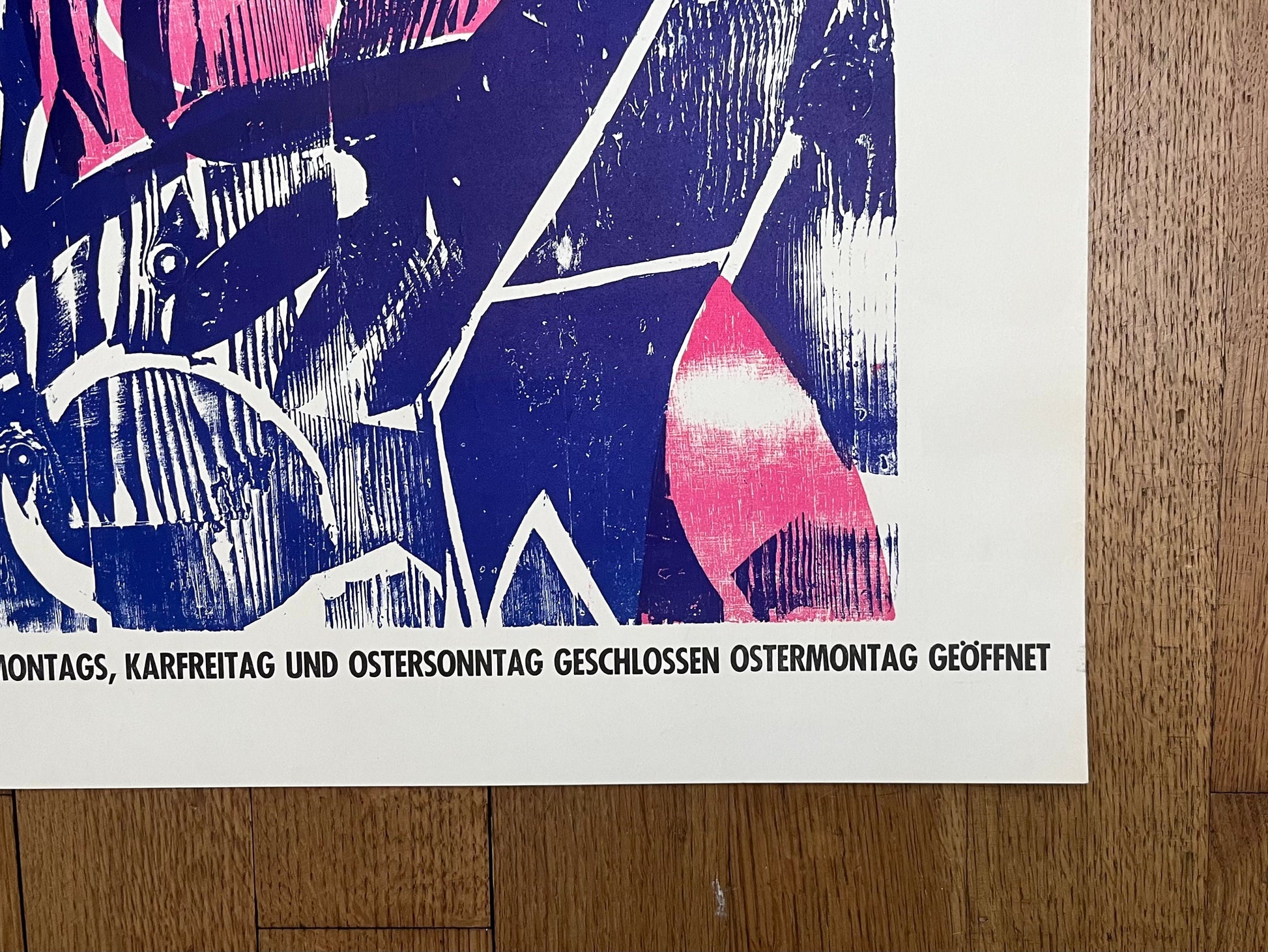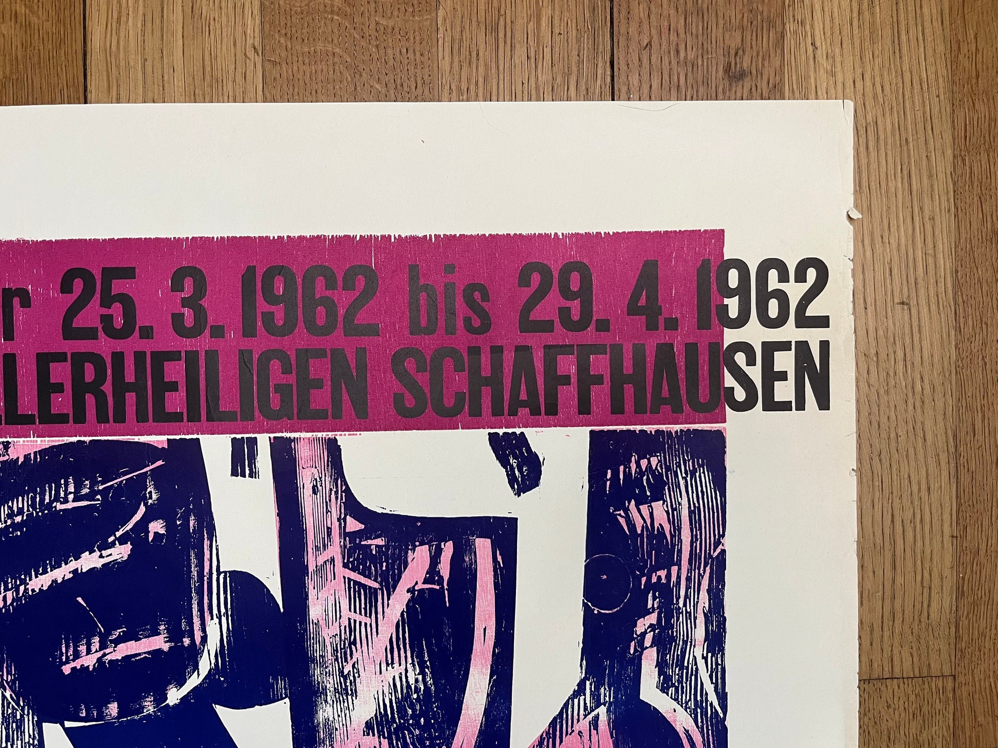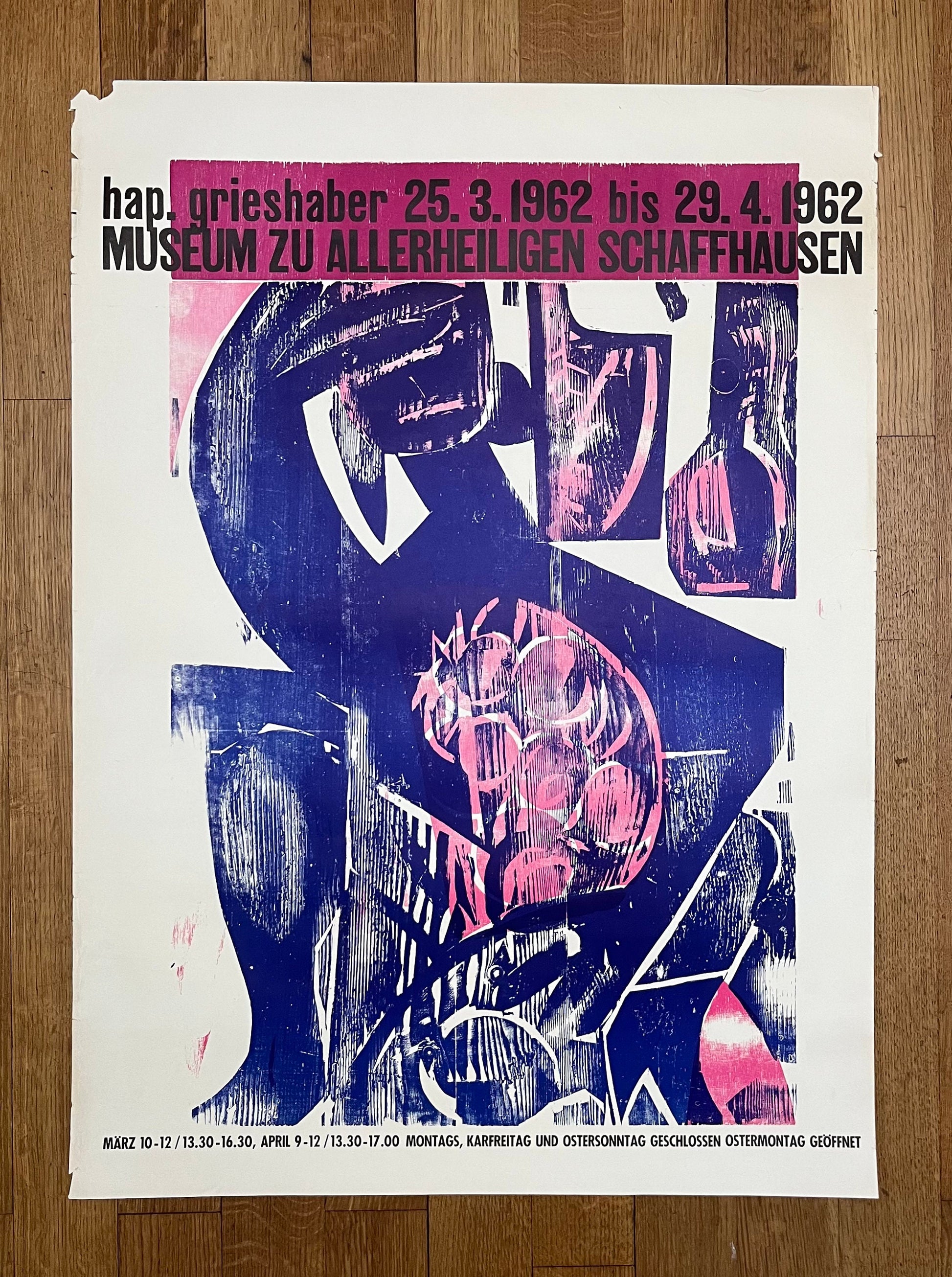 Original art poster by the Museum Zu Allerheiligen Schaffhausen that features the work of Hap Gieshabener. Published for an exhibition in 1962. It is a wood cut lithograph.