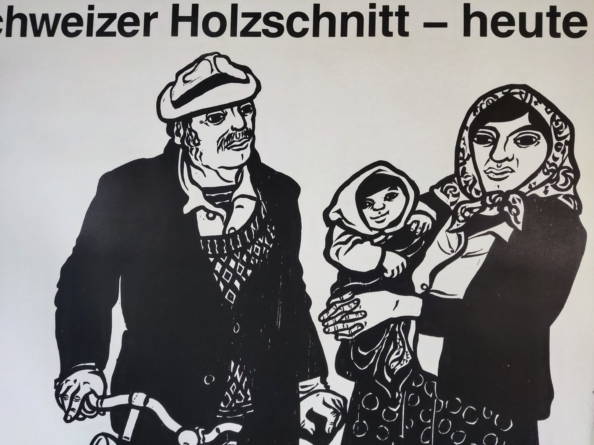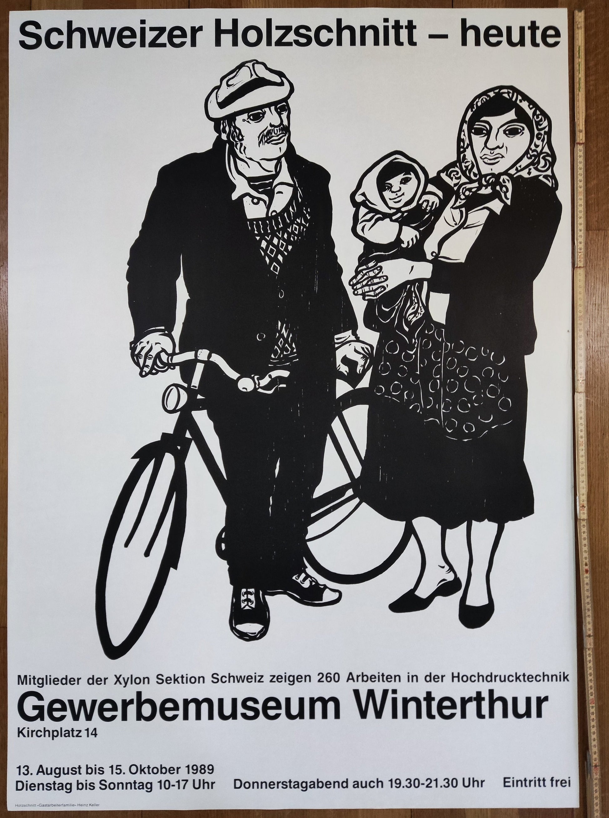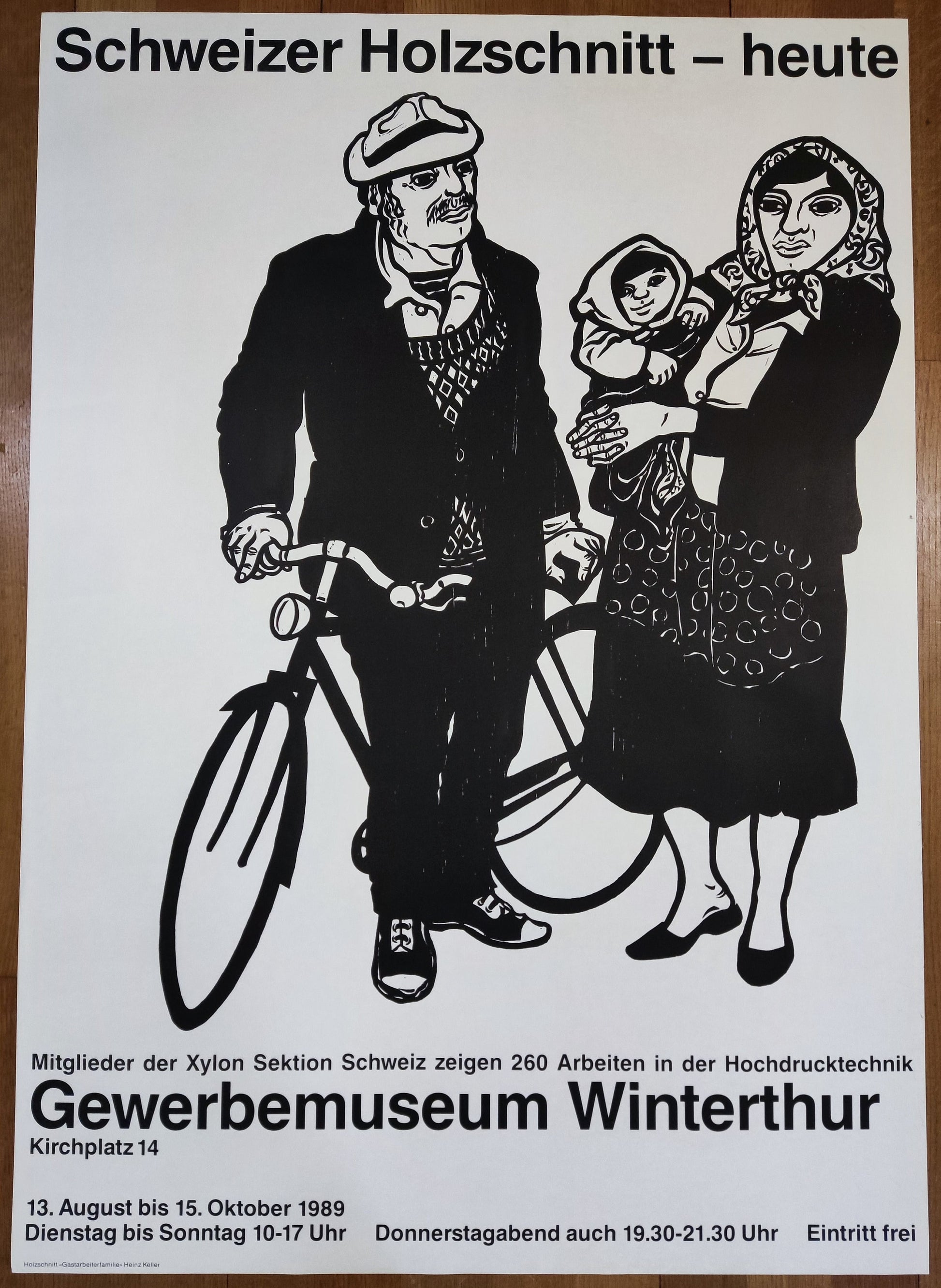 This is an original silkscreen-lithography art poster featuring an artwork of Swiss Heinz Keller and advertising the "Schweizer Holzschnitt"-exhibition at the Gewerbemuseum Winterthur, Switzerland in 1989.
