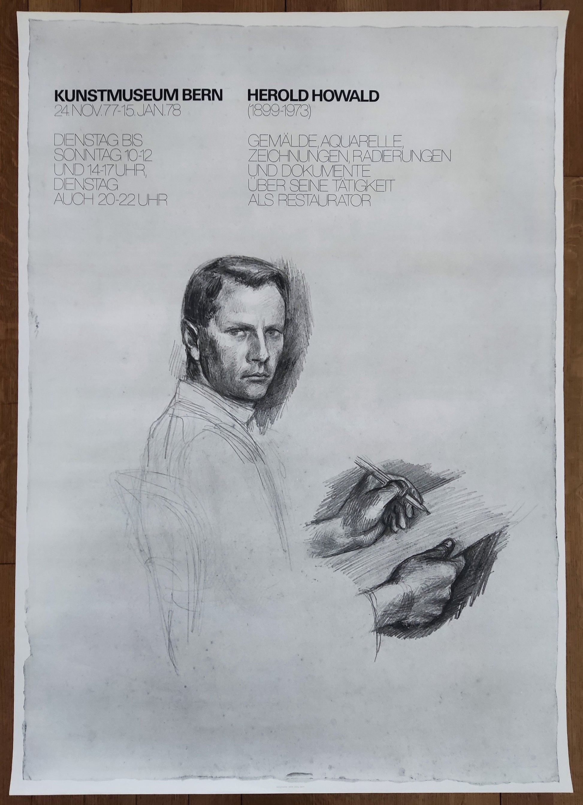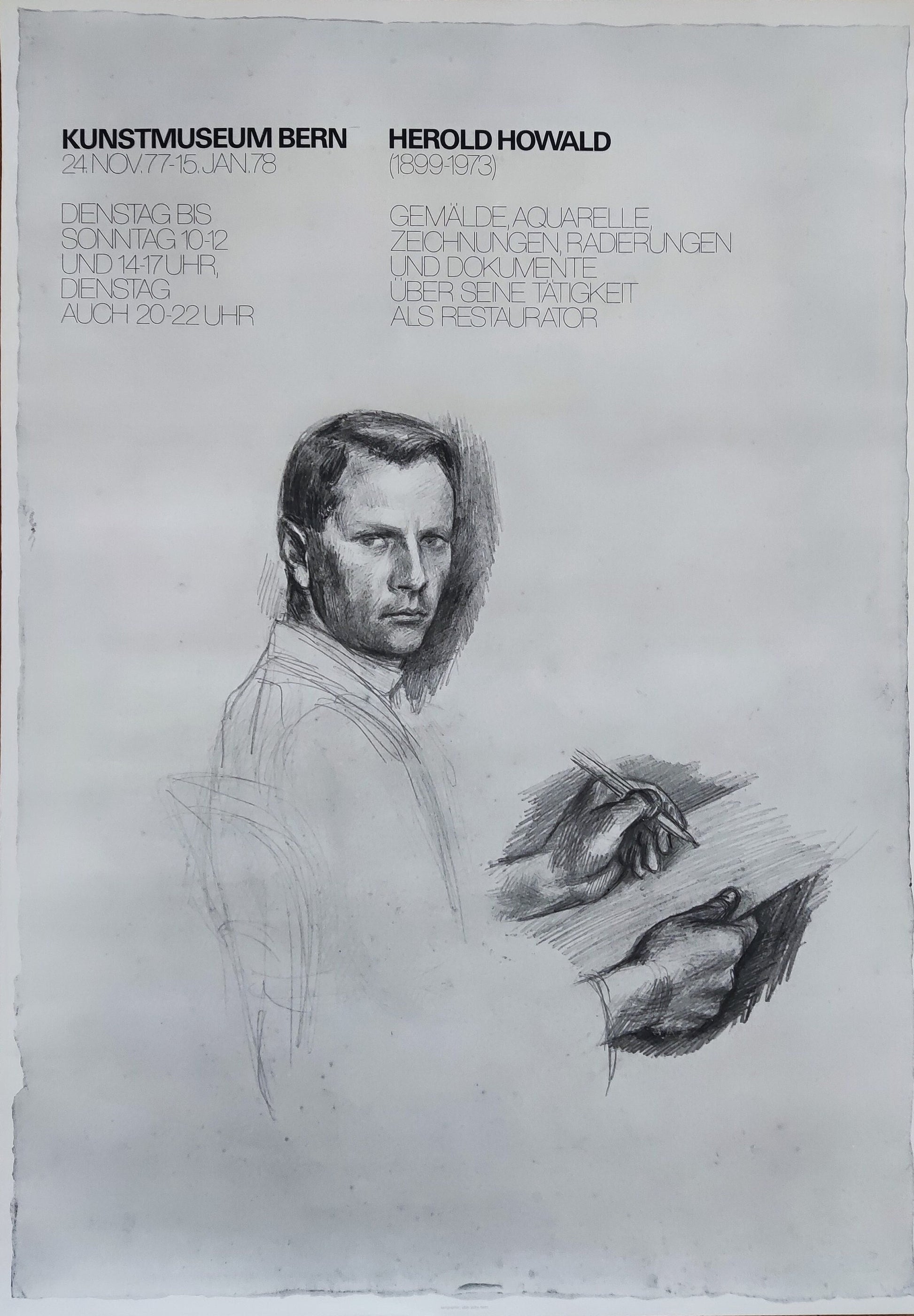 This original poster was released by the Kunstmuseum Bern. The exhibition "Gemälde, Aquarelle, Zeichnungen, Radierungen und Dokumente über seine Tätigkeiten als Restaurator" features artworks by Herold Howald. Herold Howald (1899-1973) was a Swiss painter and graphic designer.