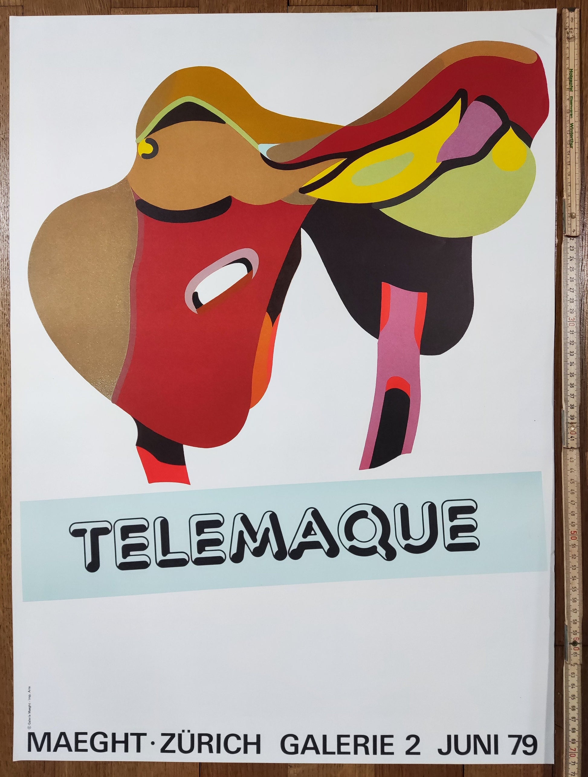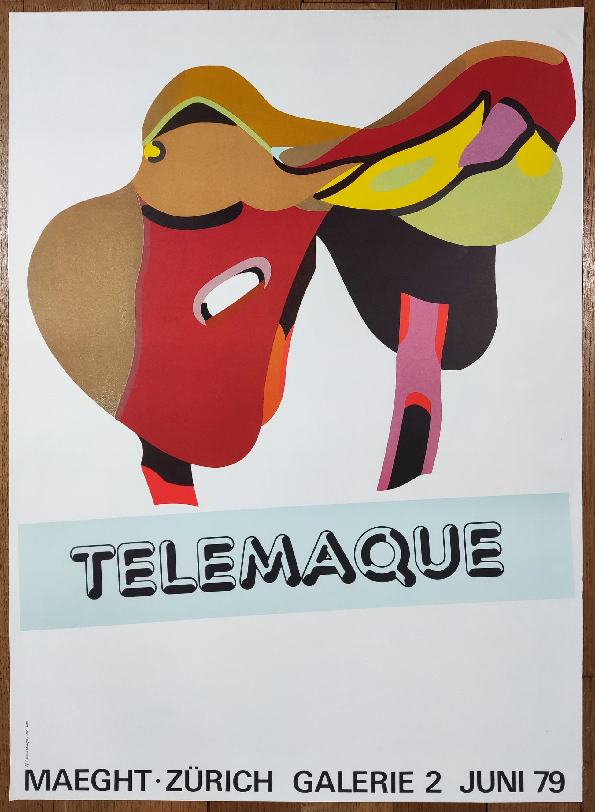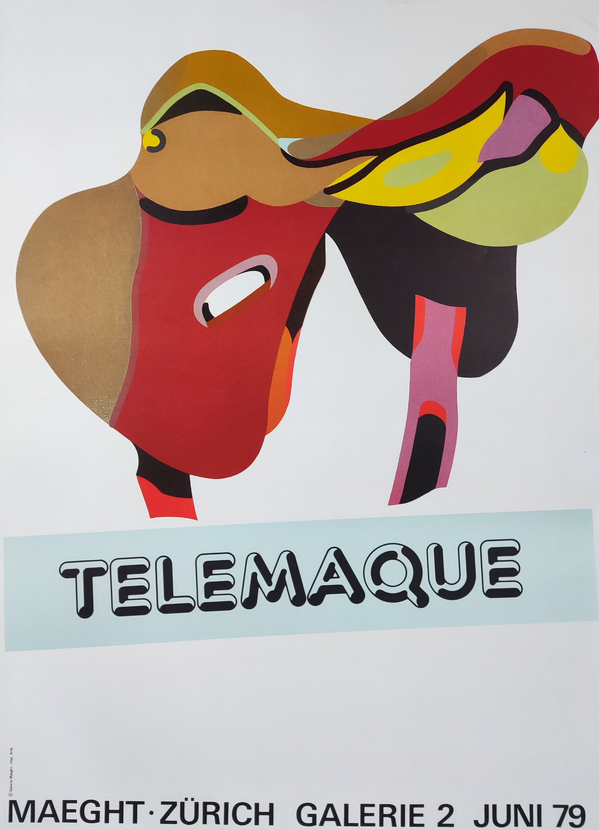 This is a silkscreen-lithography art poster featuring an artwork by Hervé Télémaque and advertising an exhibition at the Gallerie Maeght in Zurich in 1979.
