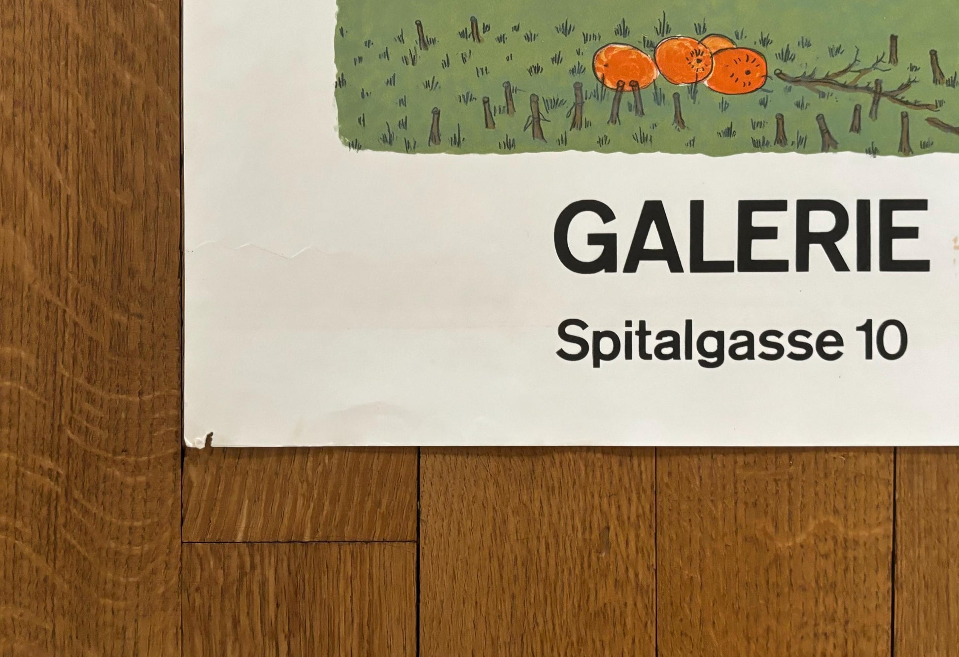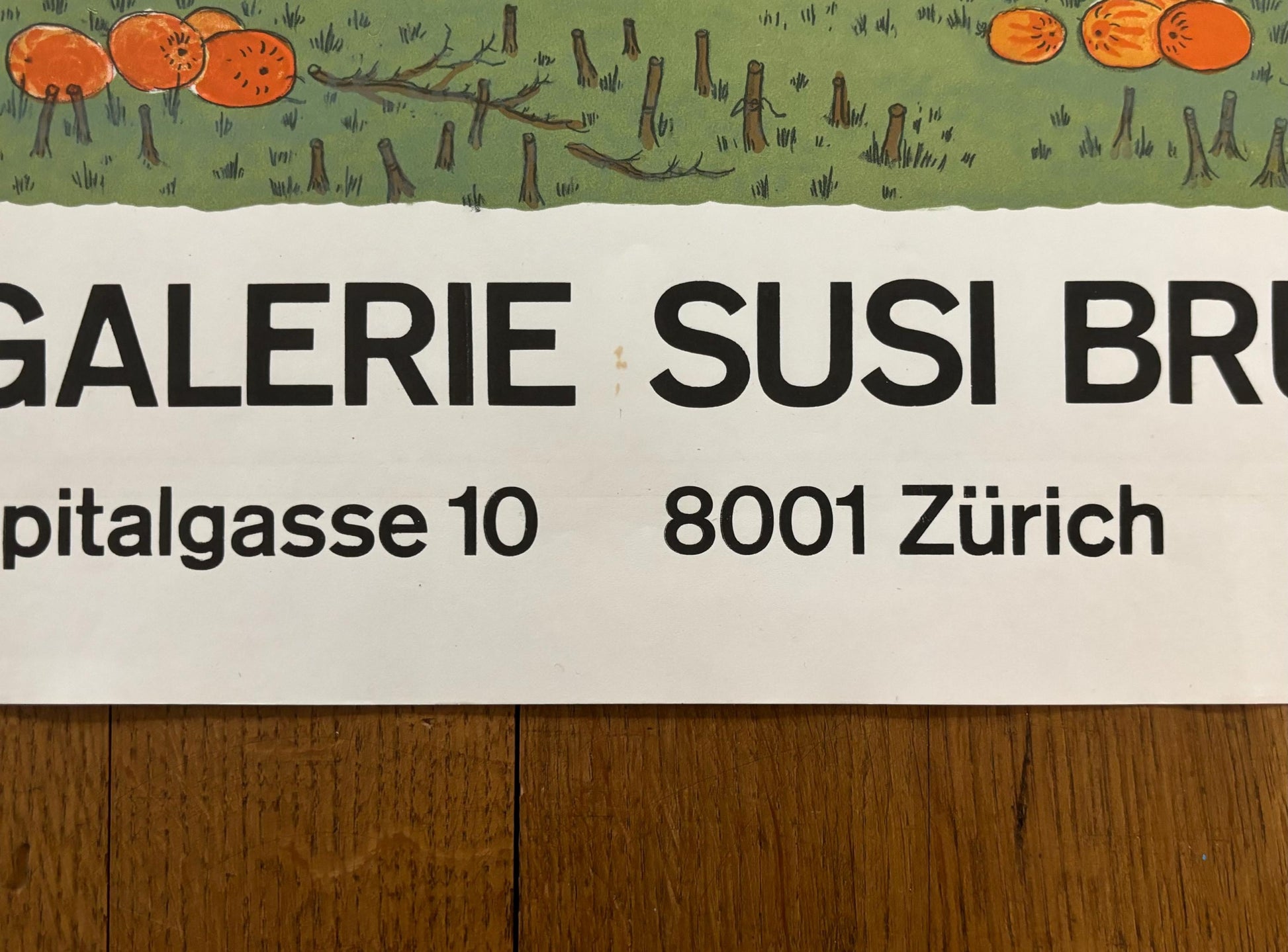 This is a beautiful silkscreen-lithography art poster by the Croatian Ivan Lacković featuring an artwork of a drawn village surrounded by a green field and advertising an exhibition at the Galerie Susi Brunner in Zurich.