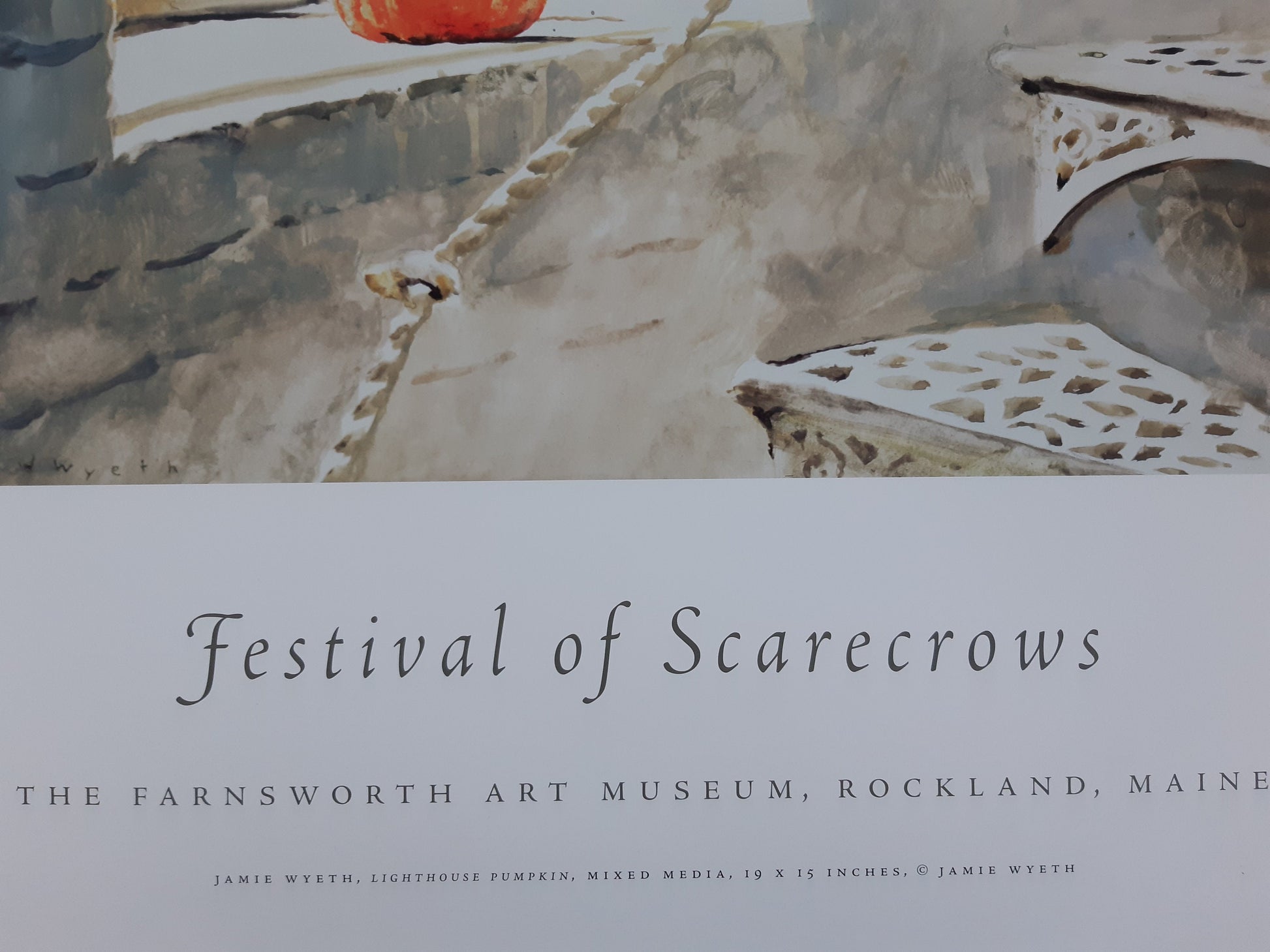 This is an original art poster, featuring the painting "Lighthouse Pumpkin" by Jamie Wyeth. It has been produced ifor theFestival of Scarecrows of the Farnsworth Art Museum in Rockland, Maine.