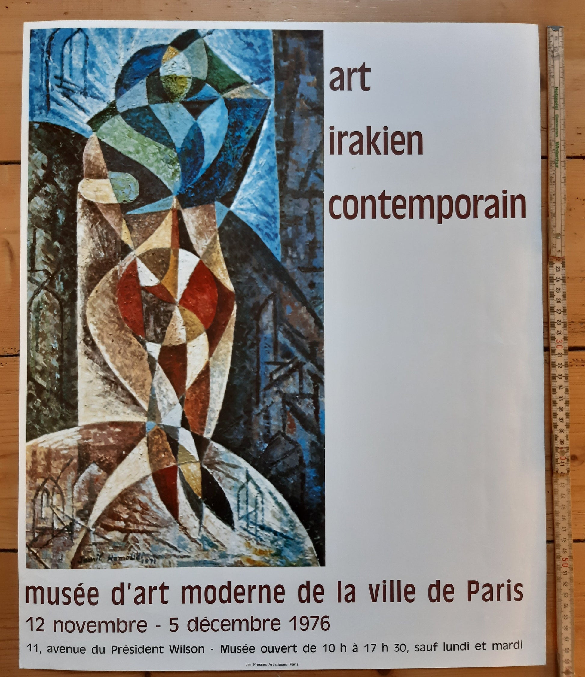 Original art poster with an artwork by Jamil Hamoudi for an exhibition about Irqui contemporary art in 1976 in Paris, France. The poster is in used but good condition with some minor signs of handling.