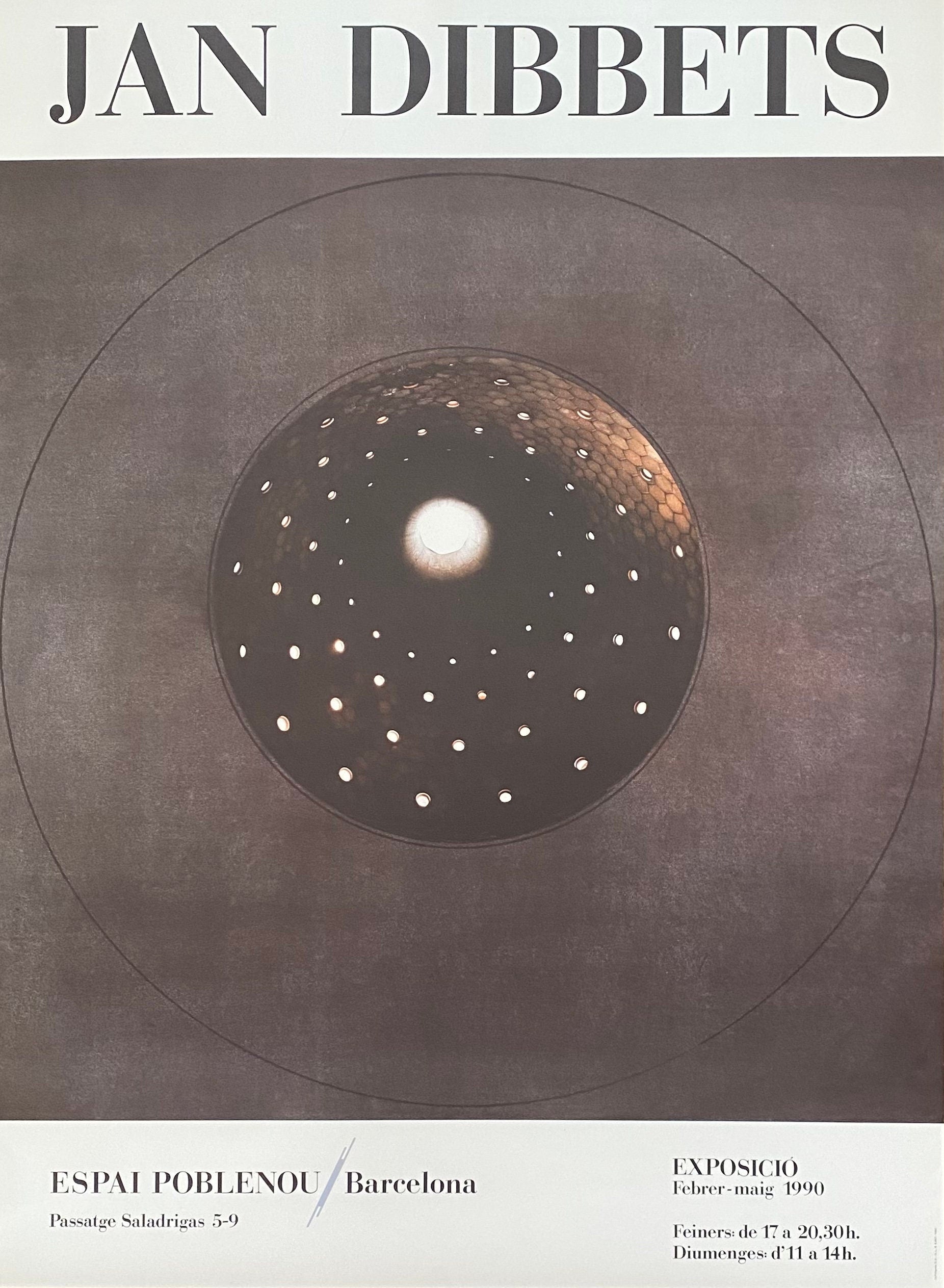 This is a beautiful art poster by Jan Dibbets featuring an artwork with black and white circular shapes in the center and advertising an exhibition in Barcelona in 1990.