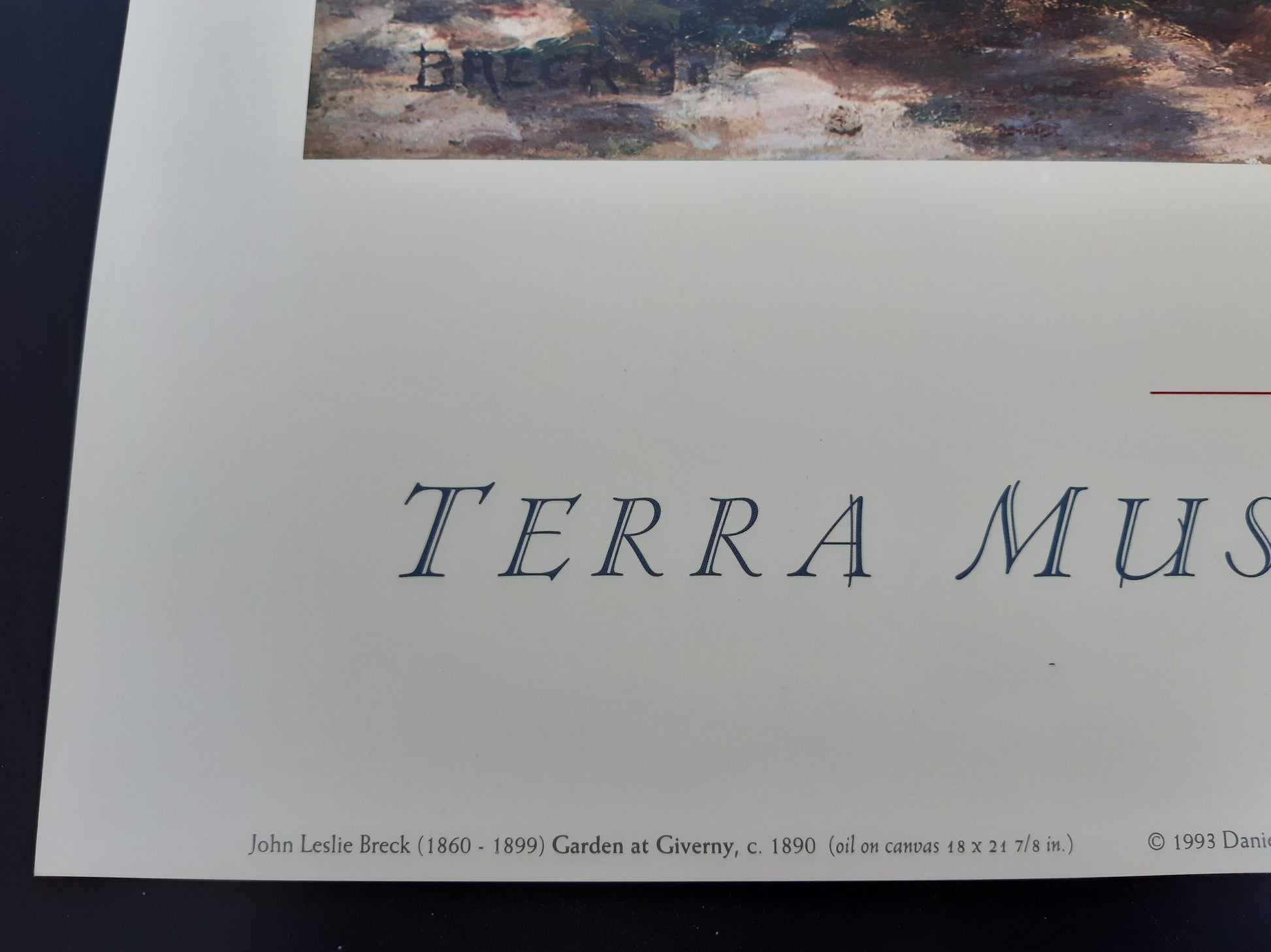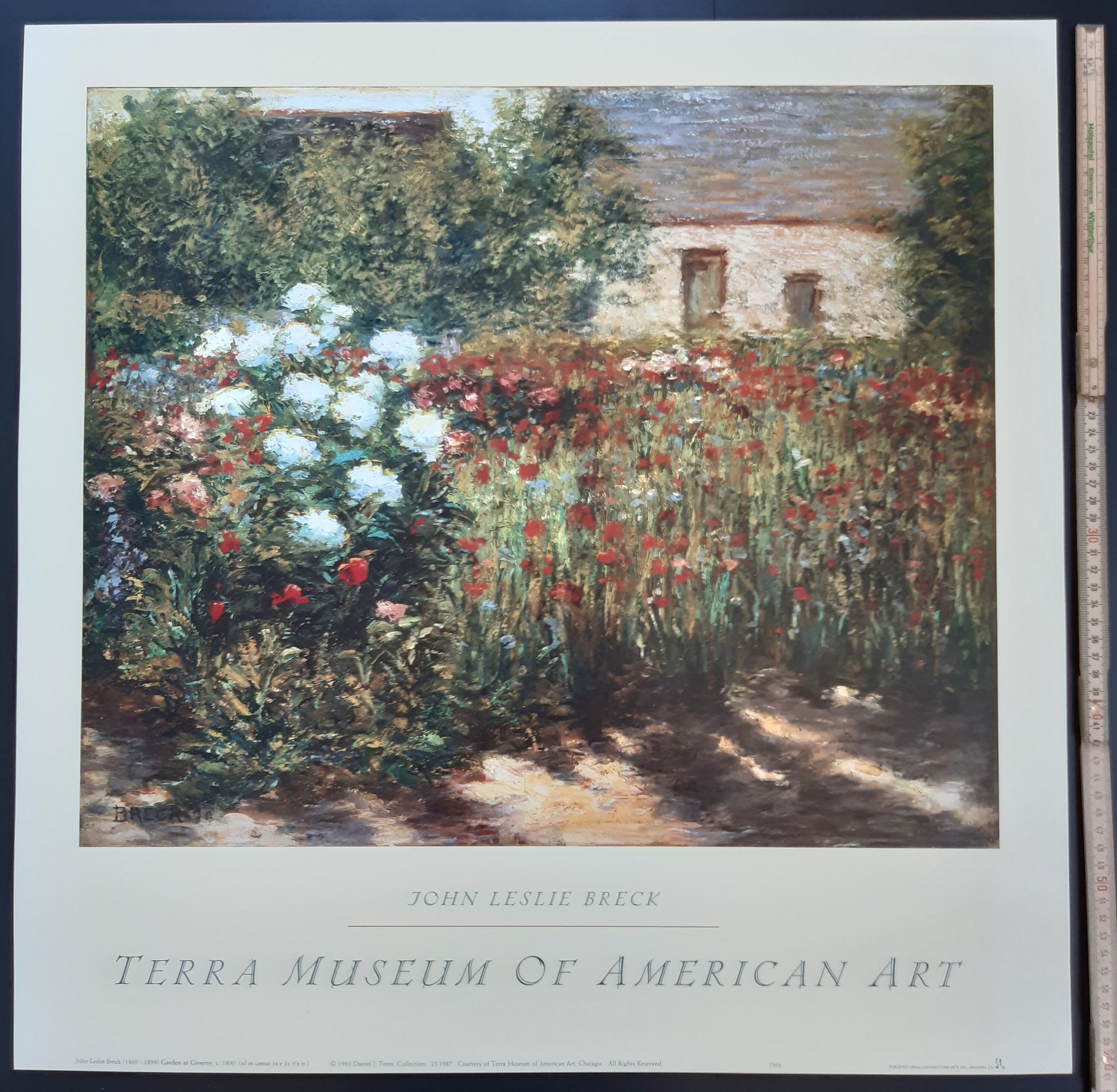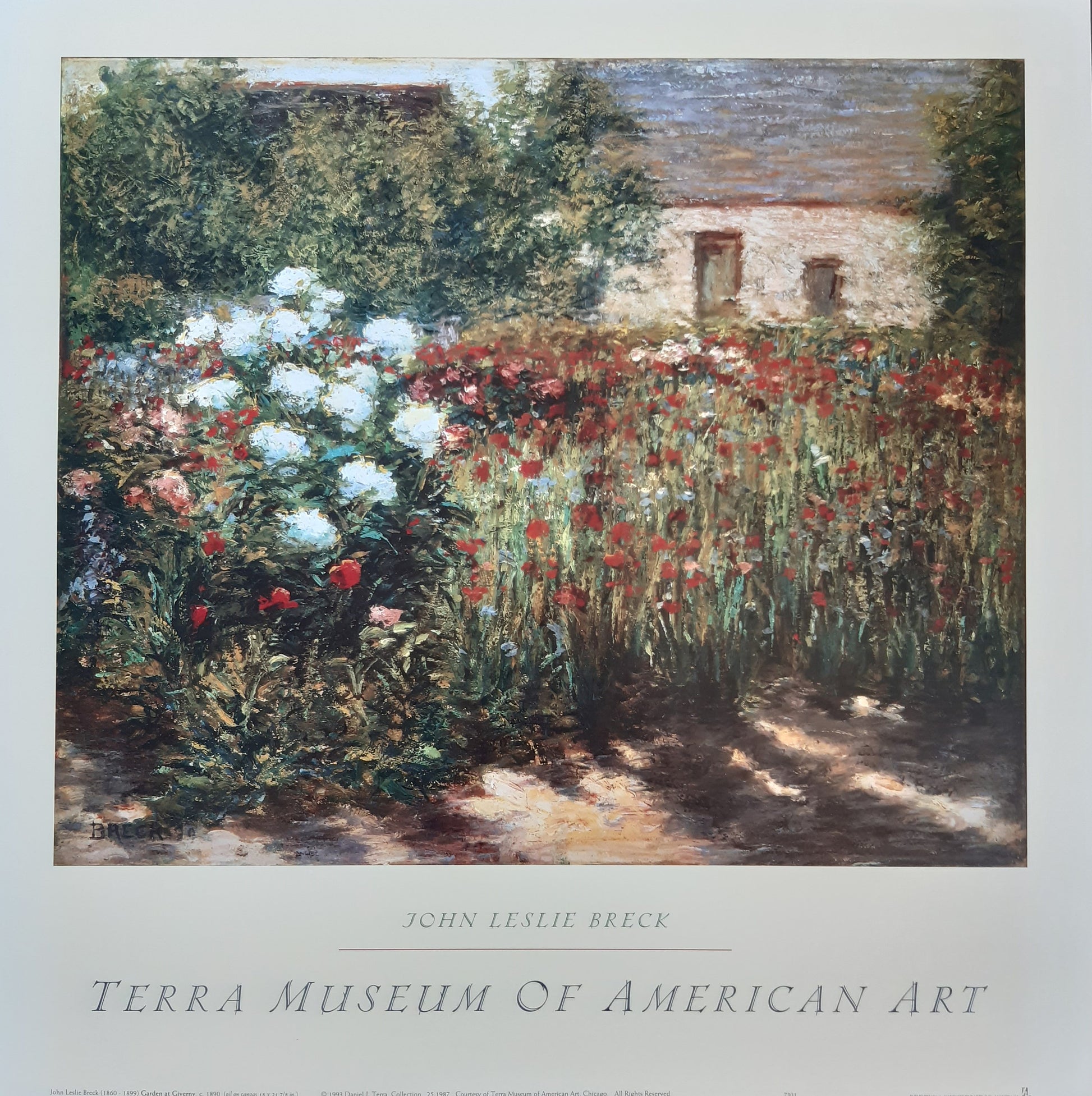 This is an original art print featuring the painting "Garden at Giverny", painted 1890 by John Leslie Breck. The poster has been published 1998 by the Terra Museum in Chicago. It is in near mit condition .