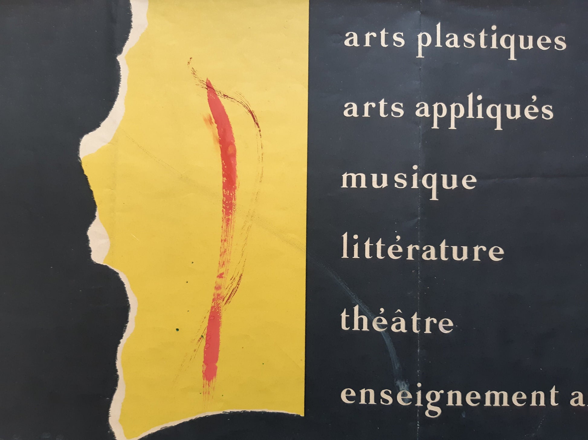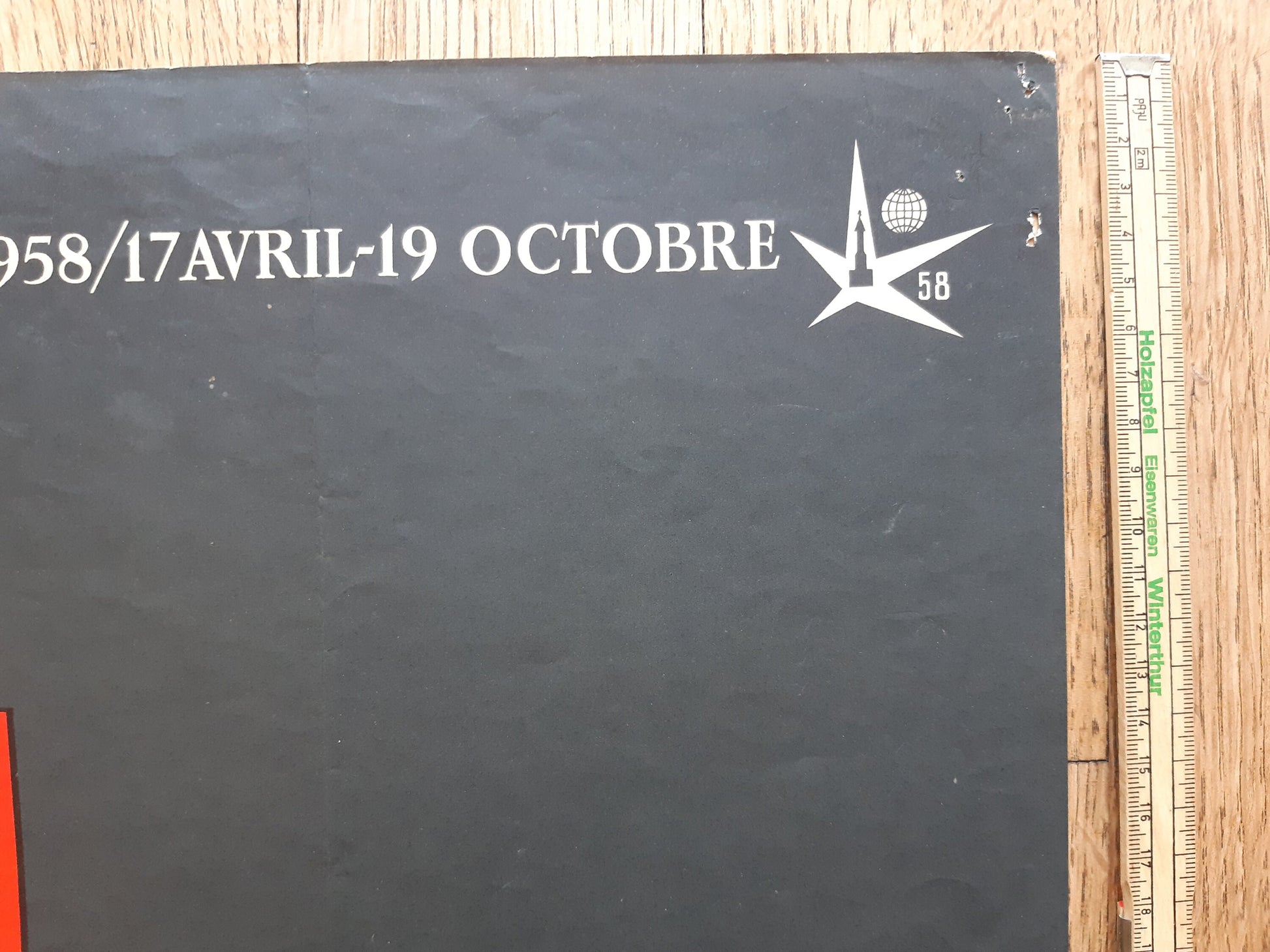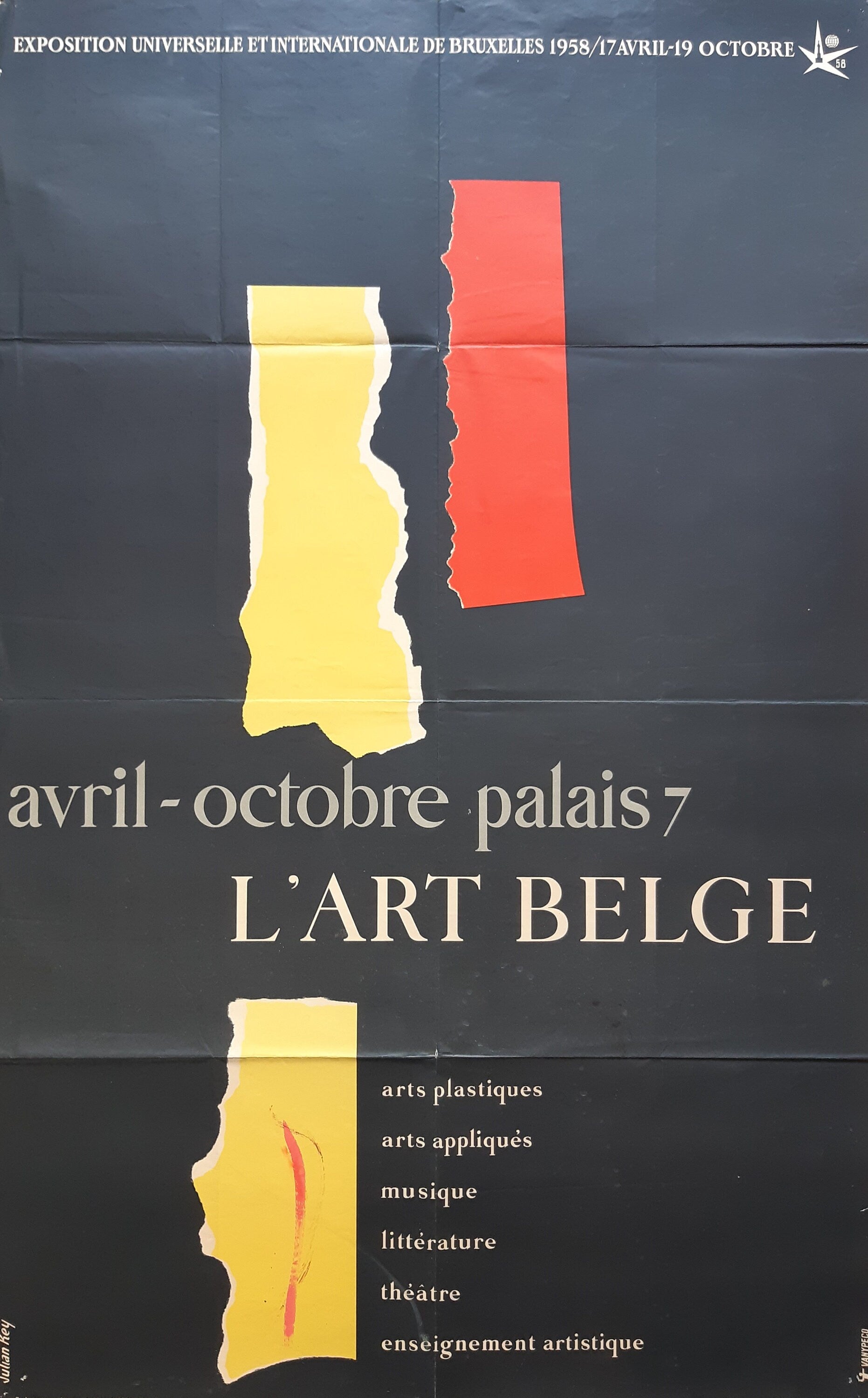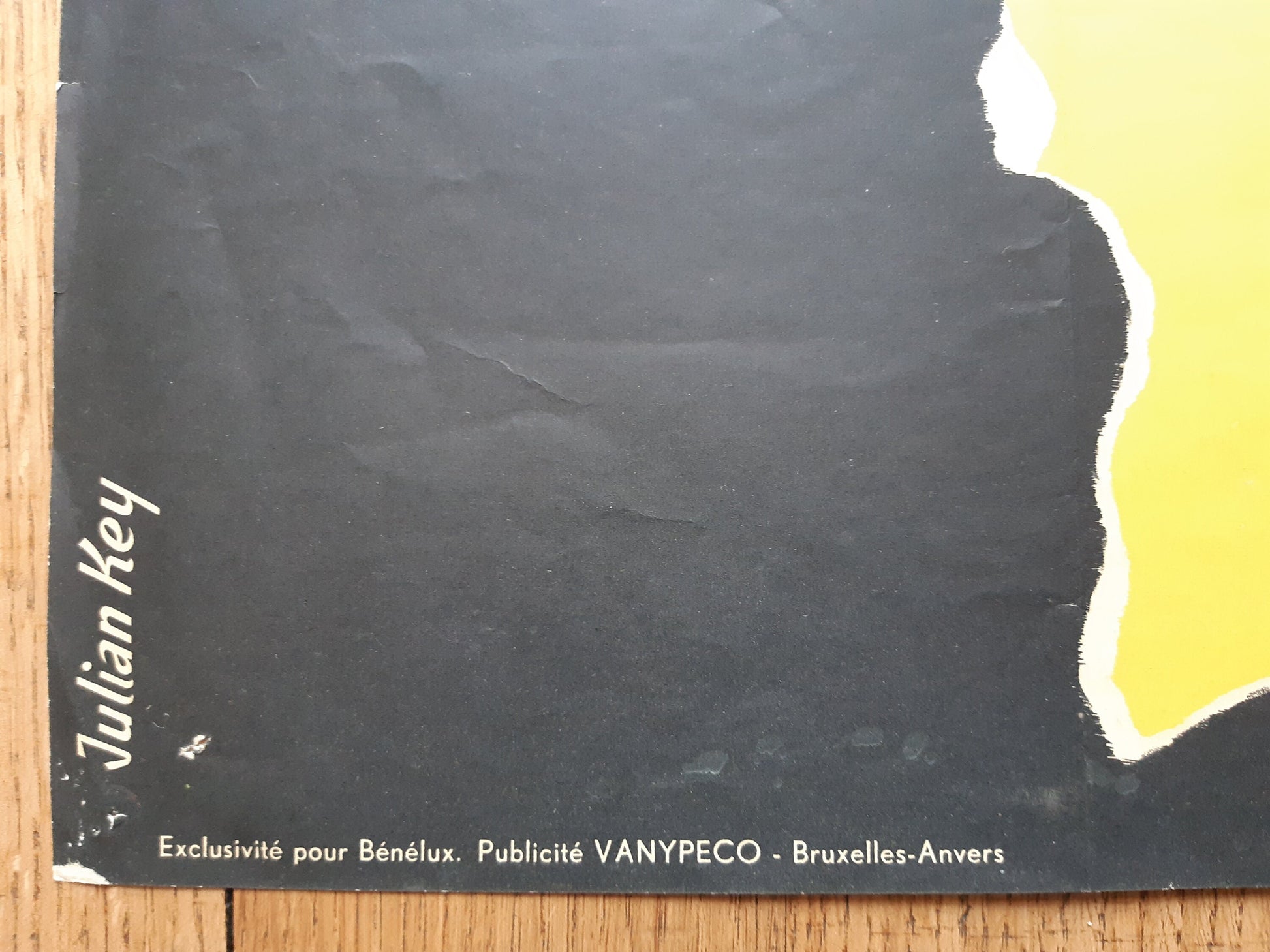 This is an original art exhibition poster advertising an exhibition in Bruxelles (Belgium) in 1958. The poster is in folded condition with several flaws. Especially some additional color in the lower yellow part. Pinholes. The poster has been designed by Julian key, a Belgian poster designer, born 1930.