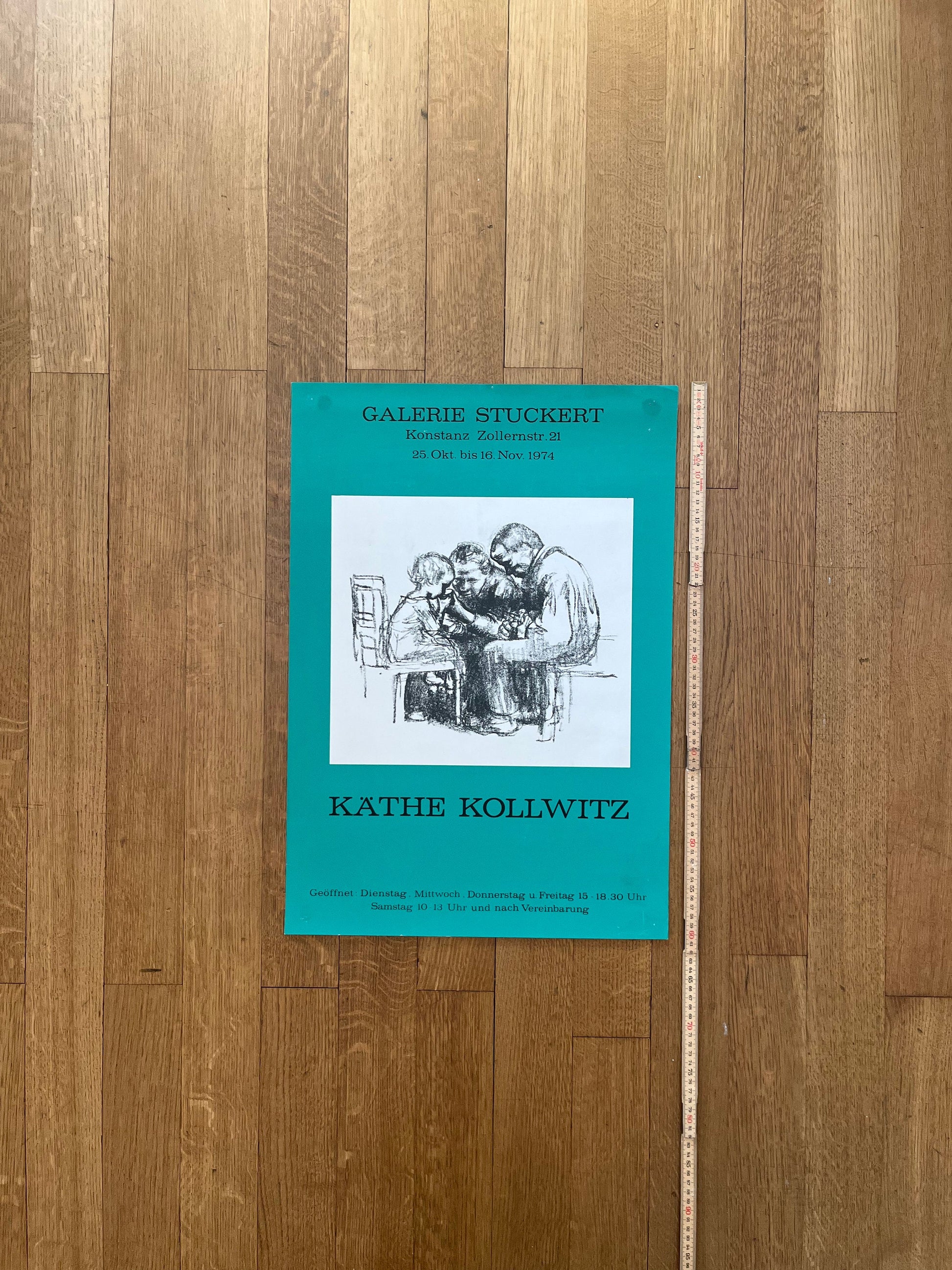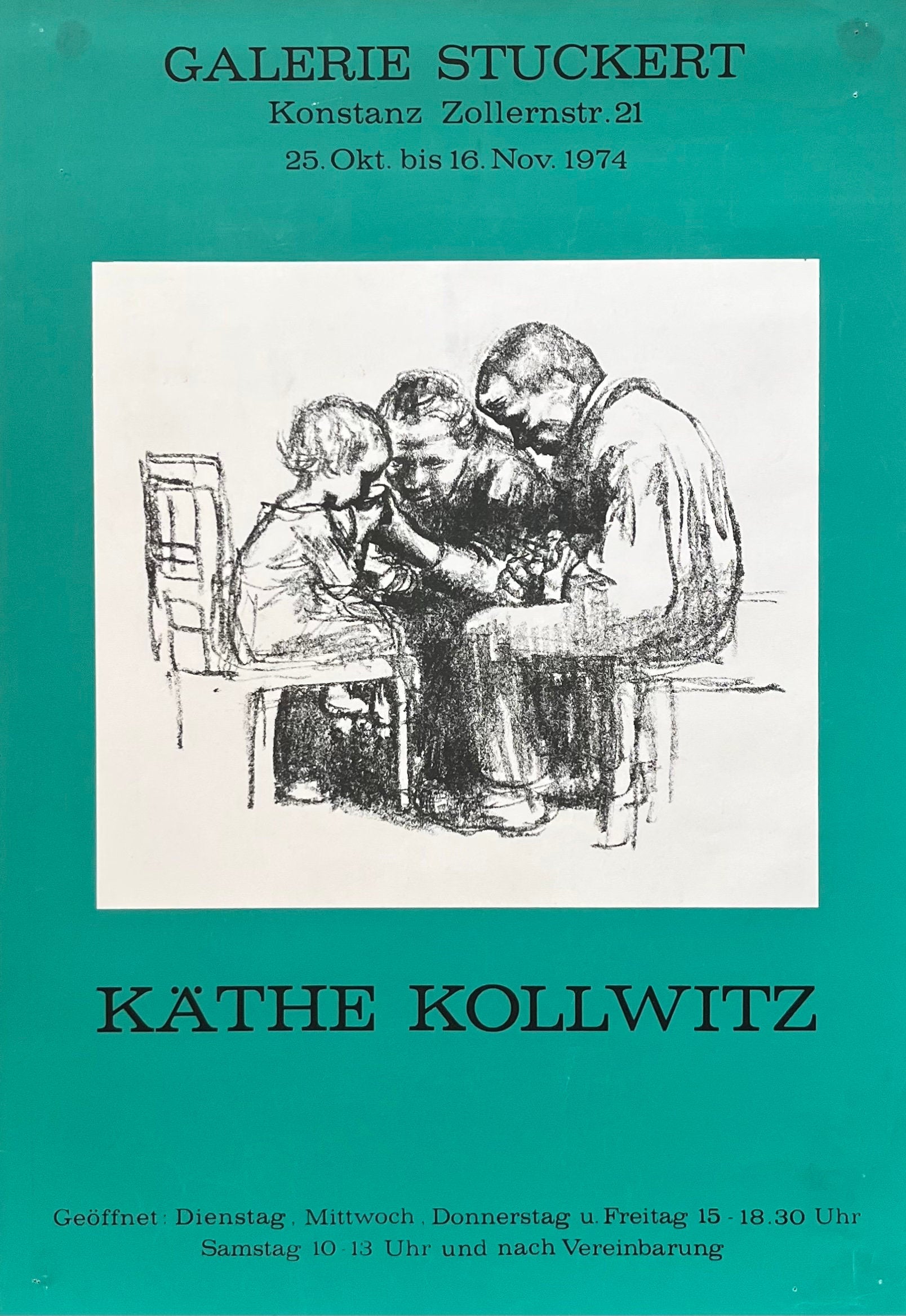 This is an original silkscreen-lithography poster by Käthe Kollwitz featuring an artwork with two adults and a child and advertising an exhibition at the Galerie Stuckert in Germany in 1974.