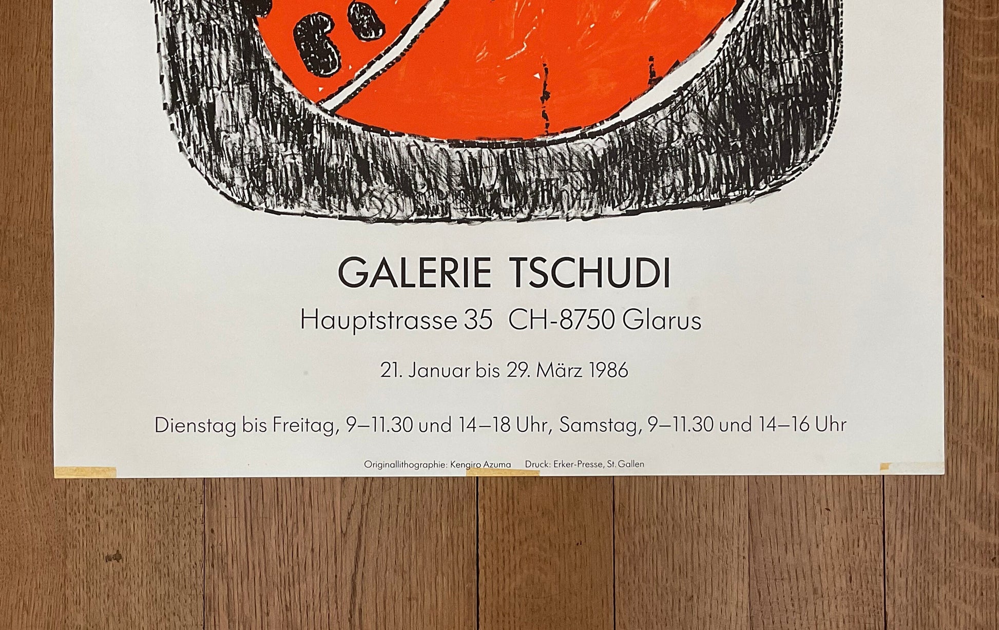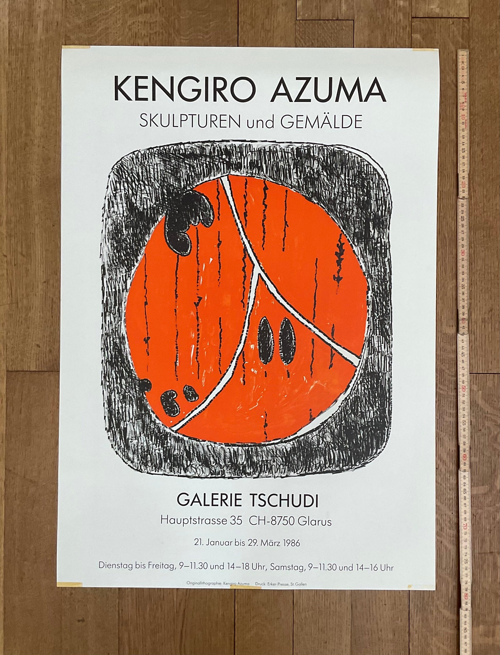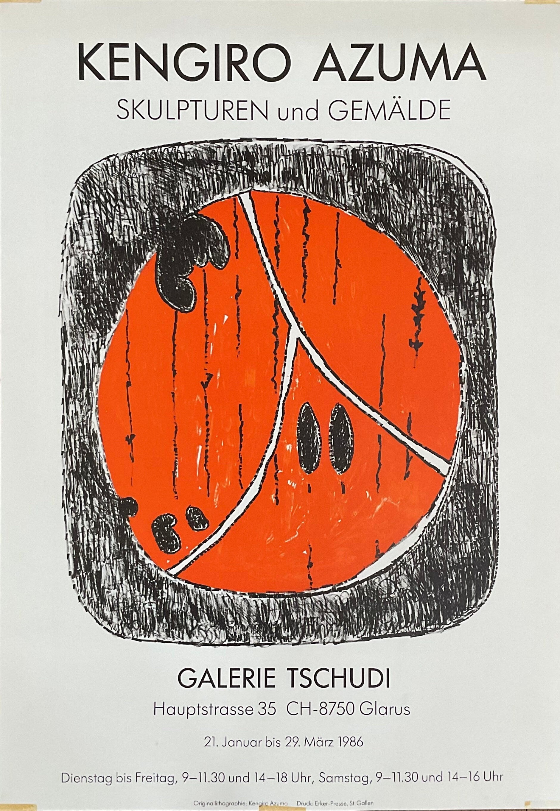 This is an original silkscreen-lithography art poster by Kengiro Azuma advertising the exhibition "Sculptures - Peintures" at the Galerie Tschudi in Glarus in 1986.