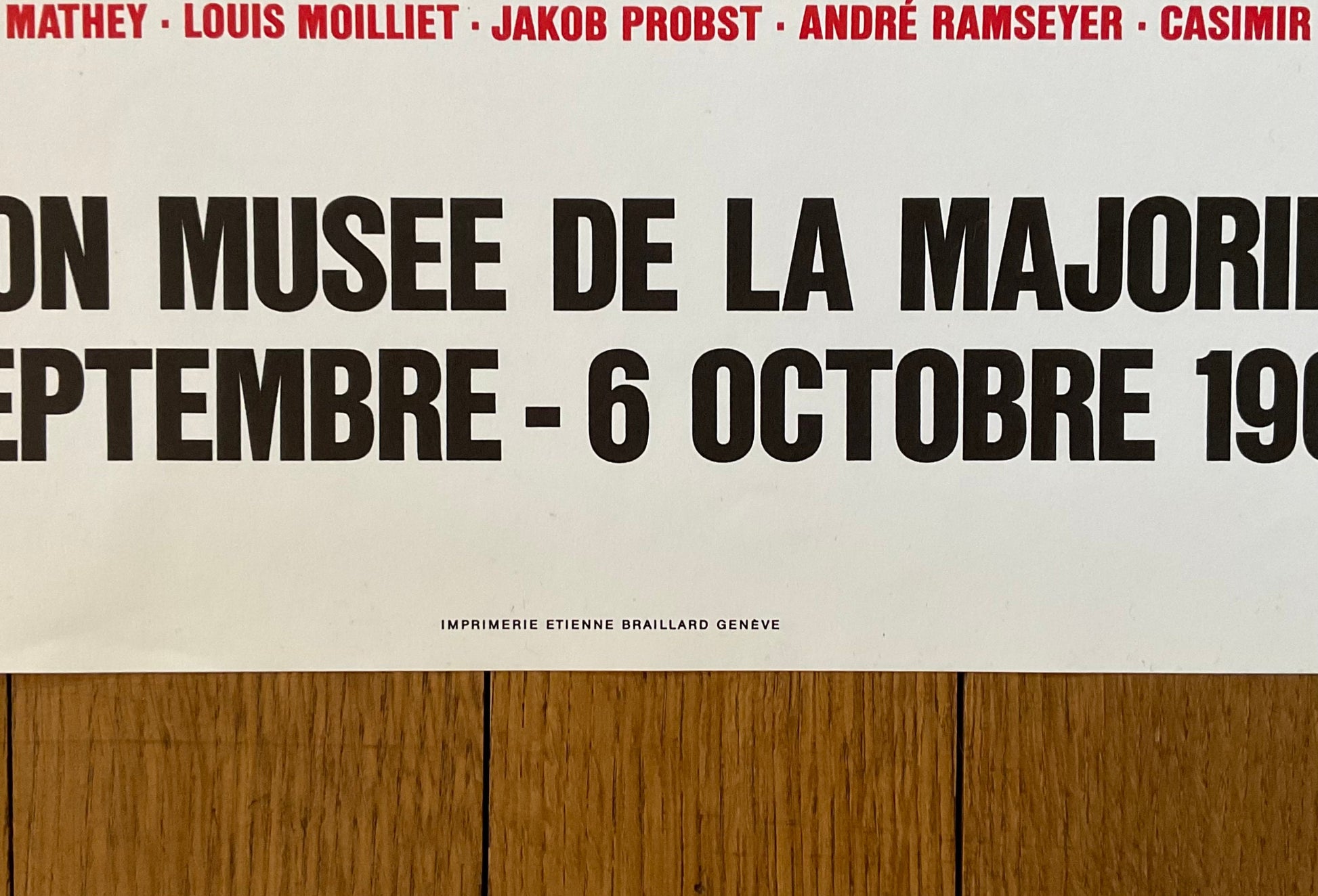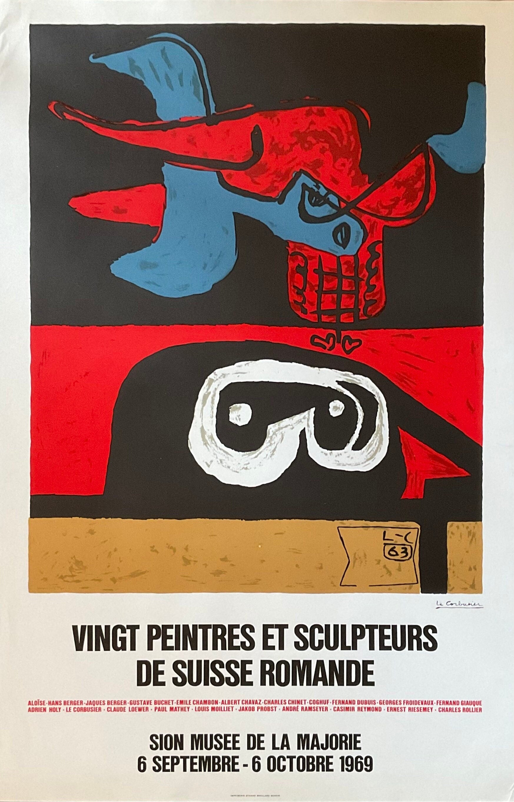 Beautiful silkscreen-lithography poster by the famous Le Corbusier advertising an exhibition in Sion, Switzerland in 1969. The poster is in good condition with signs of handling along the borders and knitters at the corner.