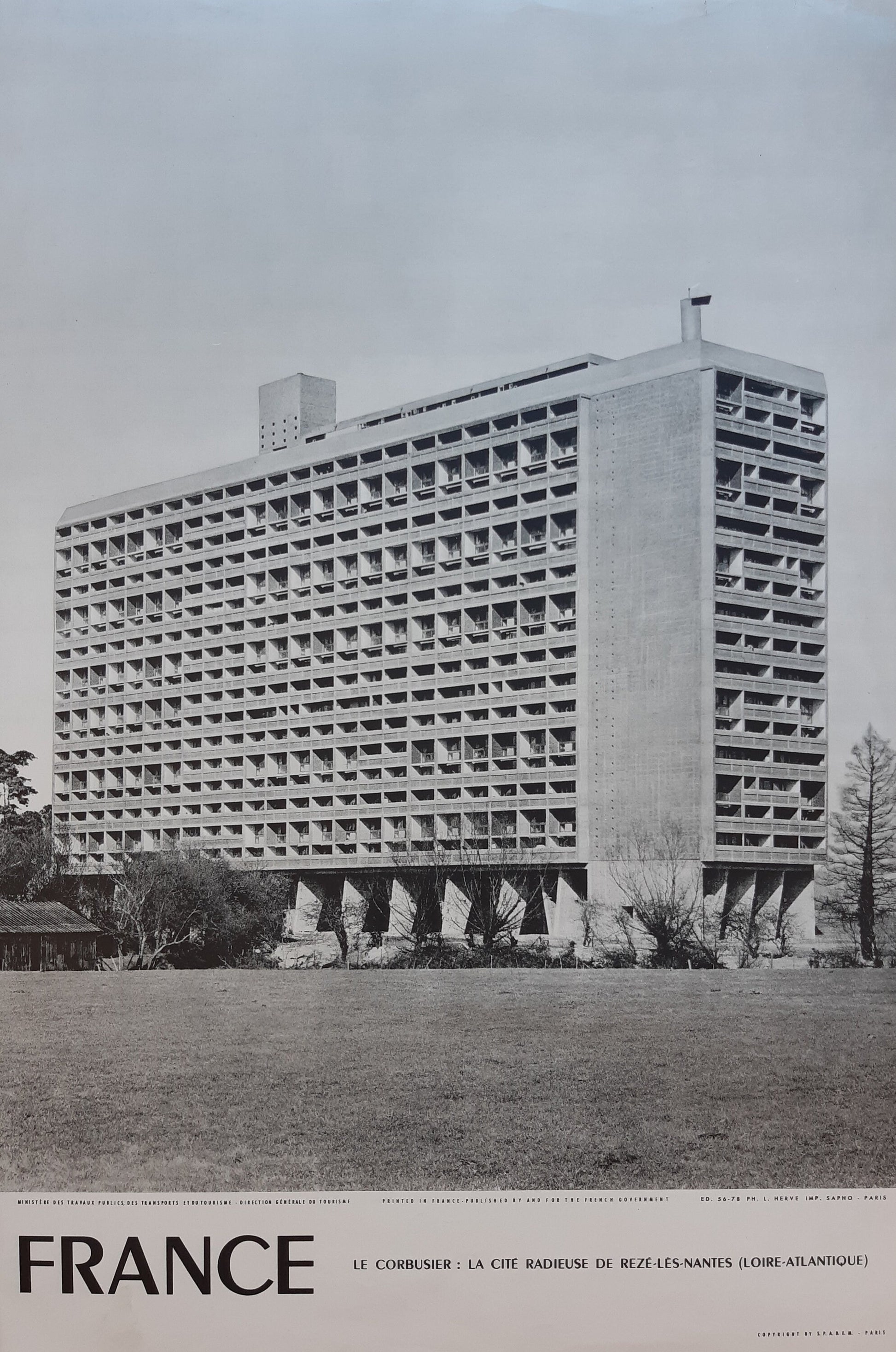 This is a vintage art poster advertising architecture in France. The building on the poster is the "Maison radieuse" built 1953 - 1955 by Le Corbusier .This poster is a good exemple for his fantastic and innovative architecture