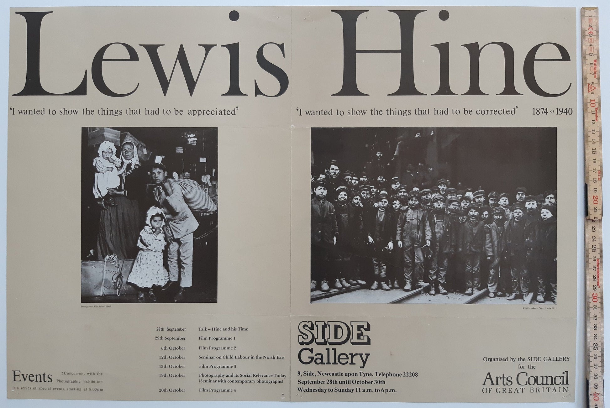 This is an original art poster advertising an exhibition by Lewis Hine at the SIDE Gallery in Newcastle upon Tyne.